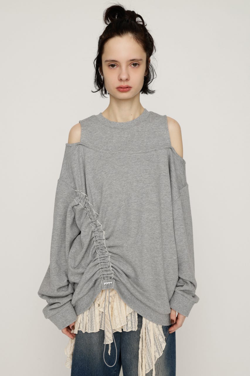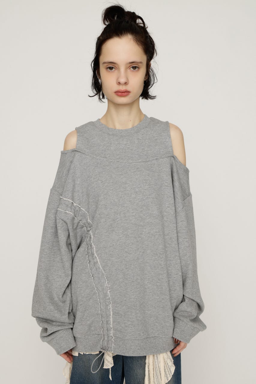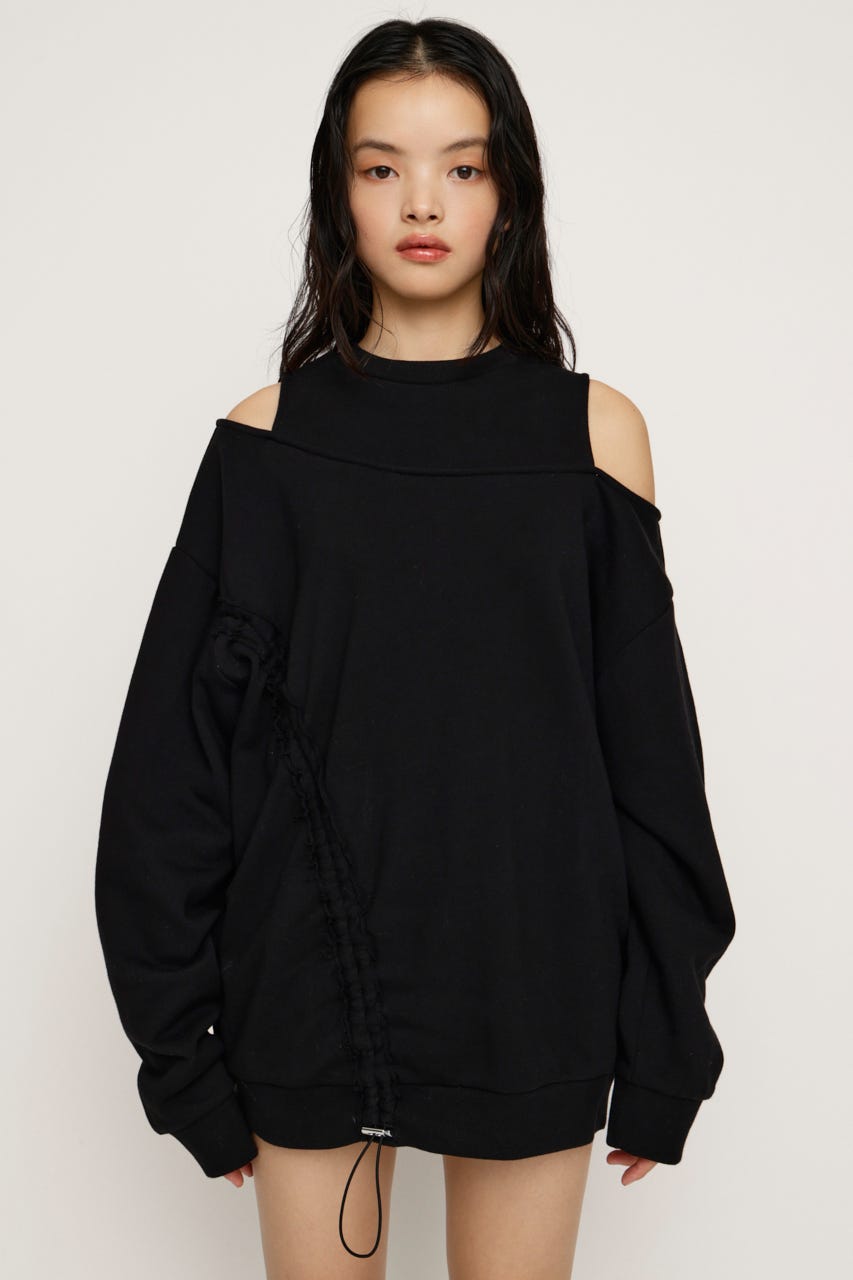 左右アシンメトリーに開いたオープンショルダーデザインが、程よい肌見せを叶えるスウェットトップスです。