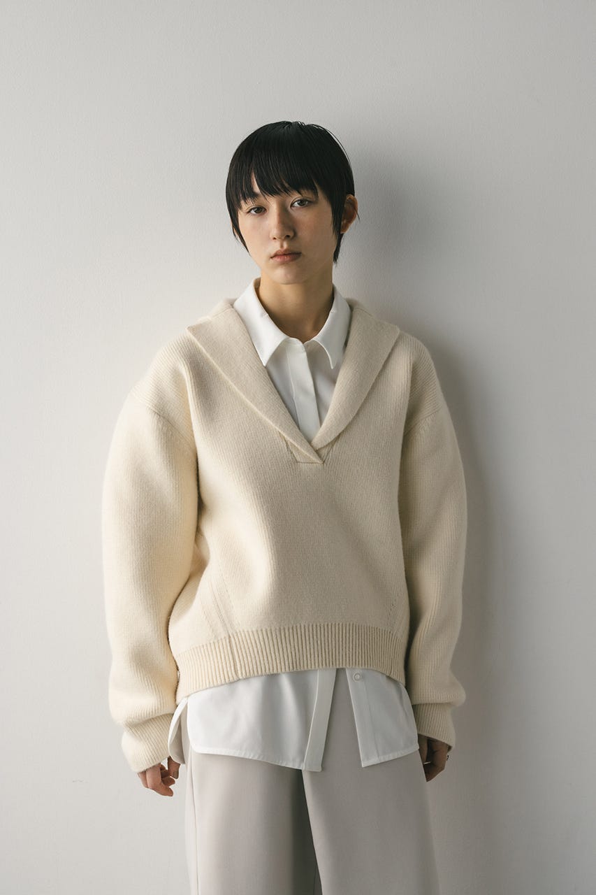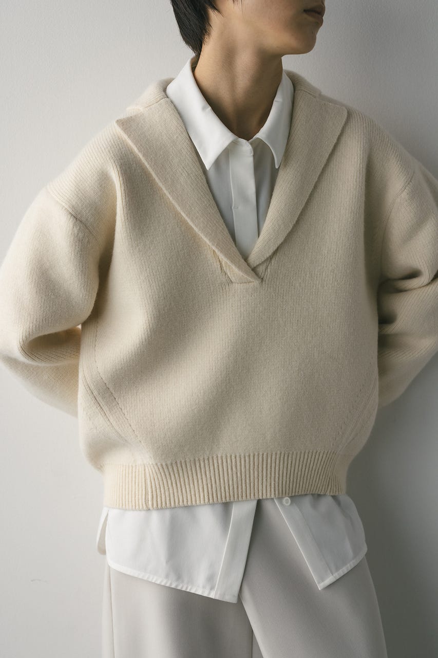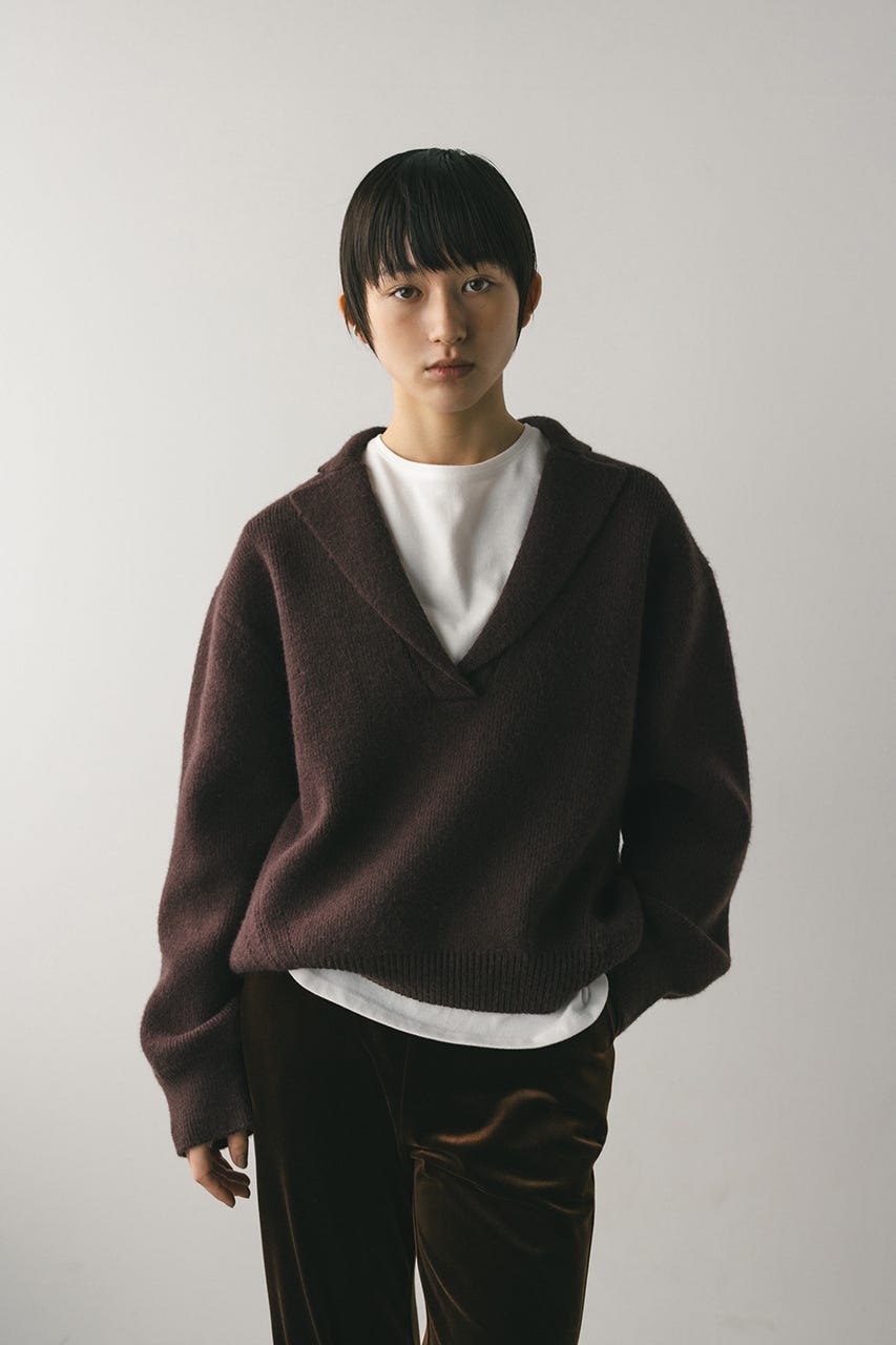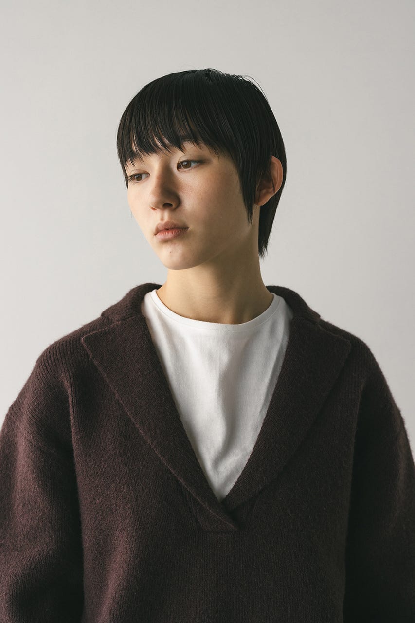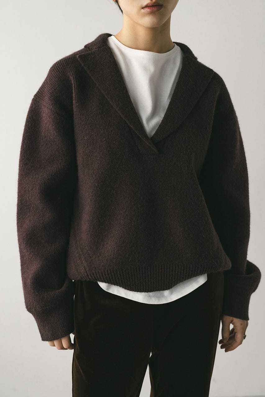 前下がりが深めにあいた抜け感のあるマニッシュなテーラーカラーニット。