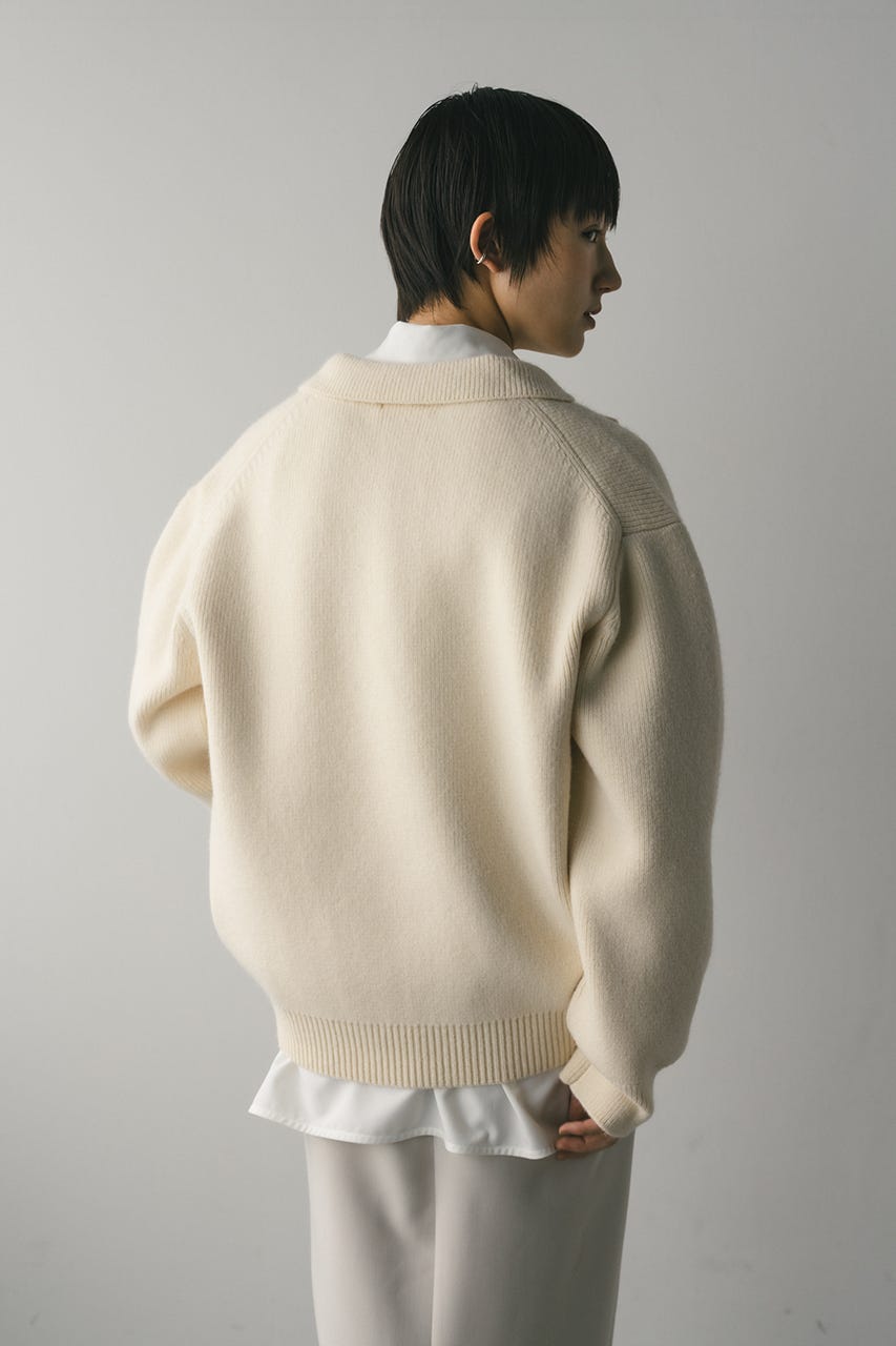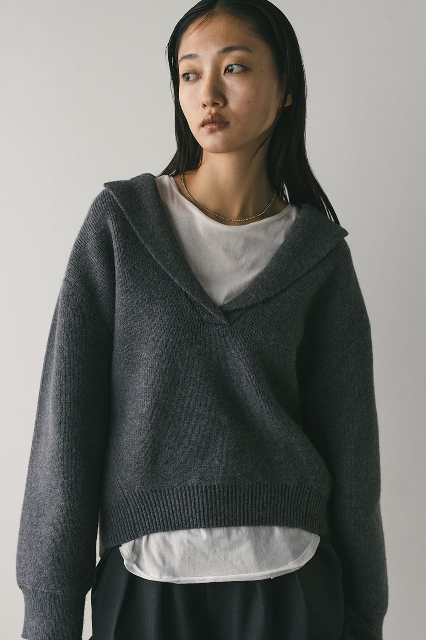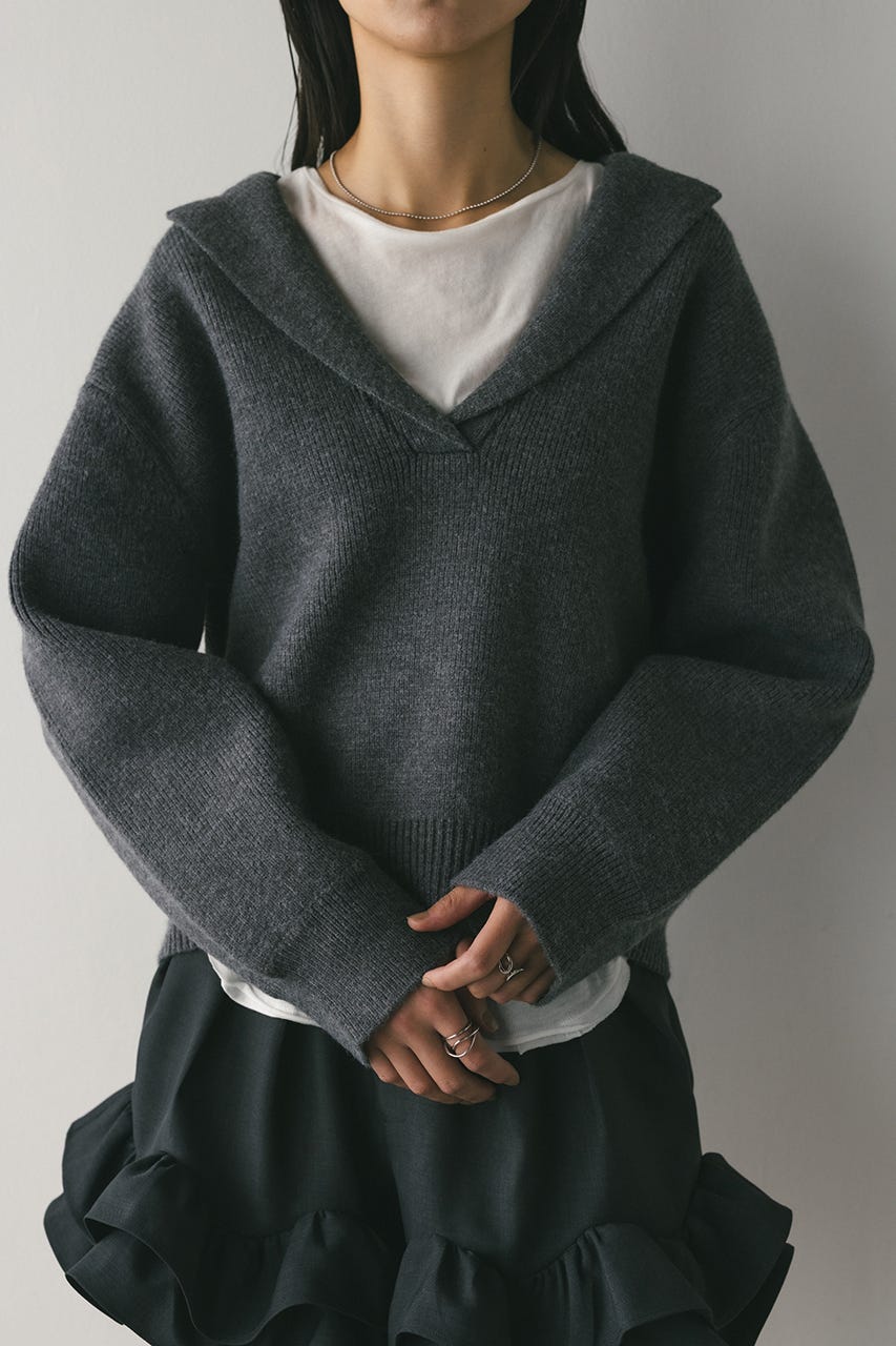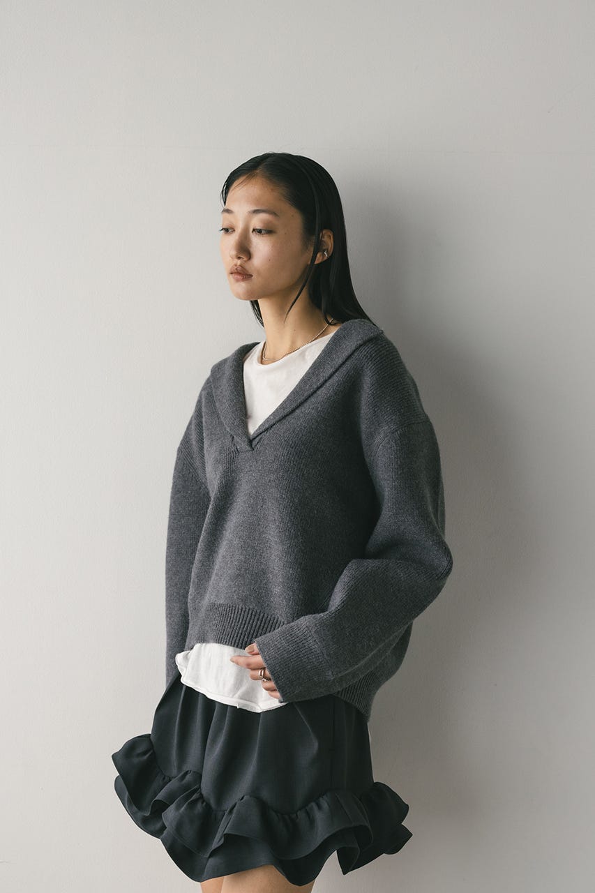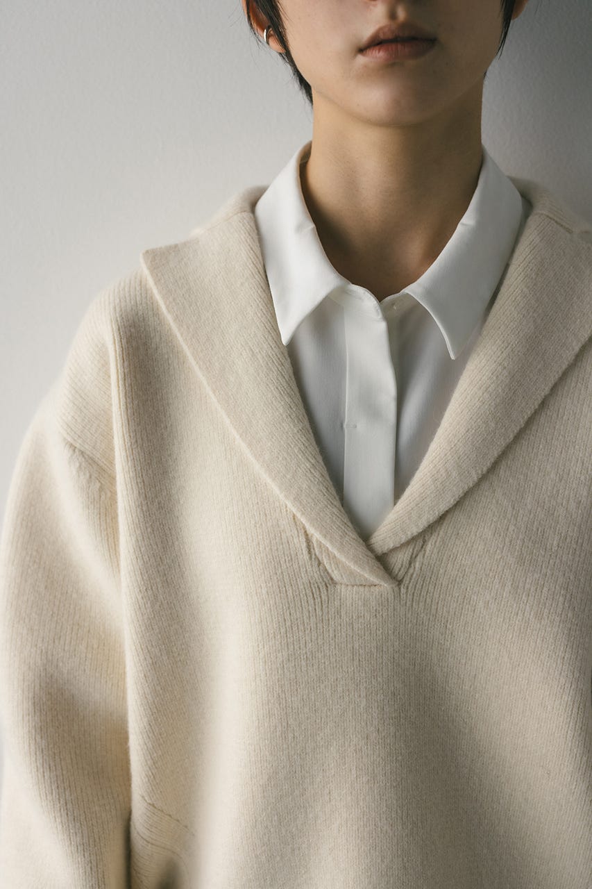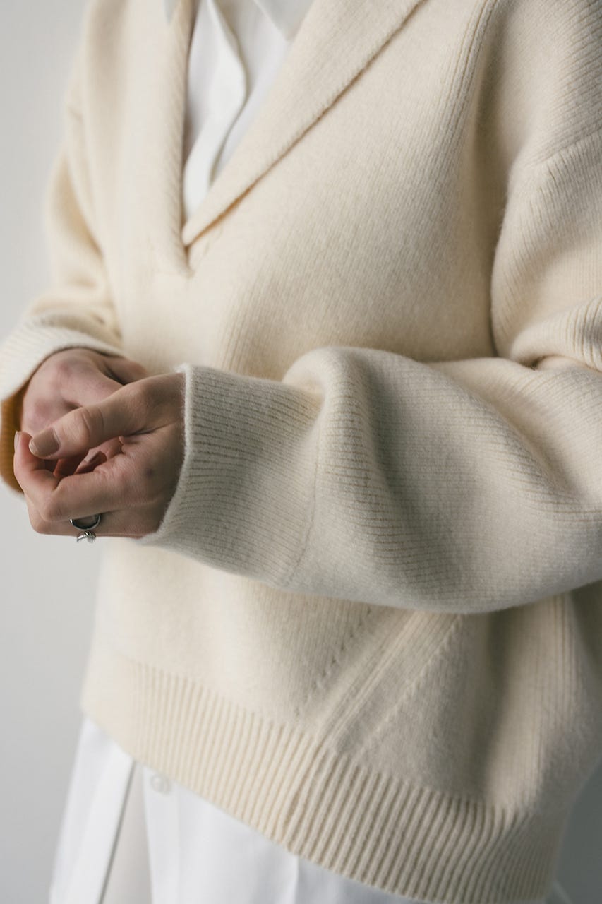 前下がりが深めにあいた抜け感のあるマニッシュなテーラーカラーニット。