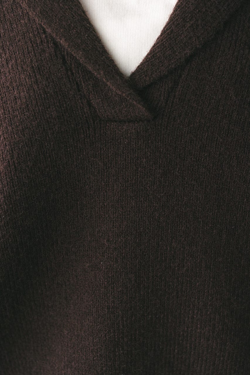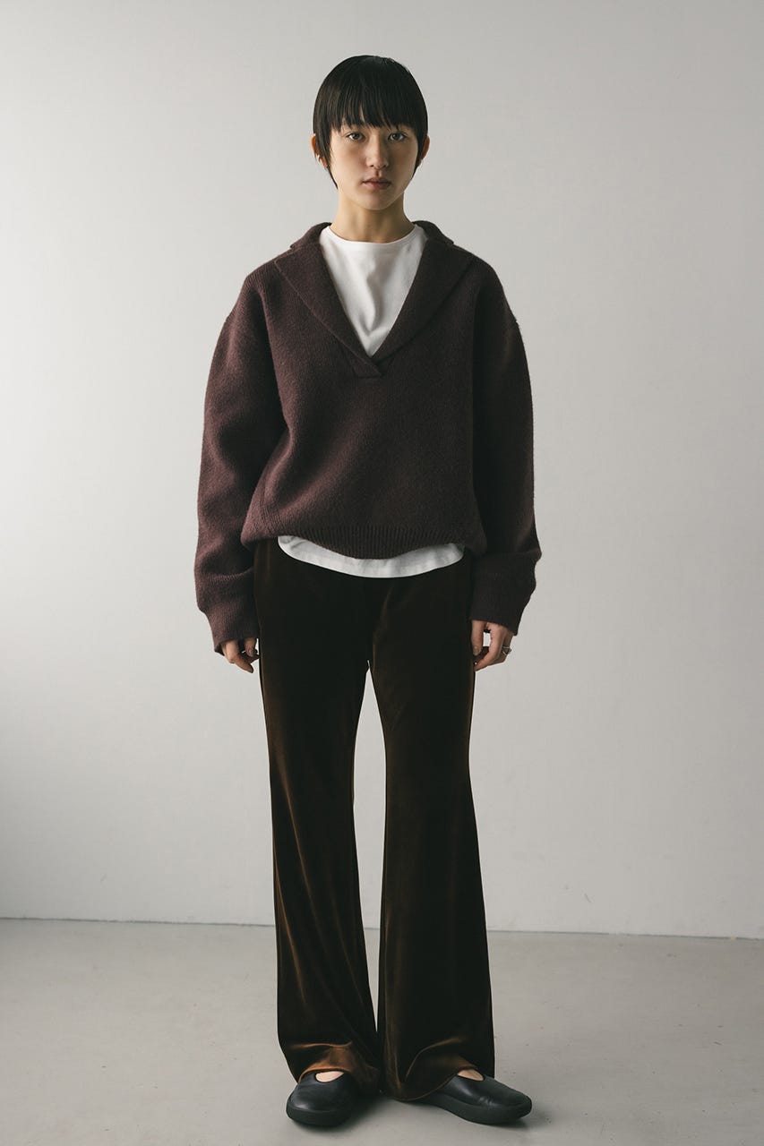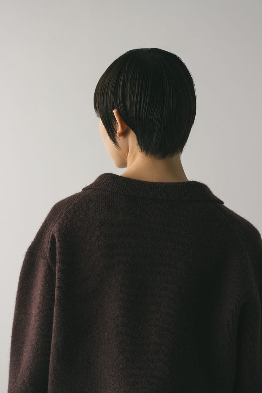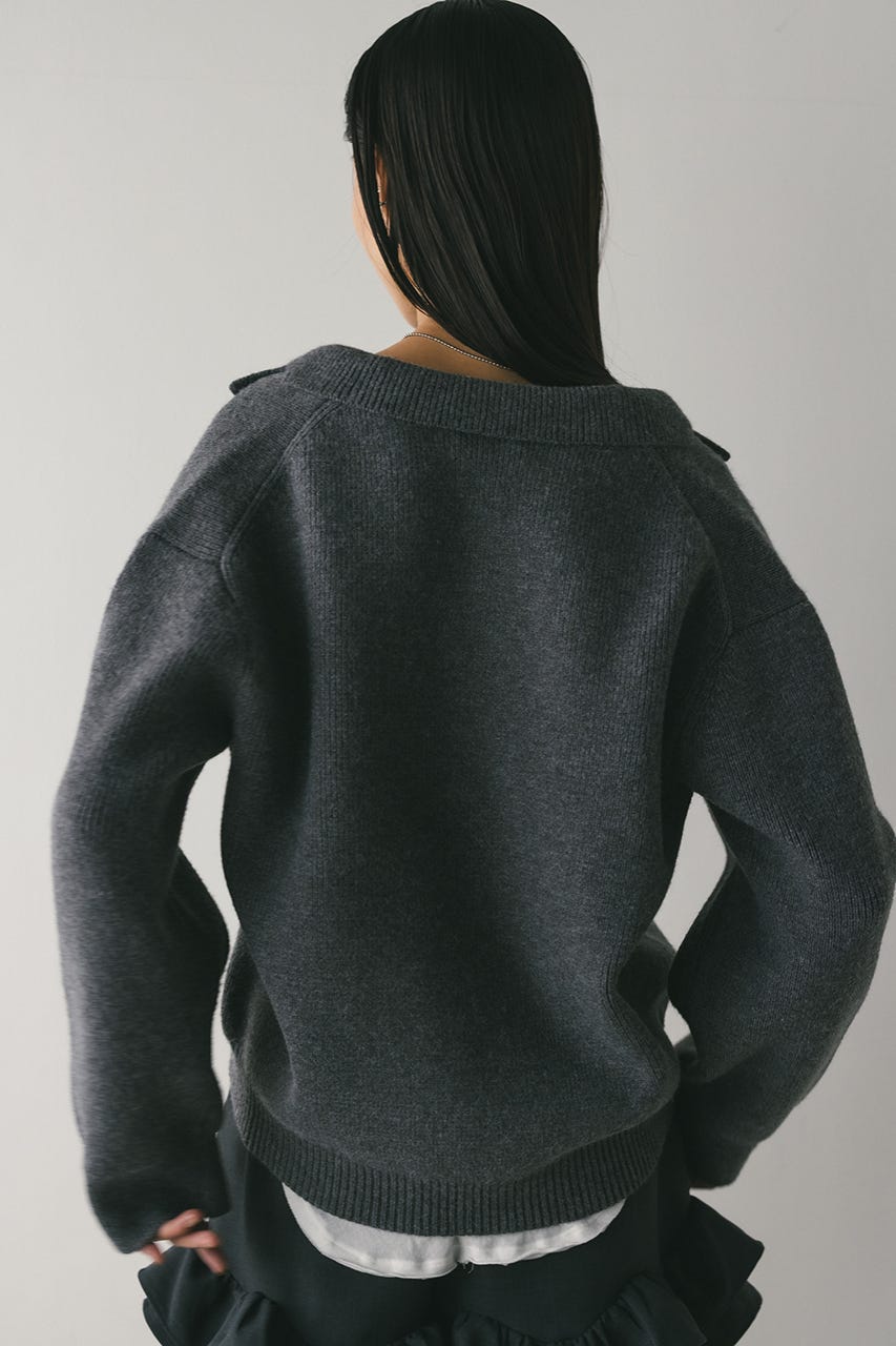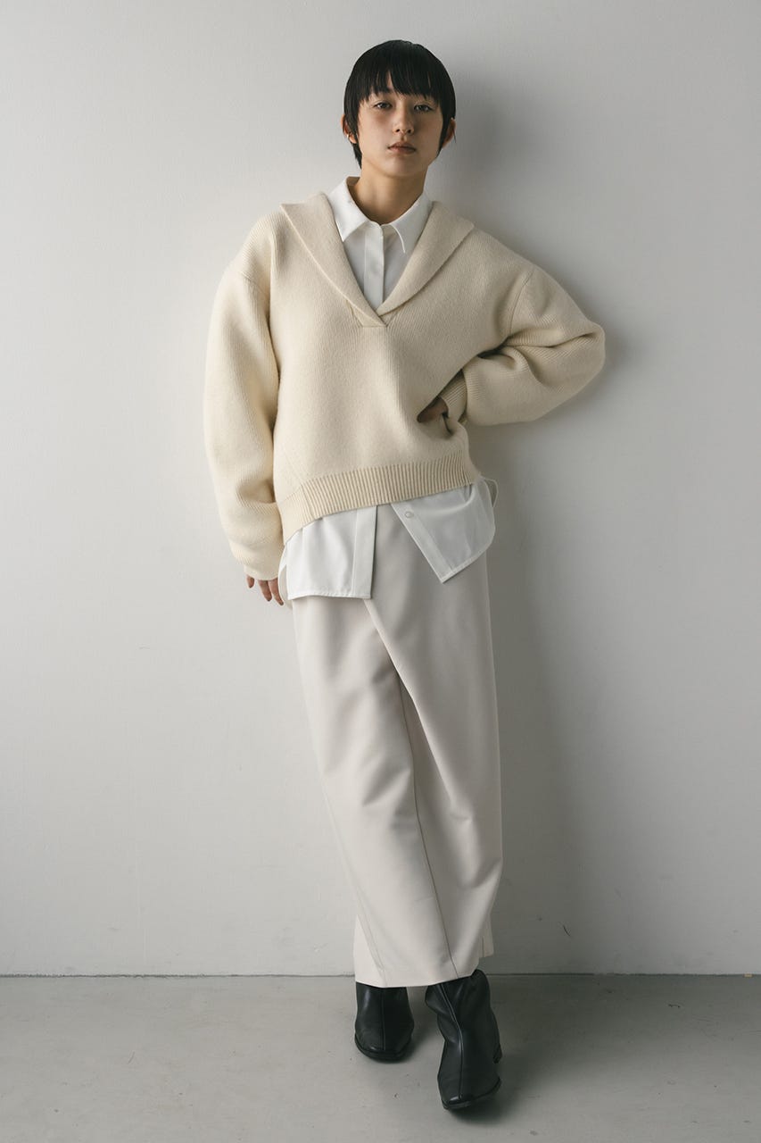 前下がりが深めにあいた抜け感のあるマニッシュなテーラーカラーニット。