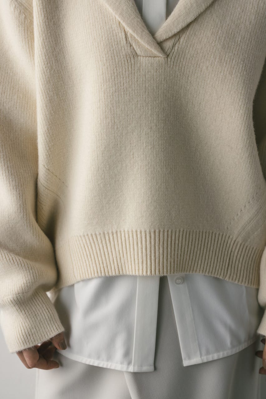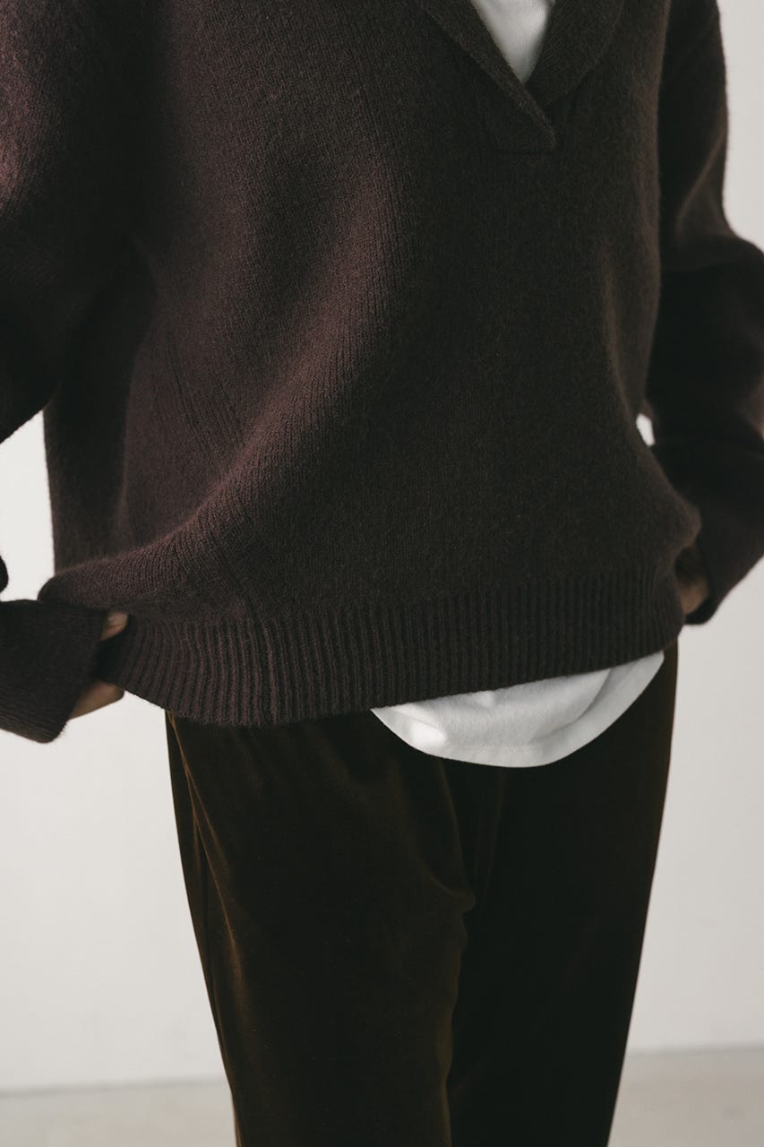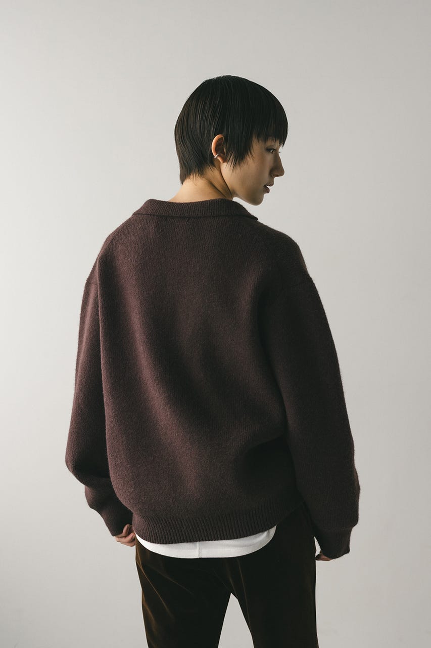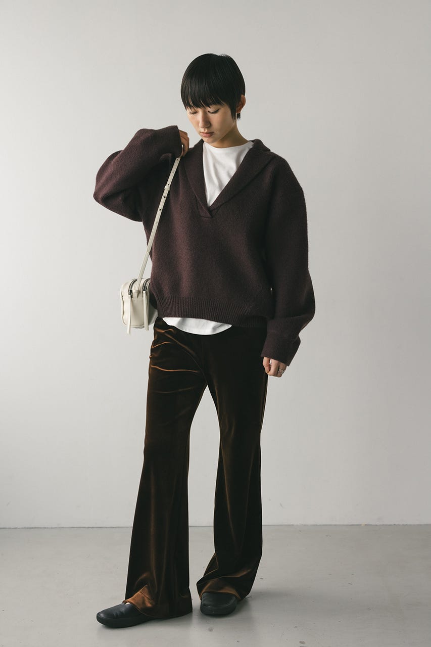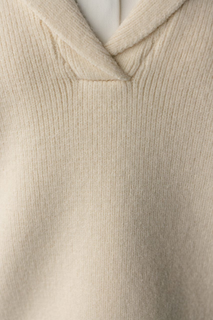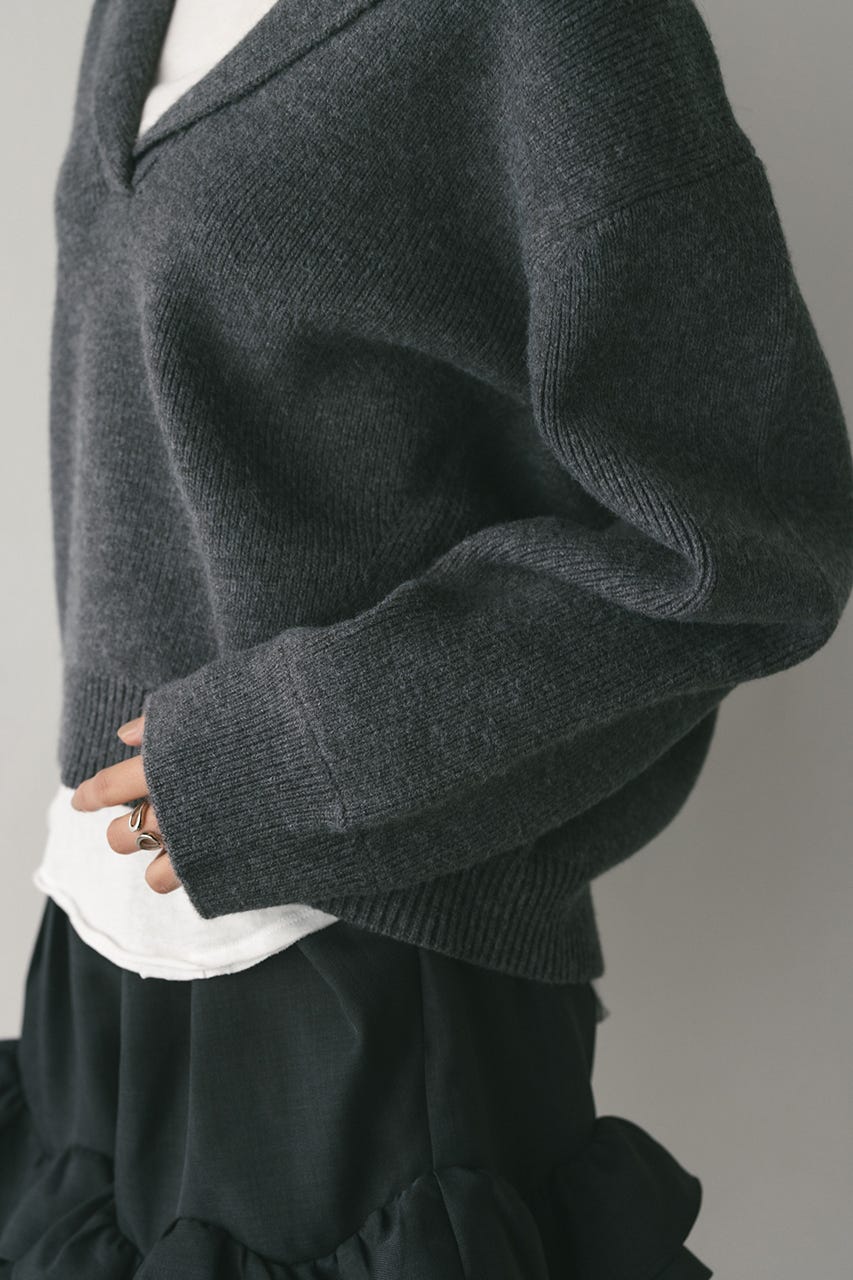 前下がりが深めにあいた抜け感のあるマニッシュなテーラーカラーニット。
