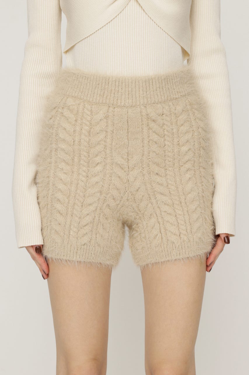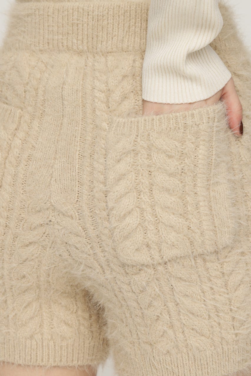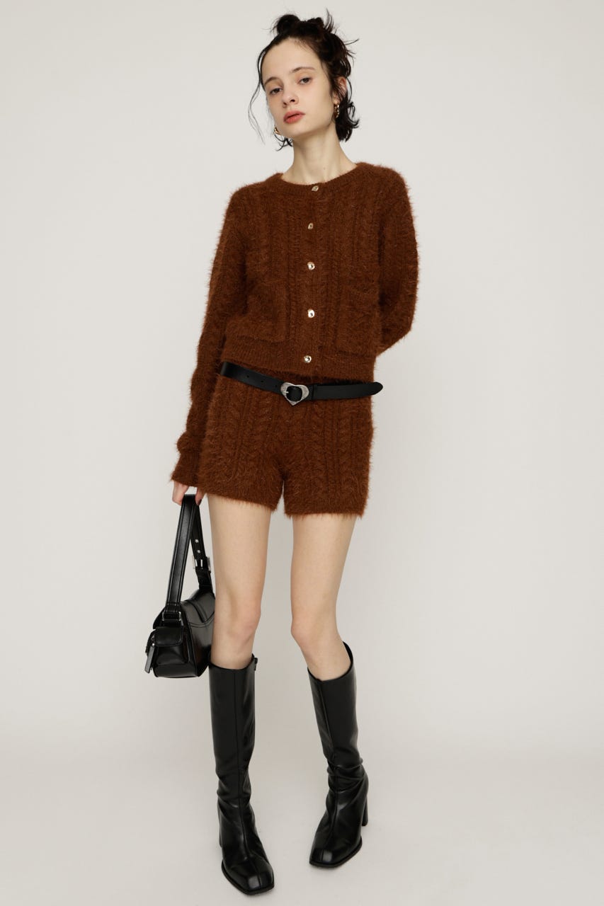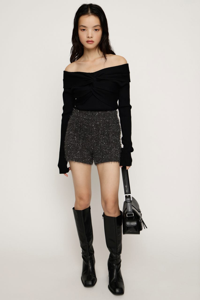 毛足のあるシャギー素材にラメ糸をミックスした、シーズンムードを高めるニットショートパンツ。