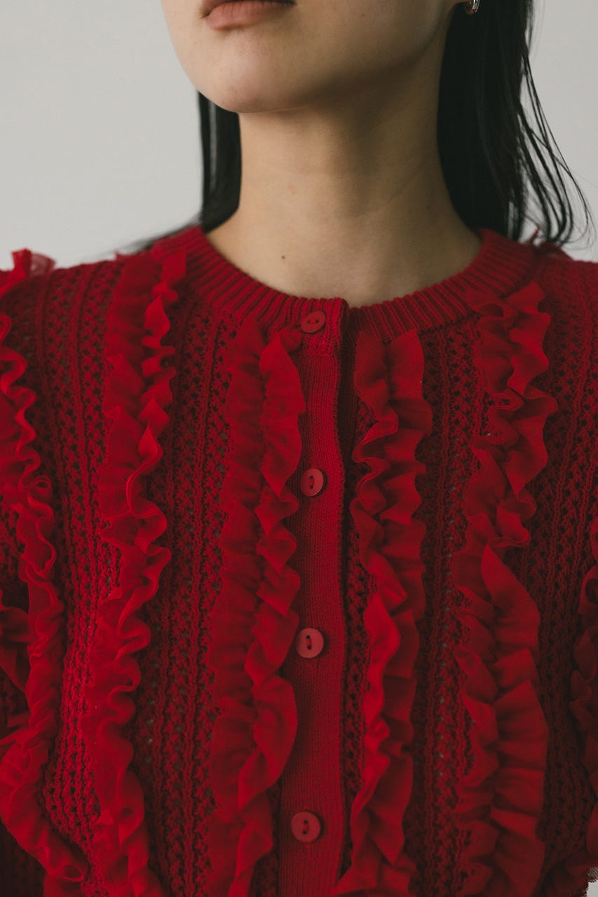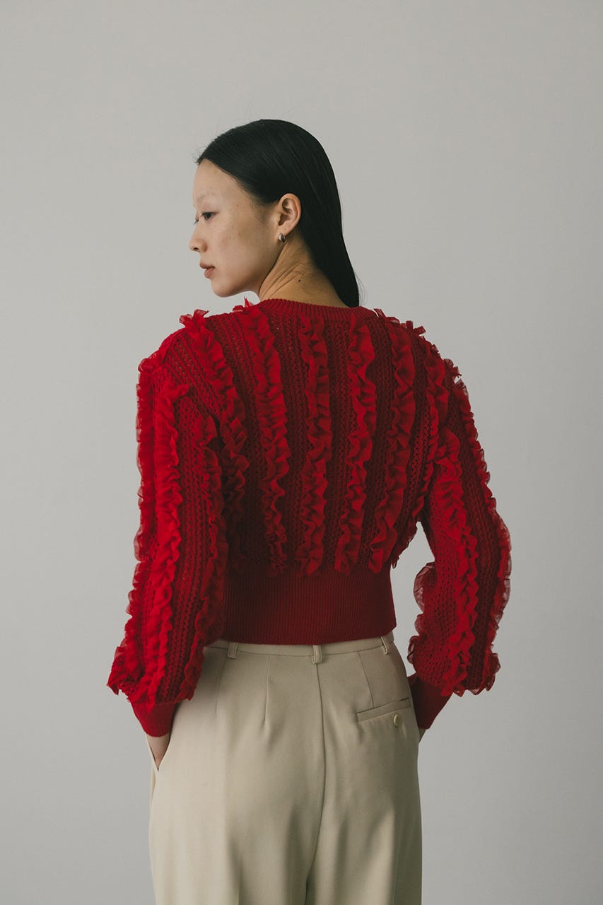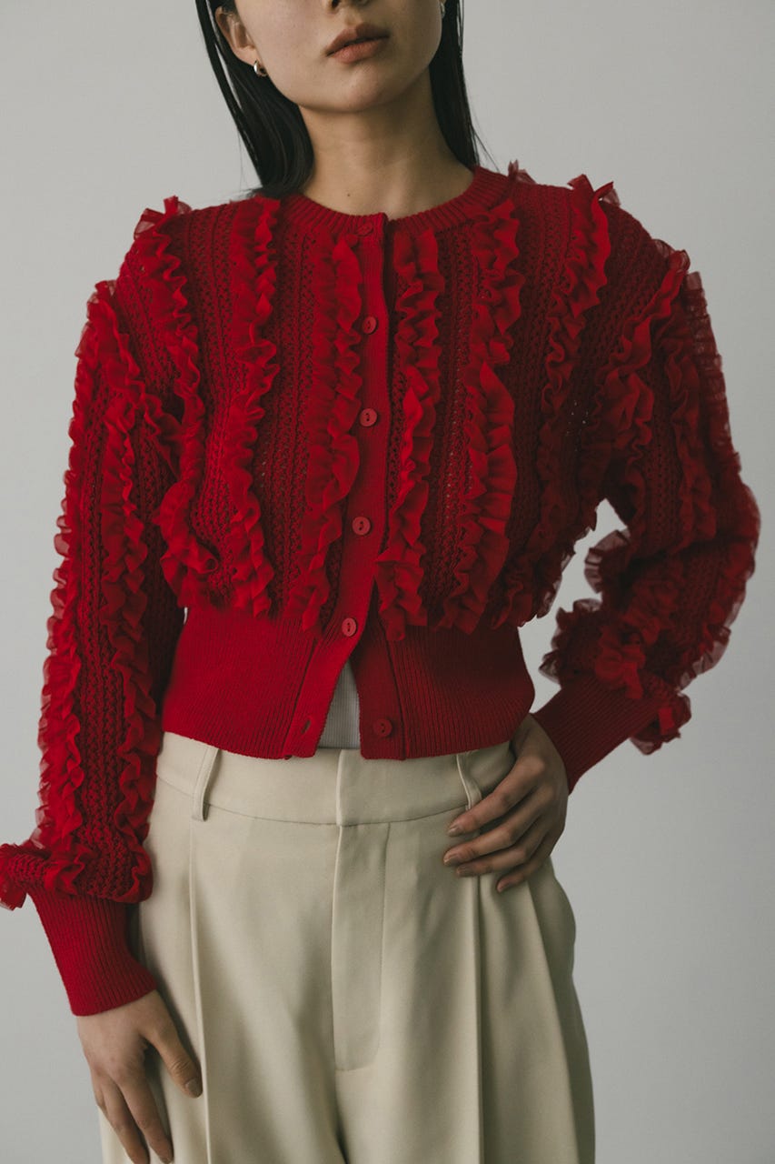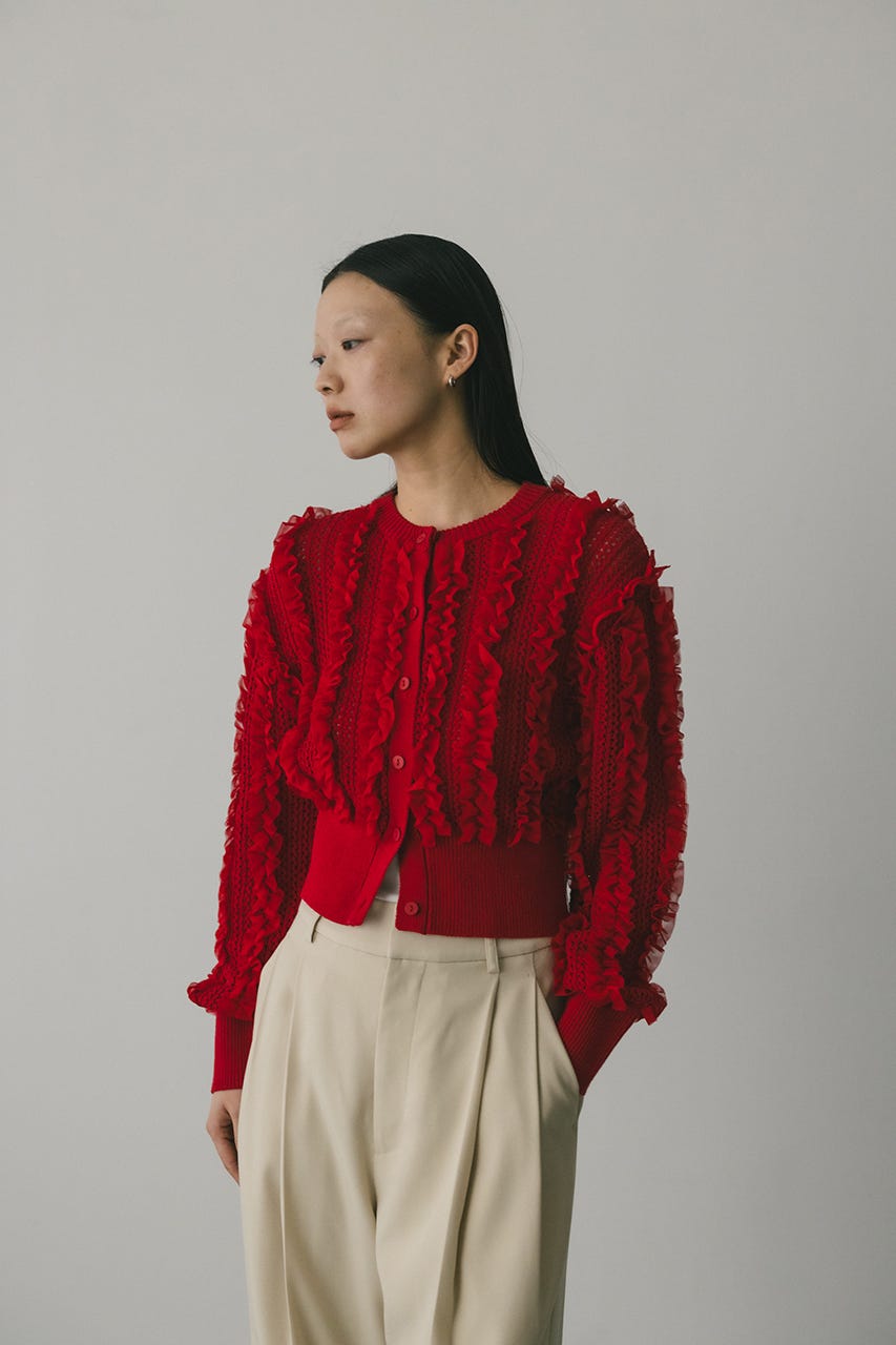 ドライタッチの糸で編み立てたニットにチュールフリルをドッキングさせた凹凸のある華やかなニットカーデ。