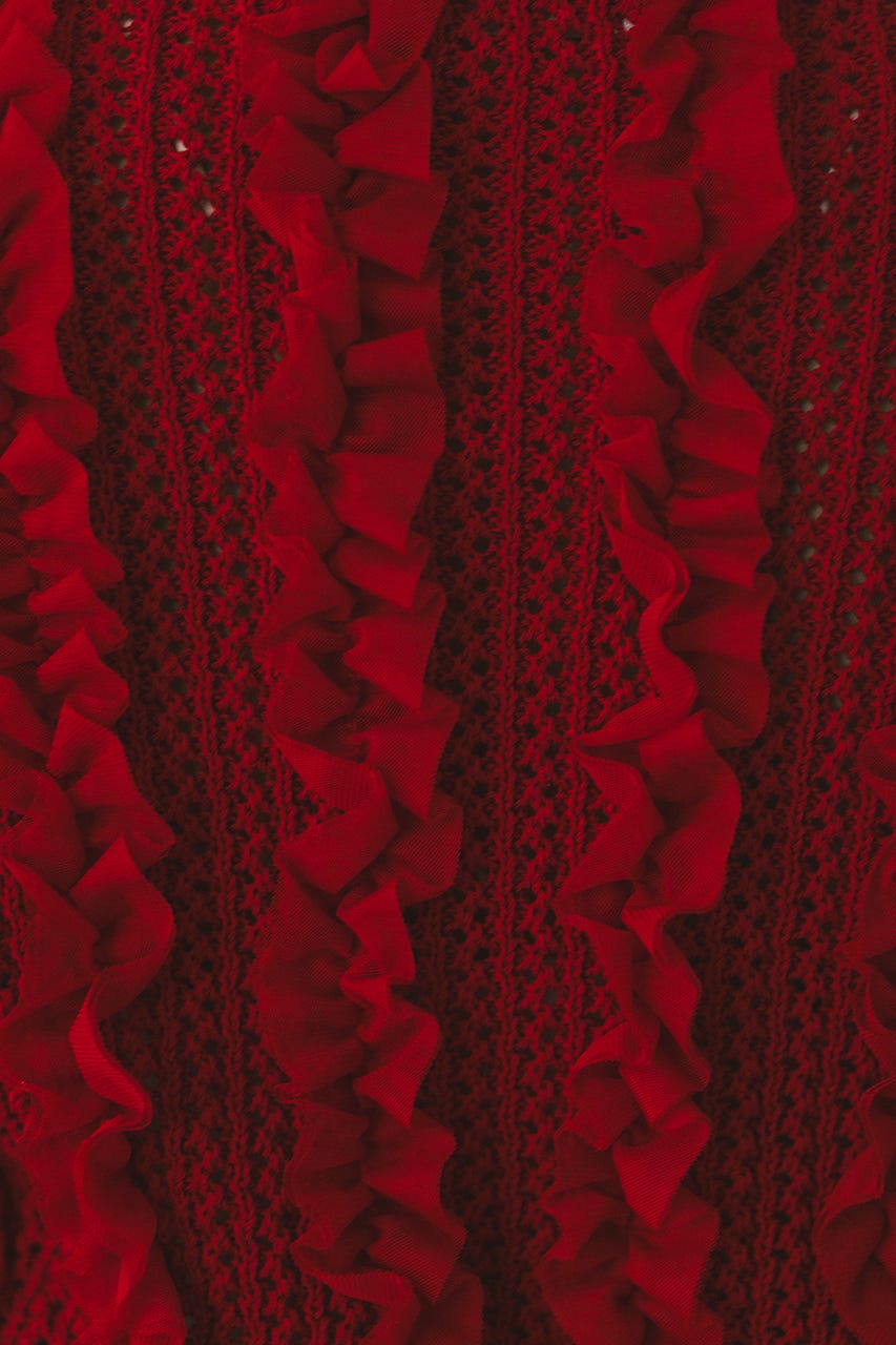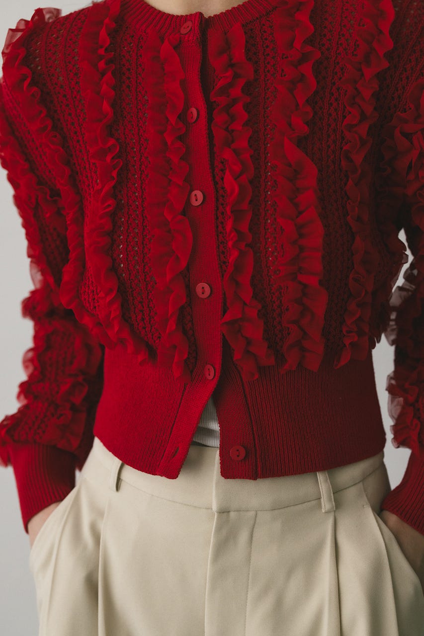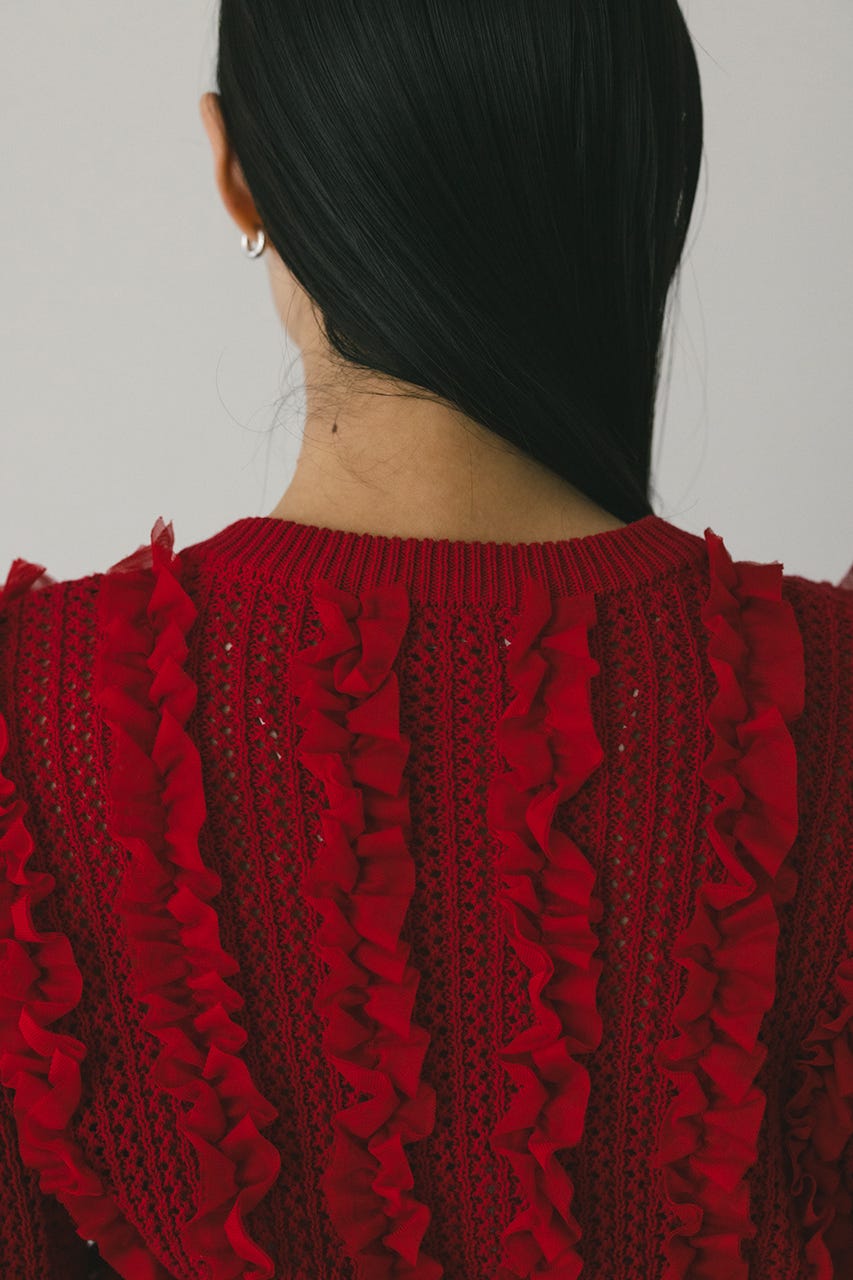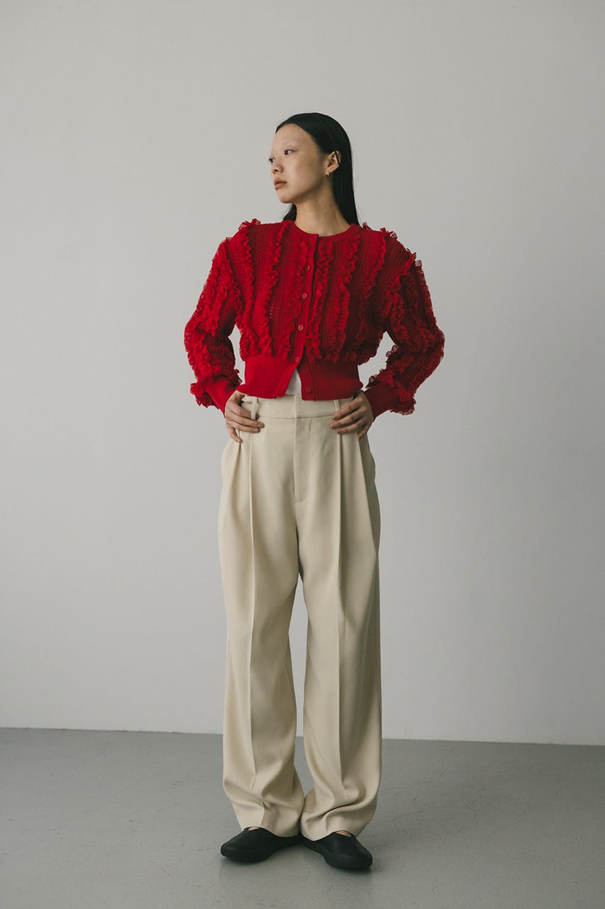 ドライタッチの糸で編み立てたニットにチュールフリルをドッキングさせた凹凸のある華やかなニットカーデ。