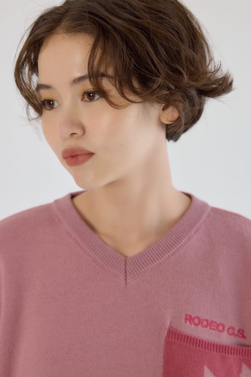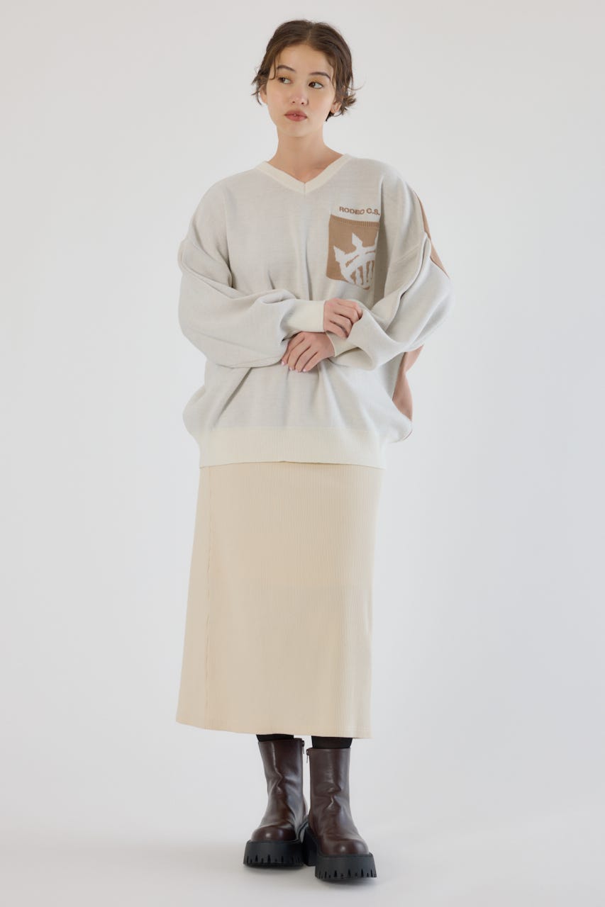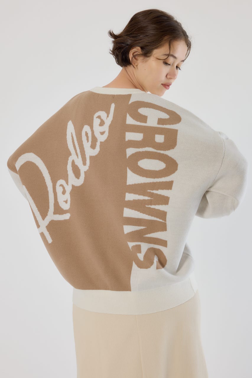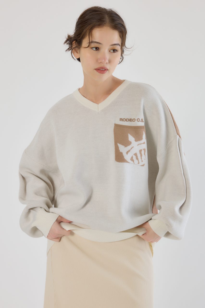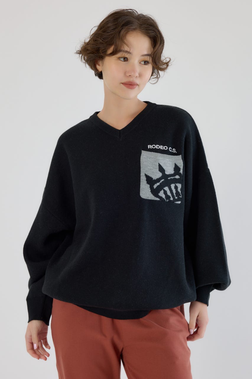 フロントには配色のポケット、バックは大胆なバイカラー仕様がRODEOらしいこだわりのニットトップスです。