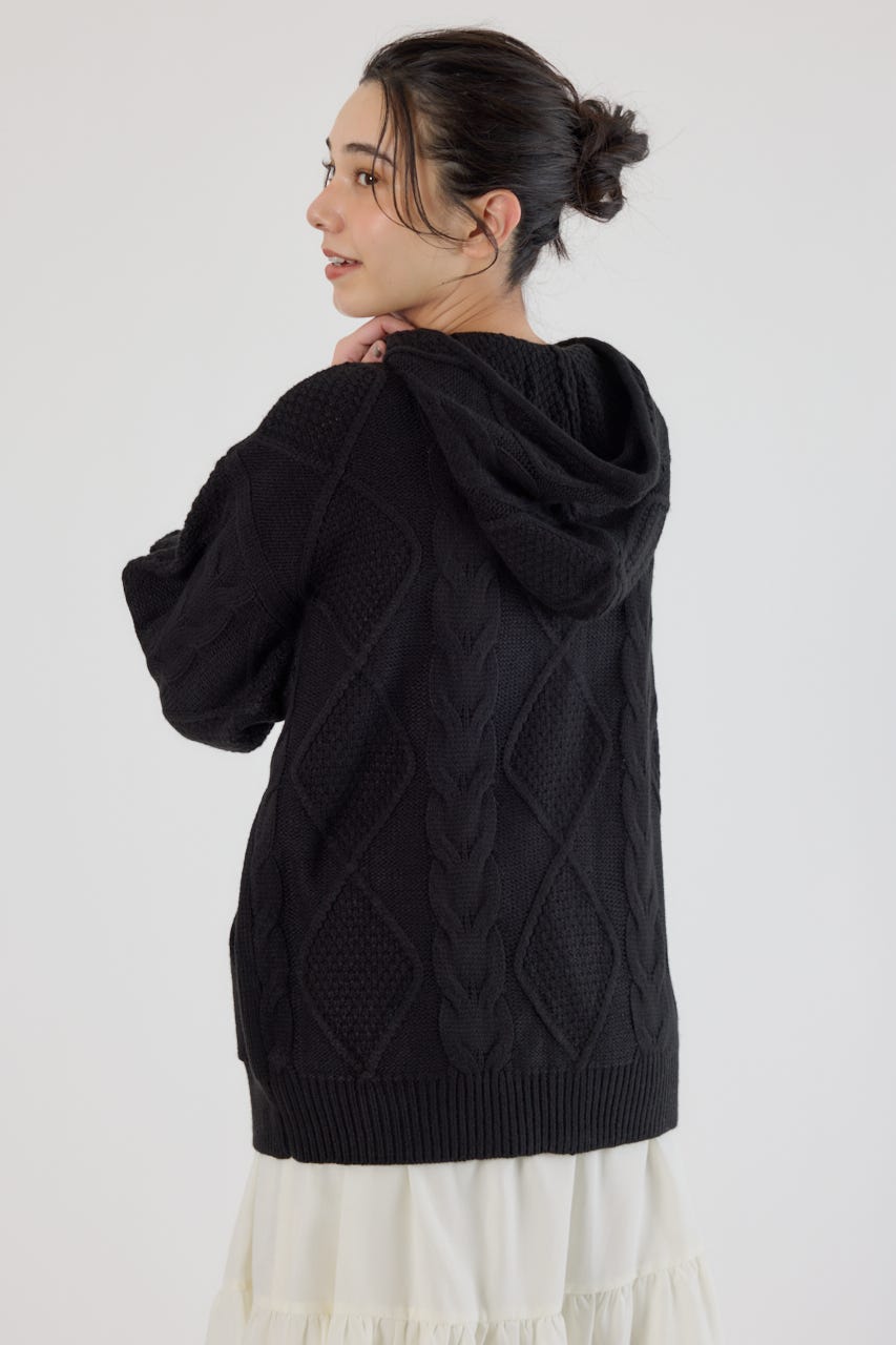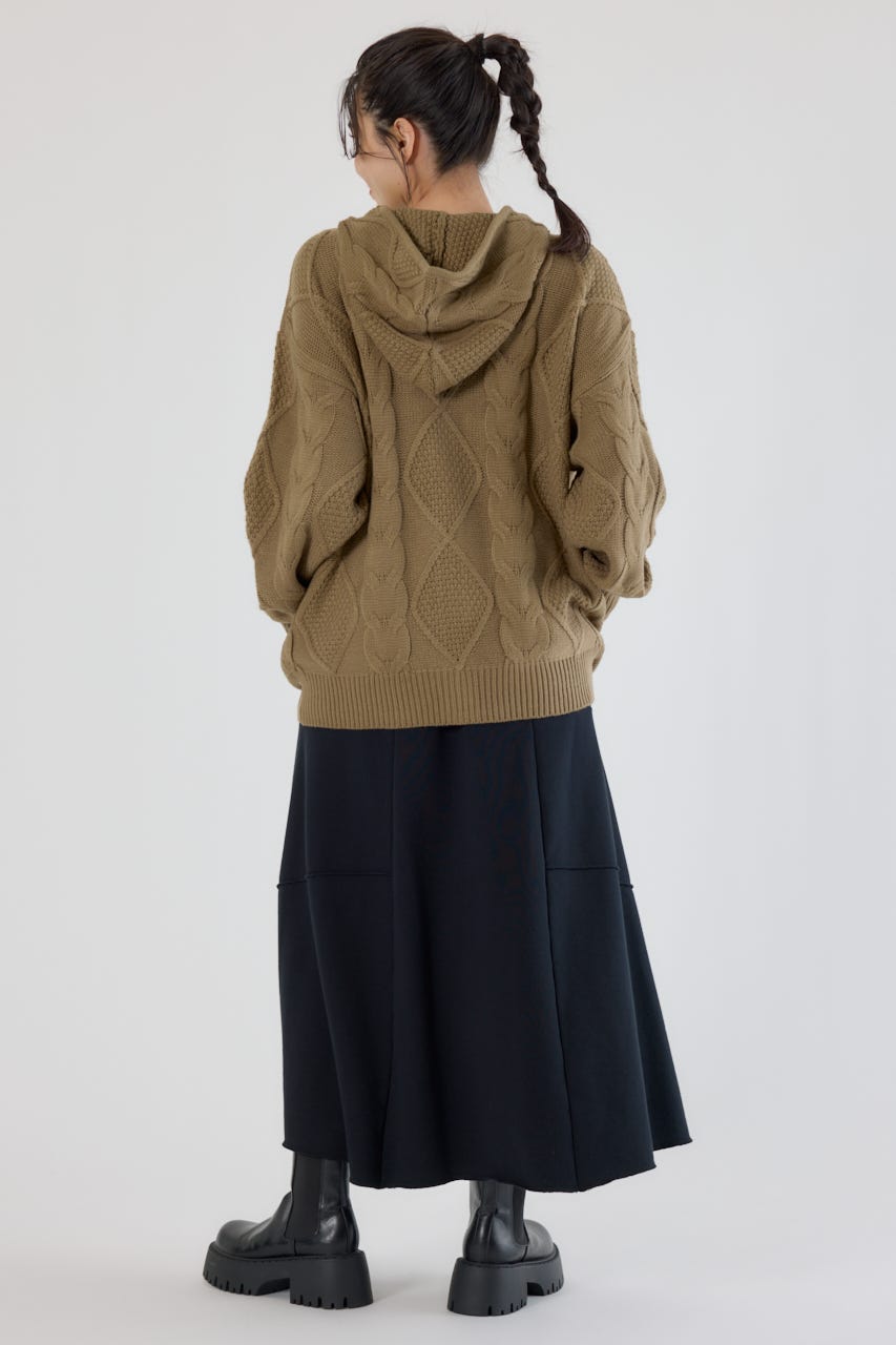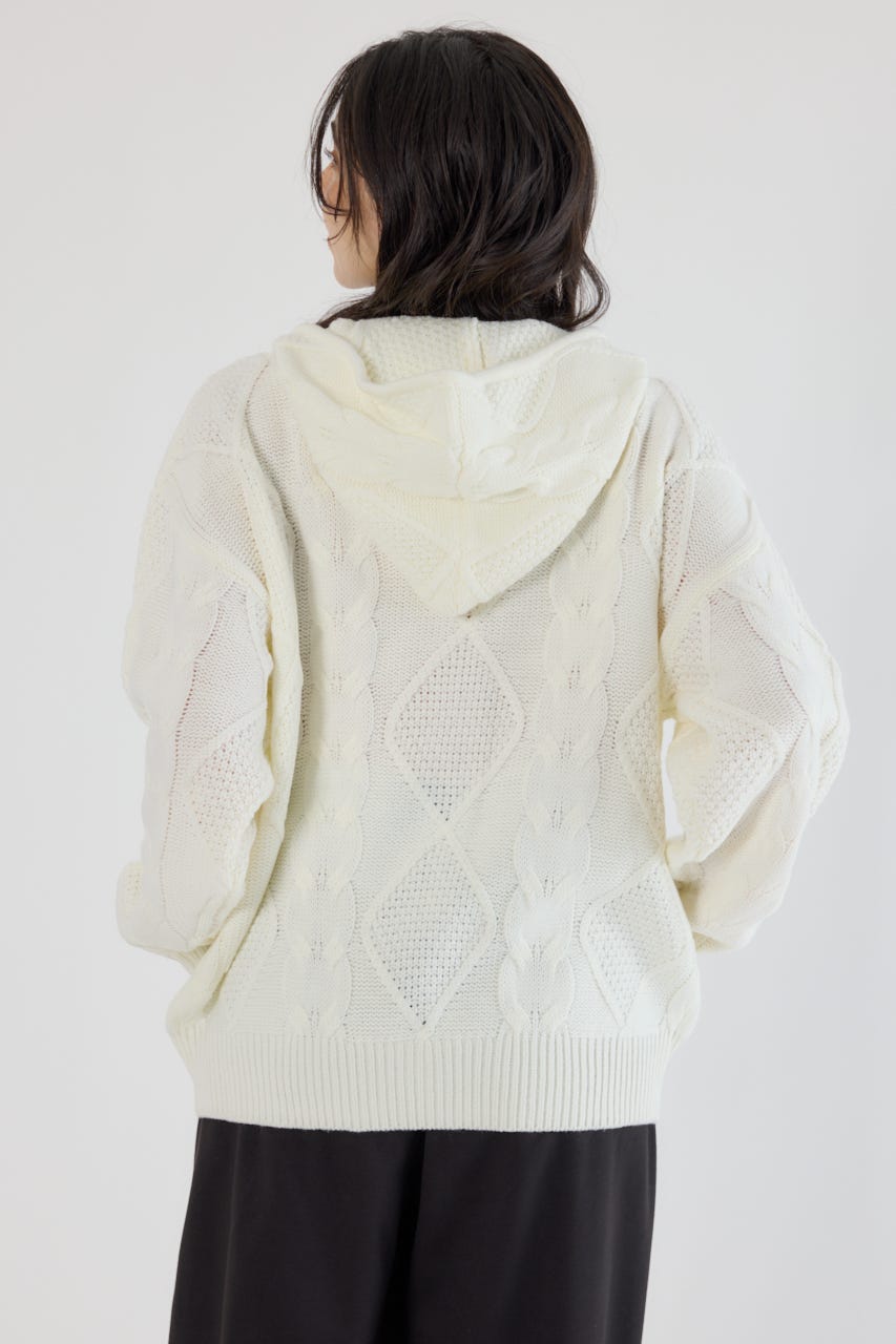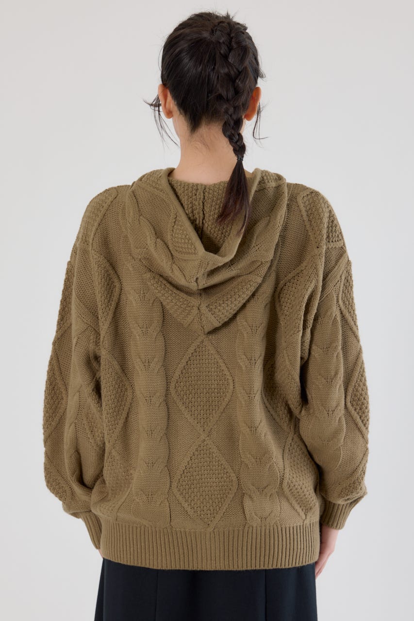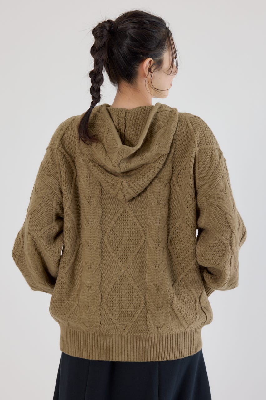 立体感のあるケーブルが目を引くニットジップフーディー。