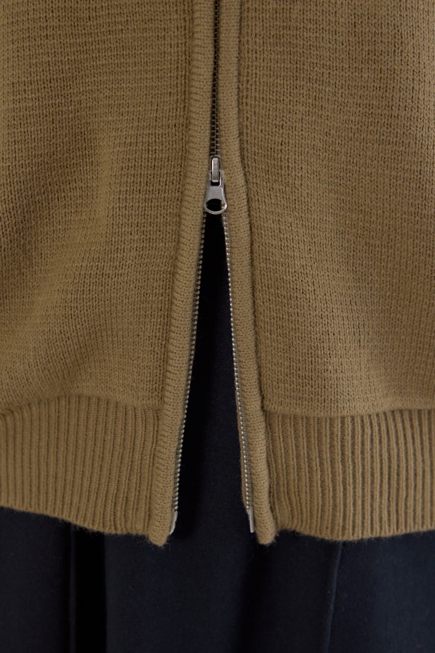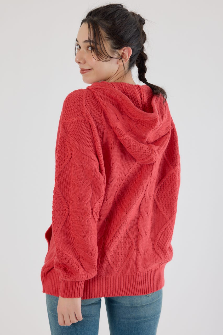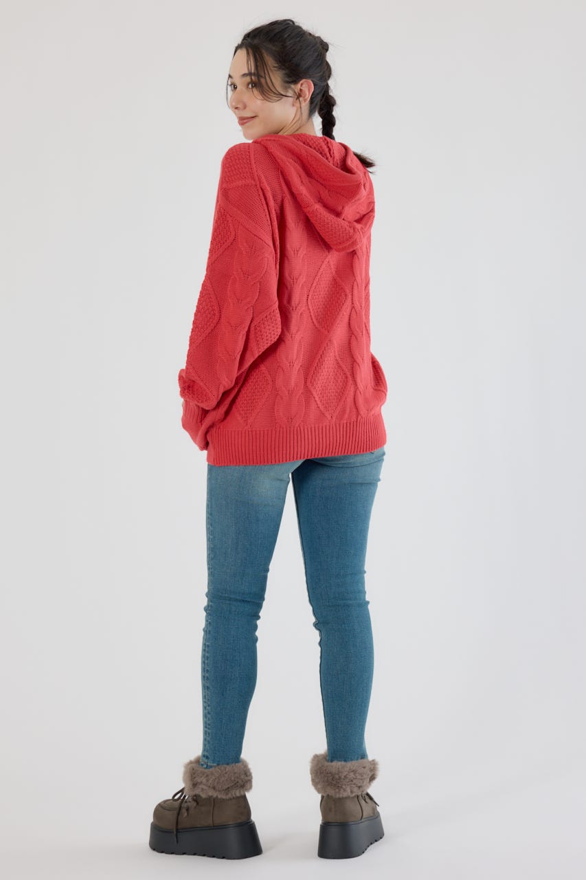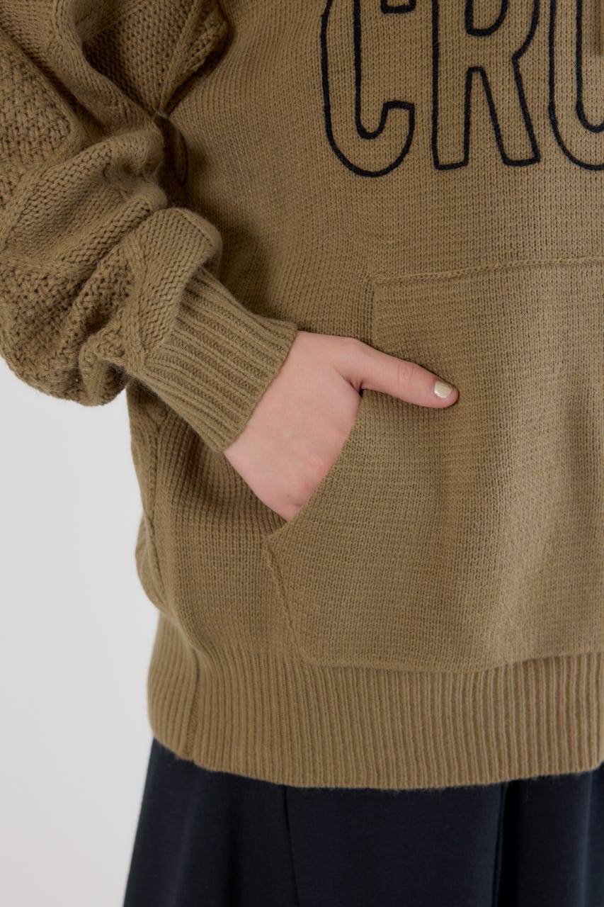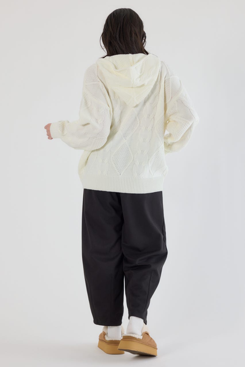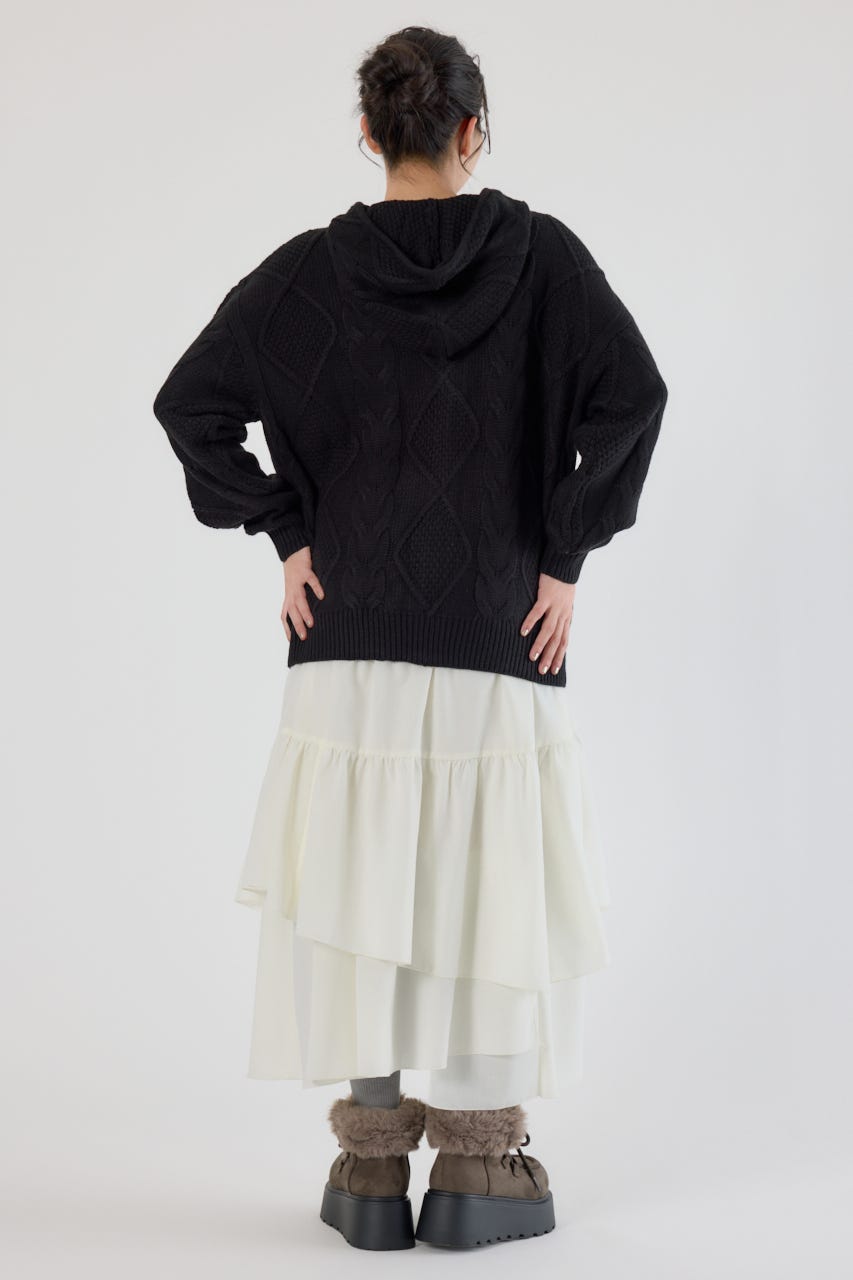 立体感のあるケーブルが目を引くニットジップフーディー。