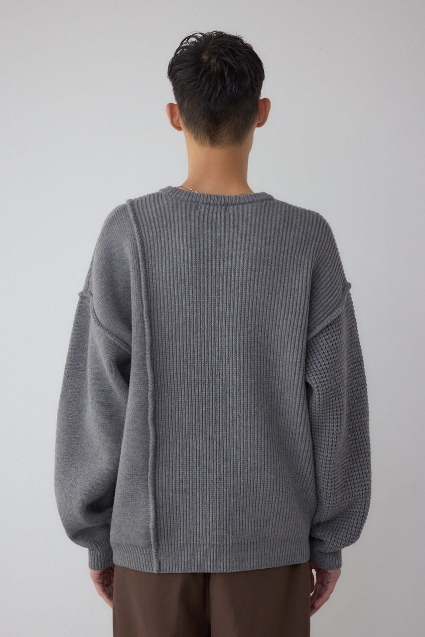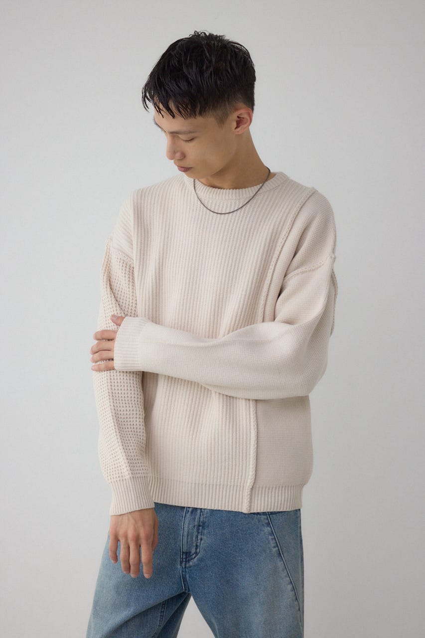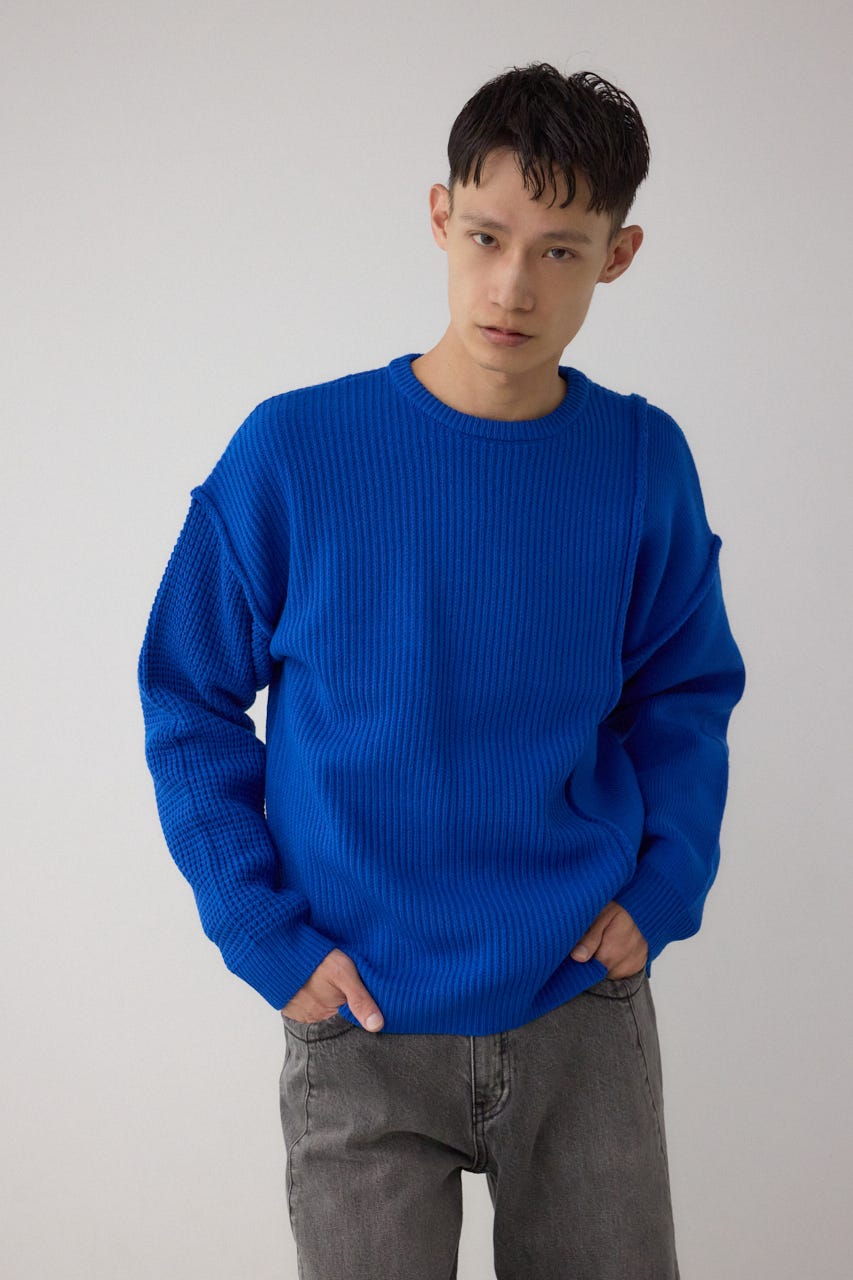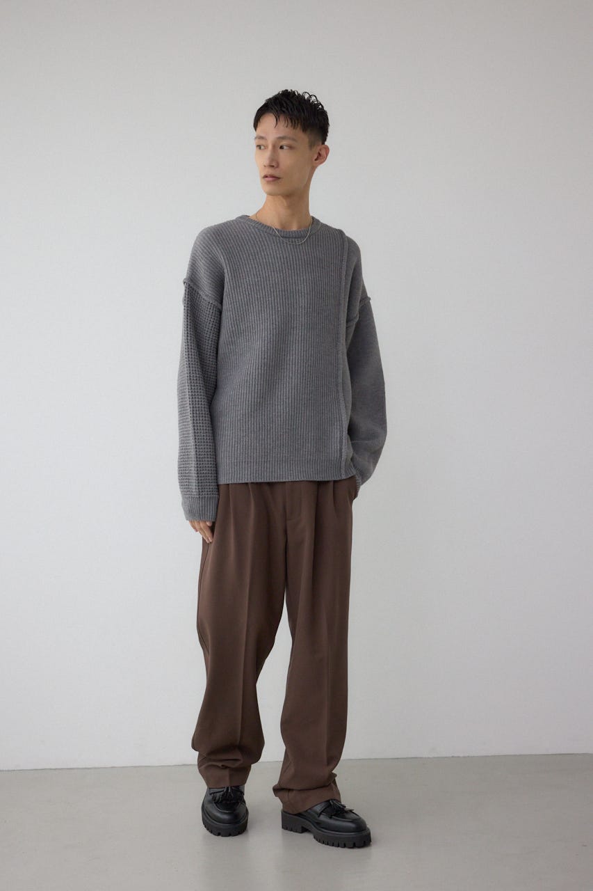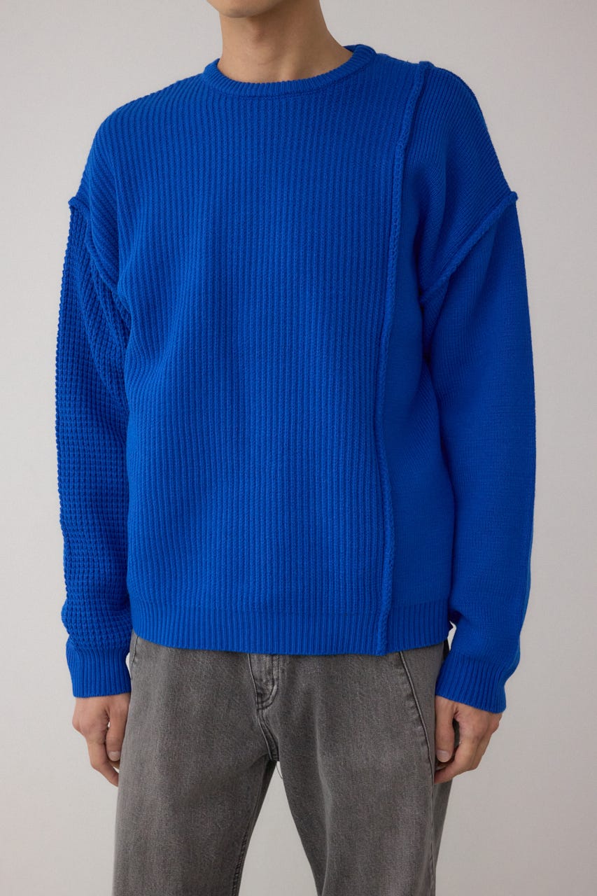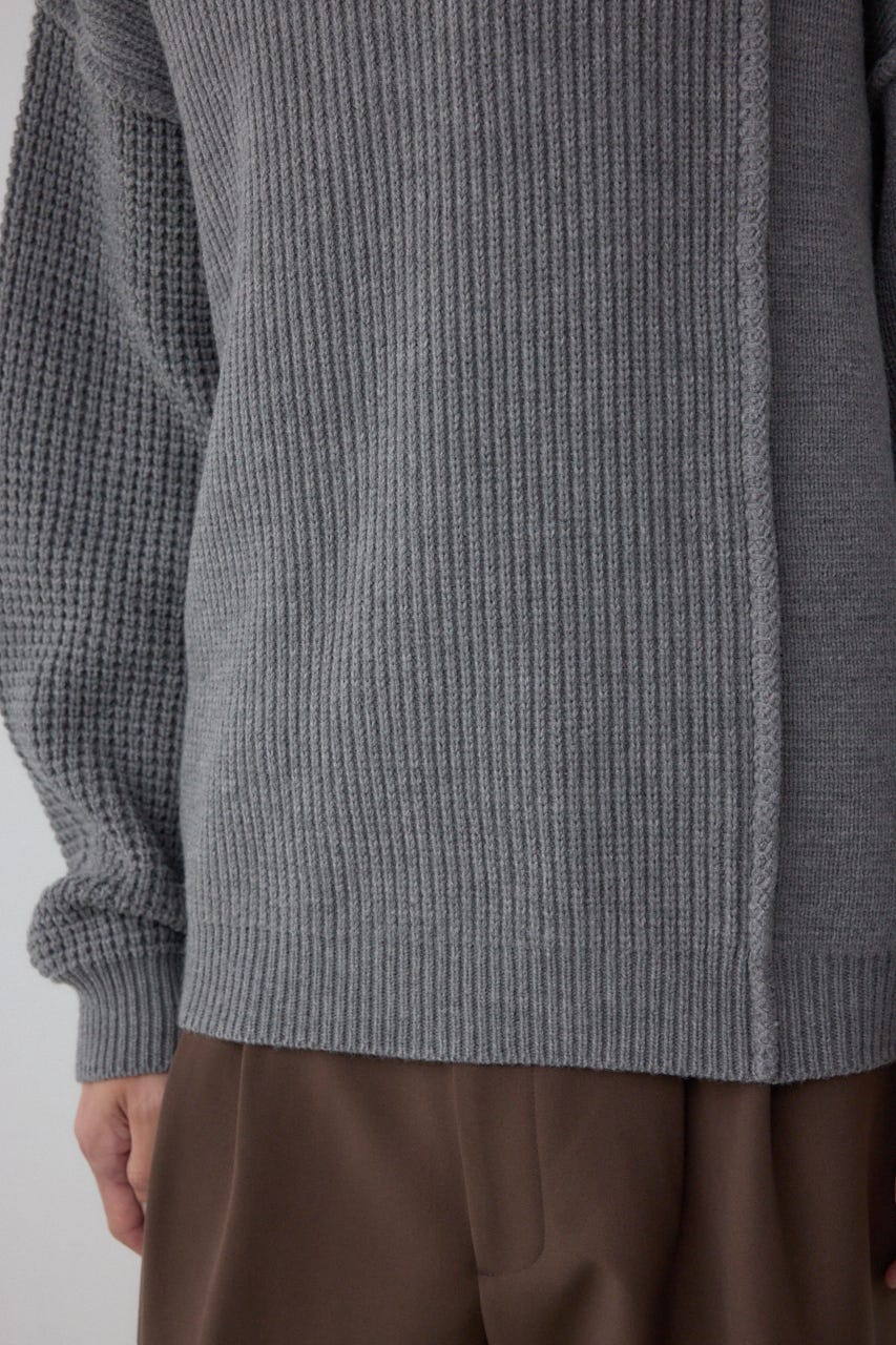 パッチワーク風の編み切り替えで表情豊かな、存在感のあるニットトップス。