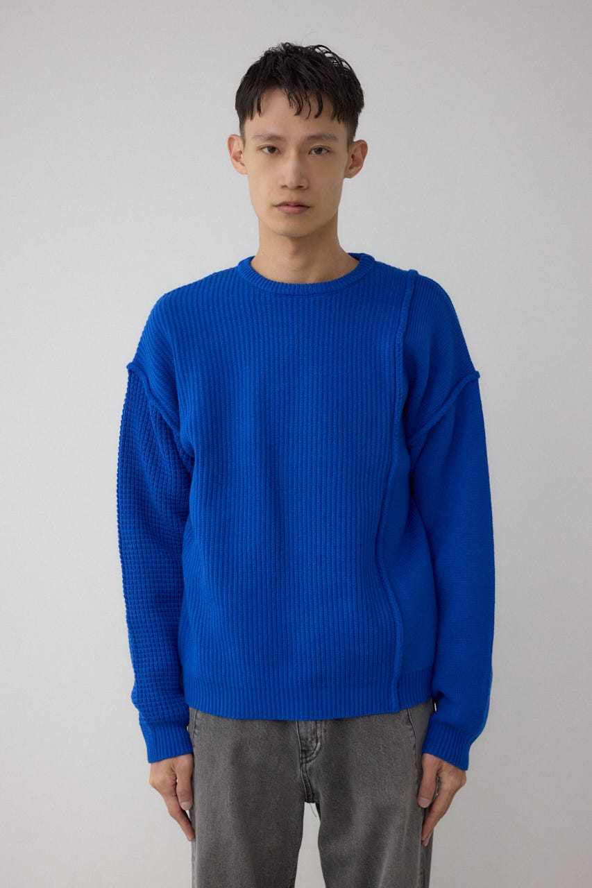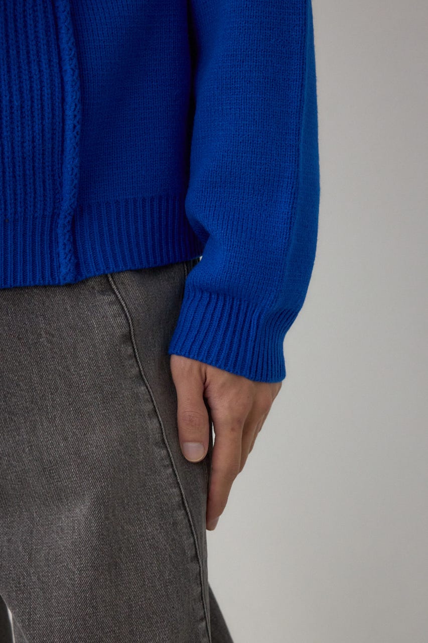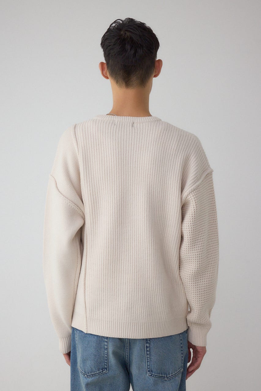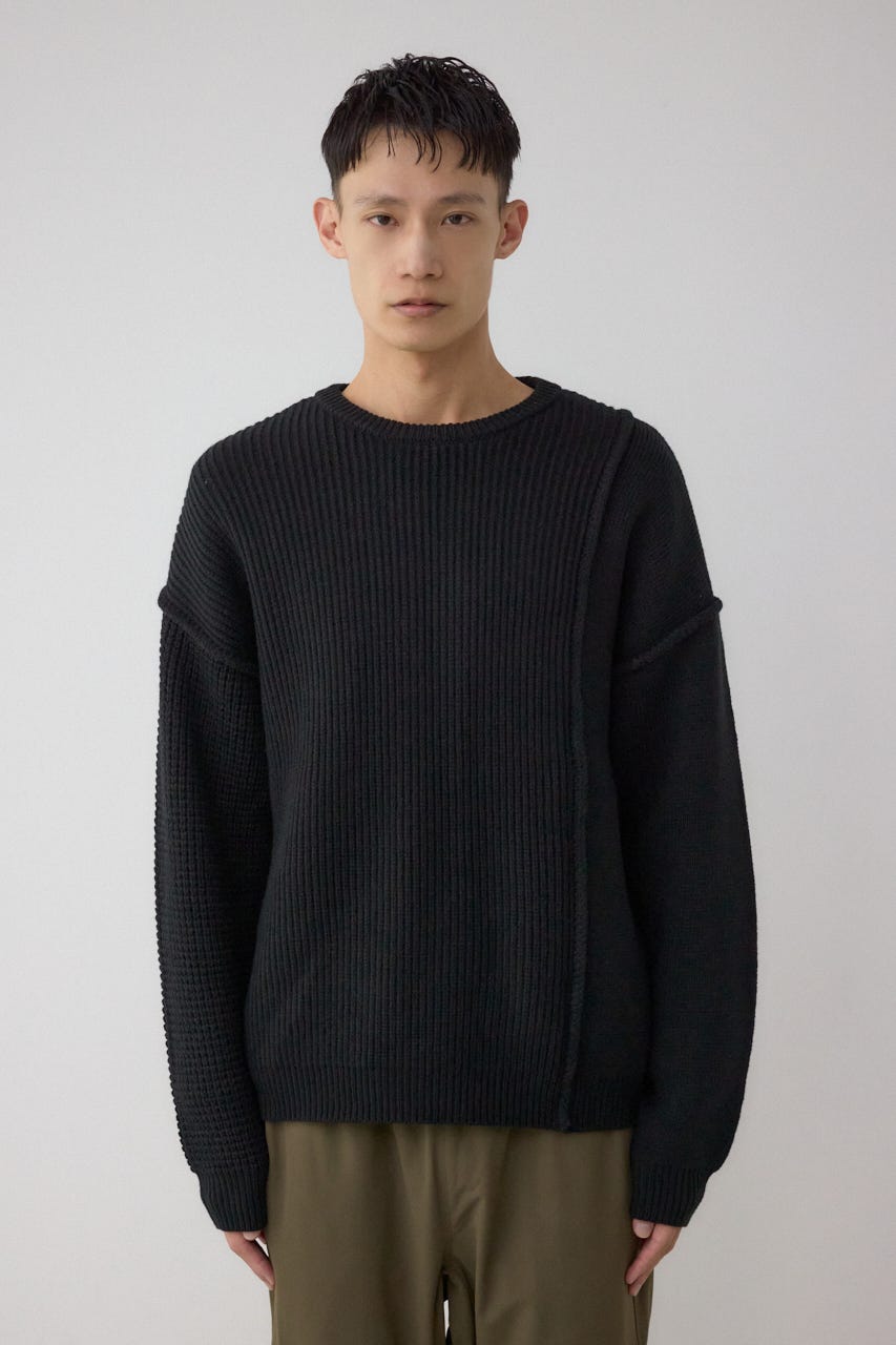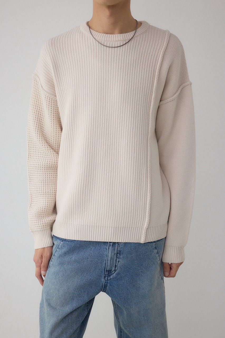 パッチワーク風の編み切り替えで表情豊かな、存在感のあるニットトップス。