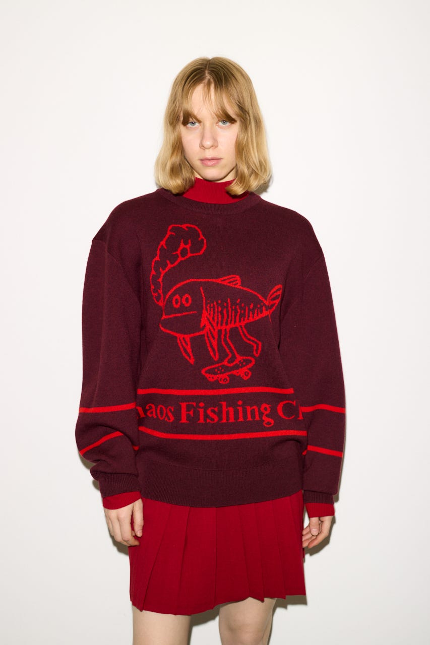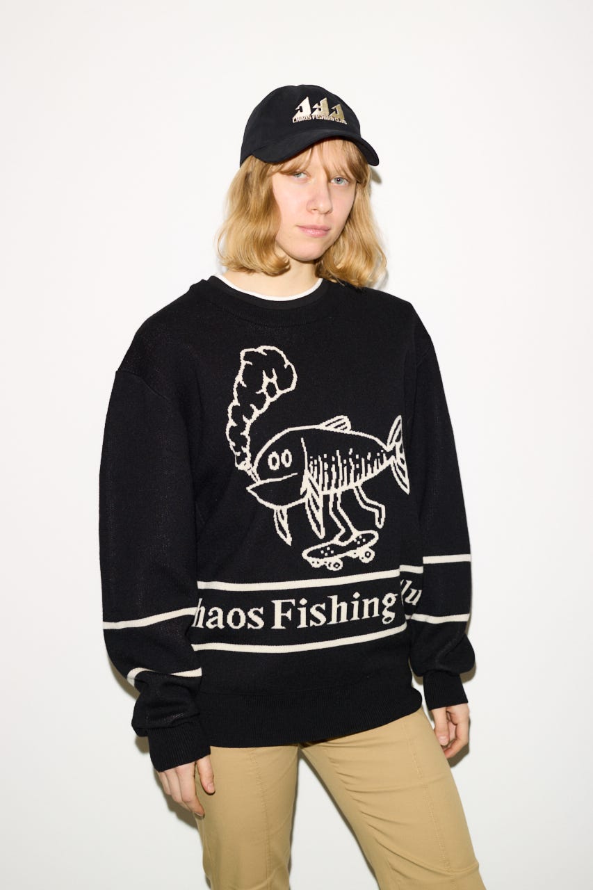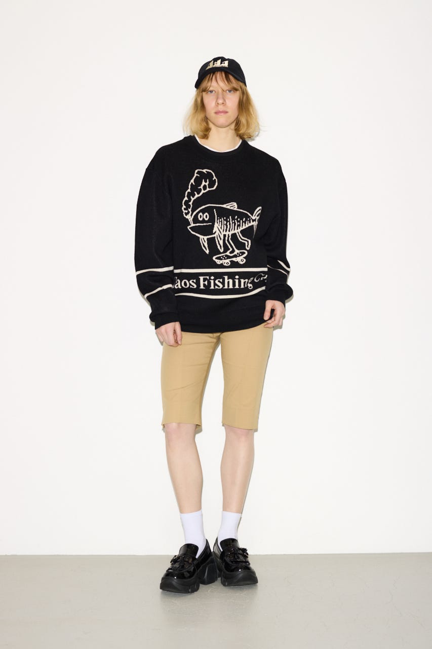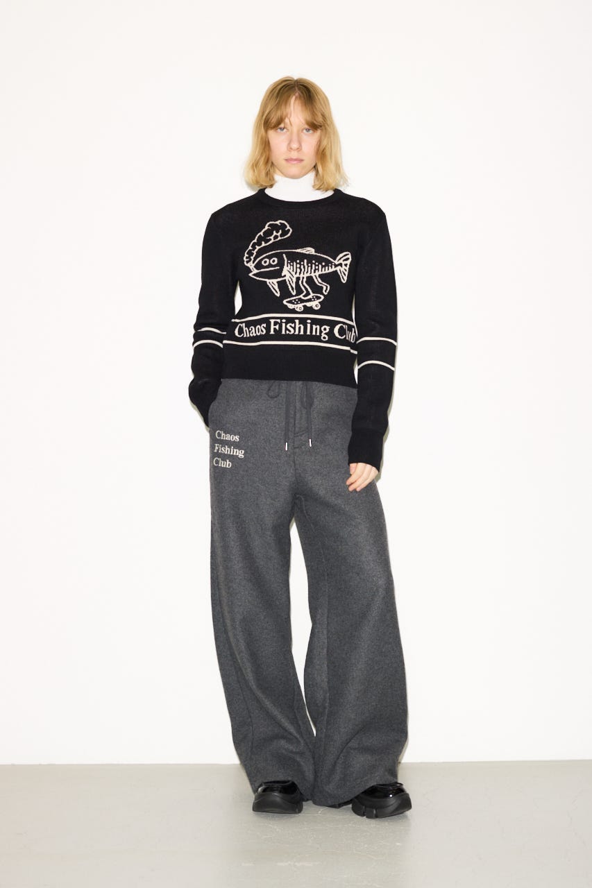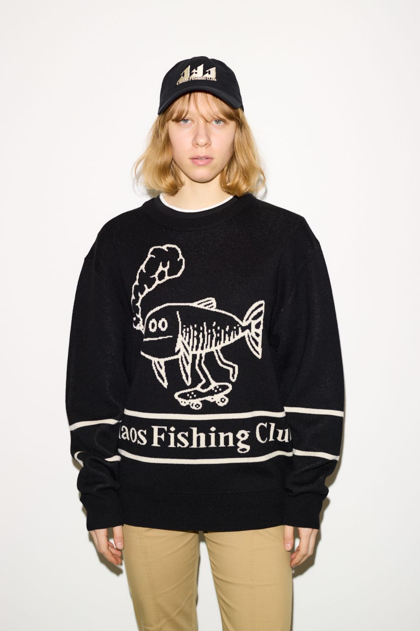 Chaos Fishing Clubの代名詞でもある(OSAKANA KUN)とロゴジャガードをフロントに大胆に取り入れたクルーネックニットトップス。