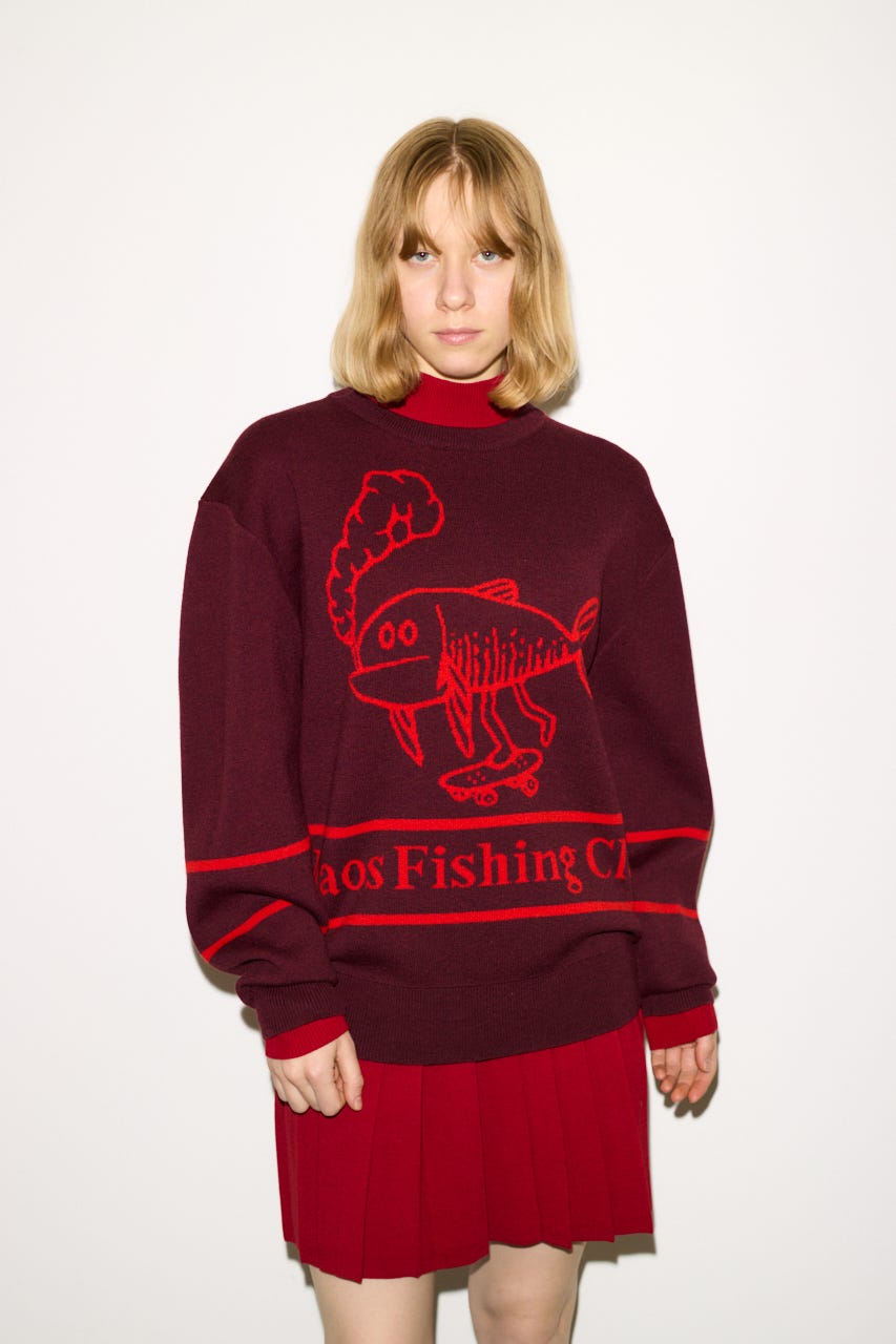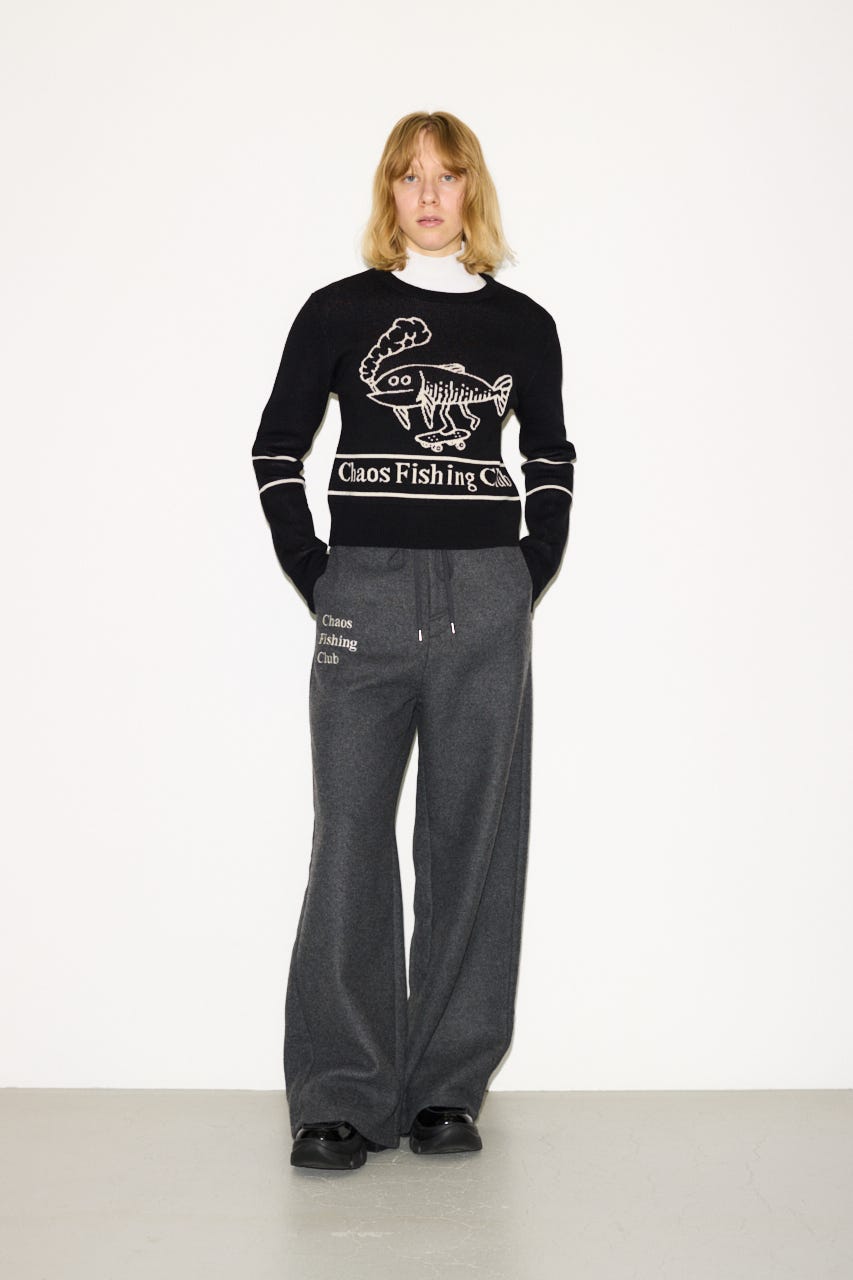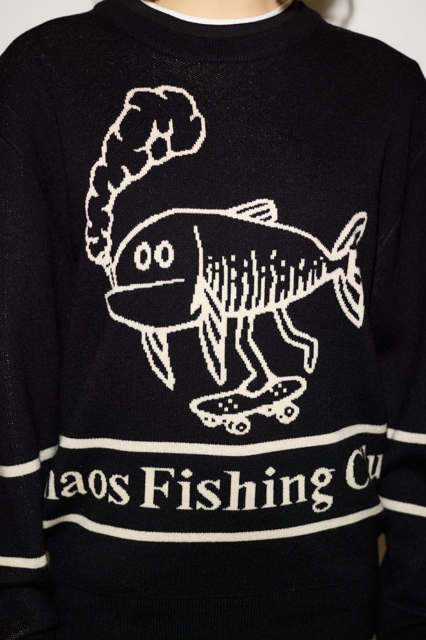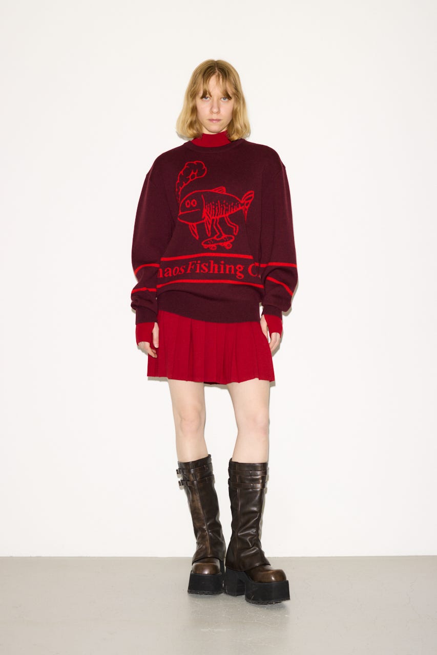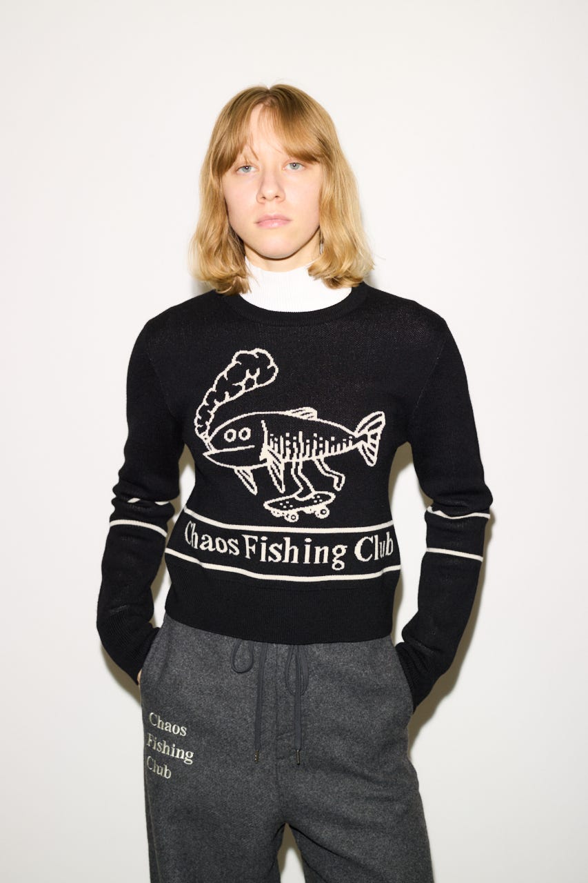 Chaos Fishing Clubの代名詞でもある(OSAKANA KUN)とロゴジャガードをフロントに大胆に取り入れたクルーネックニットトップス。