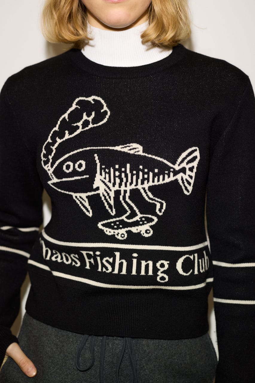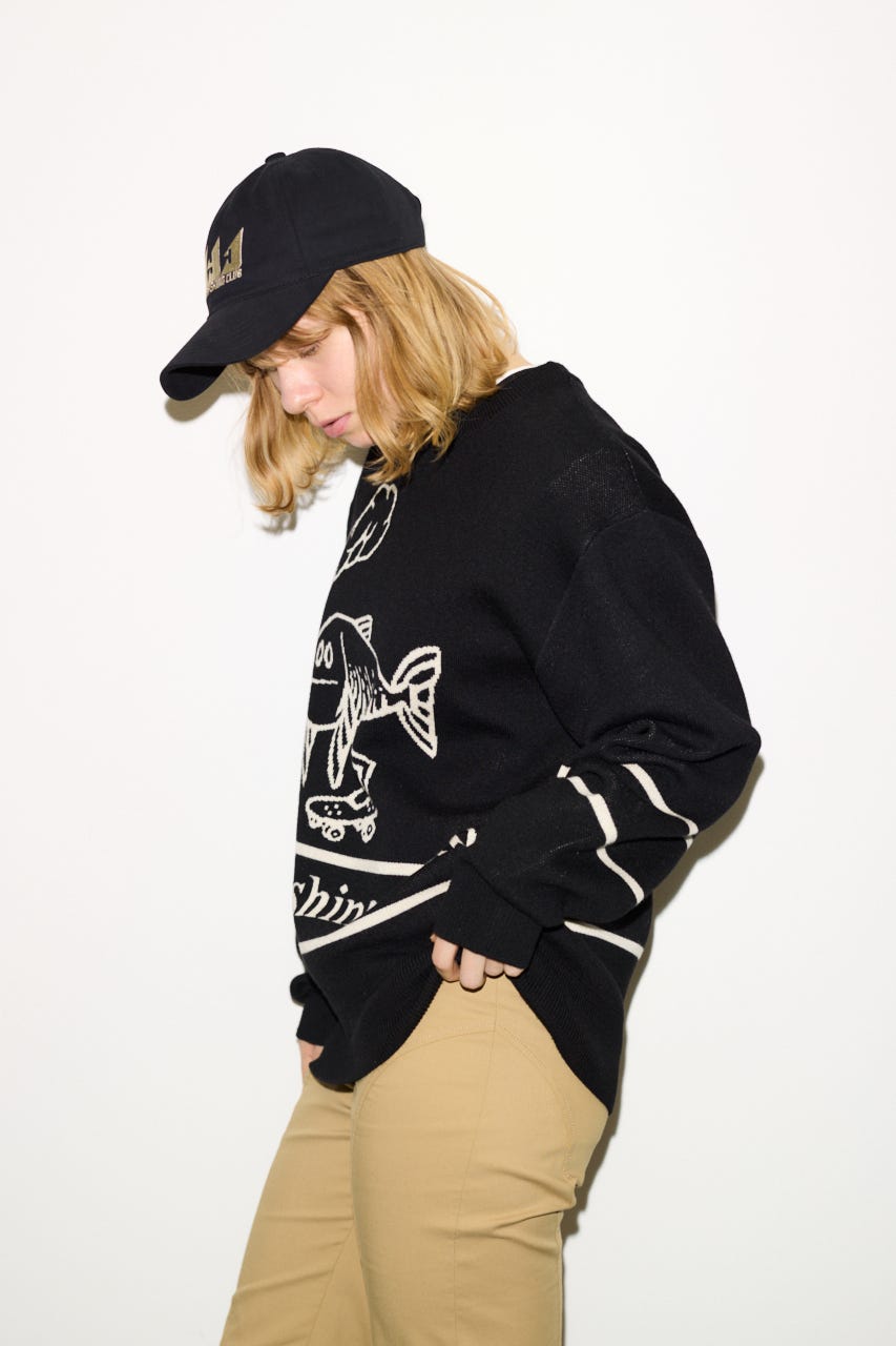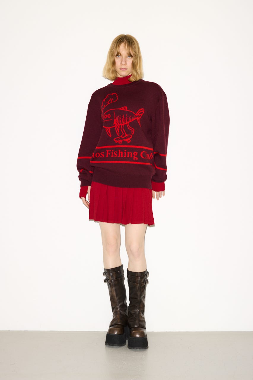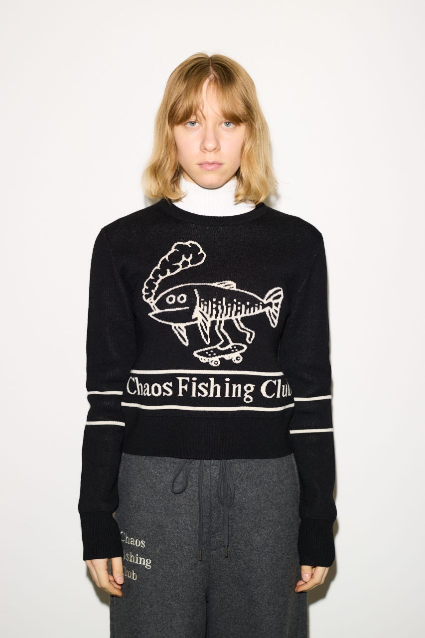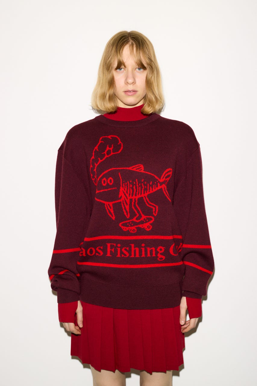 Chaos Fishing Clubの代名詞でもある(OSAKANA KUN)とロゴジャガードをフロントに大胆に取り入れたクルーネックニットトップス。
