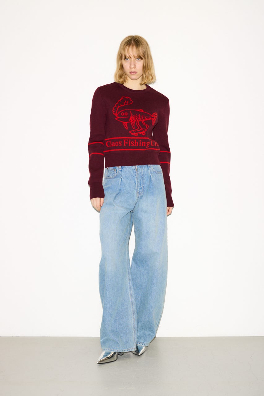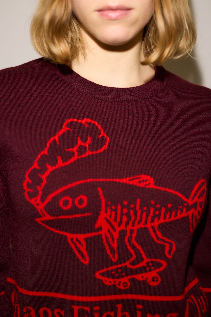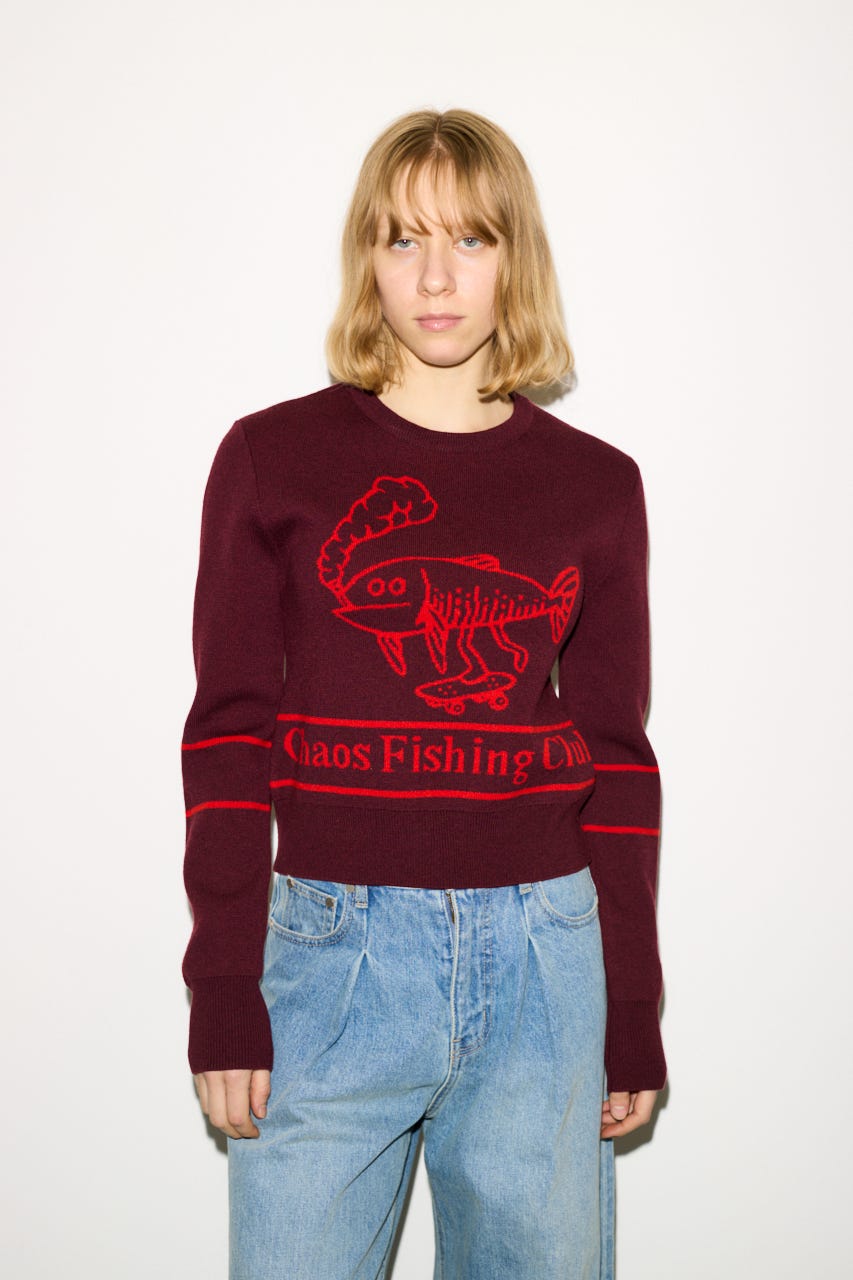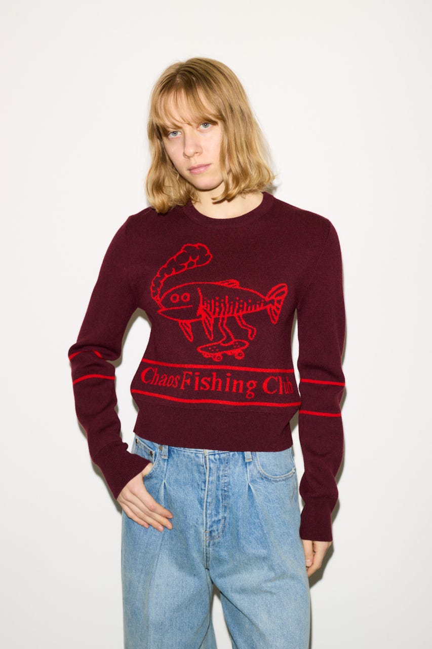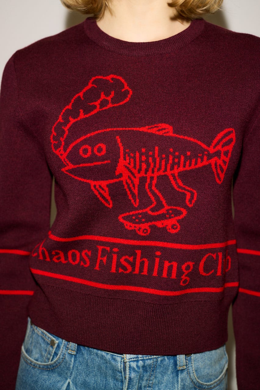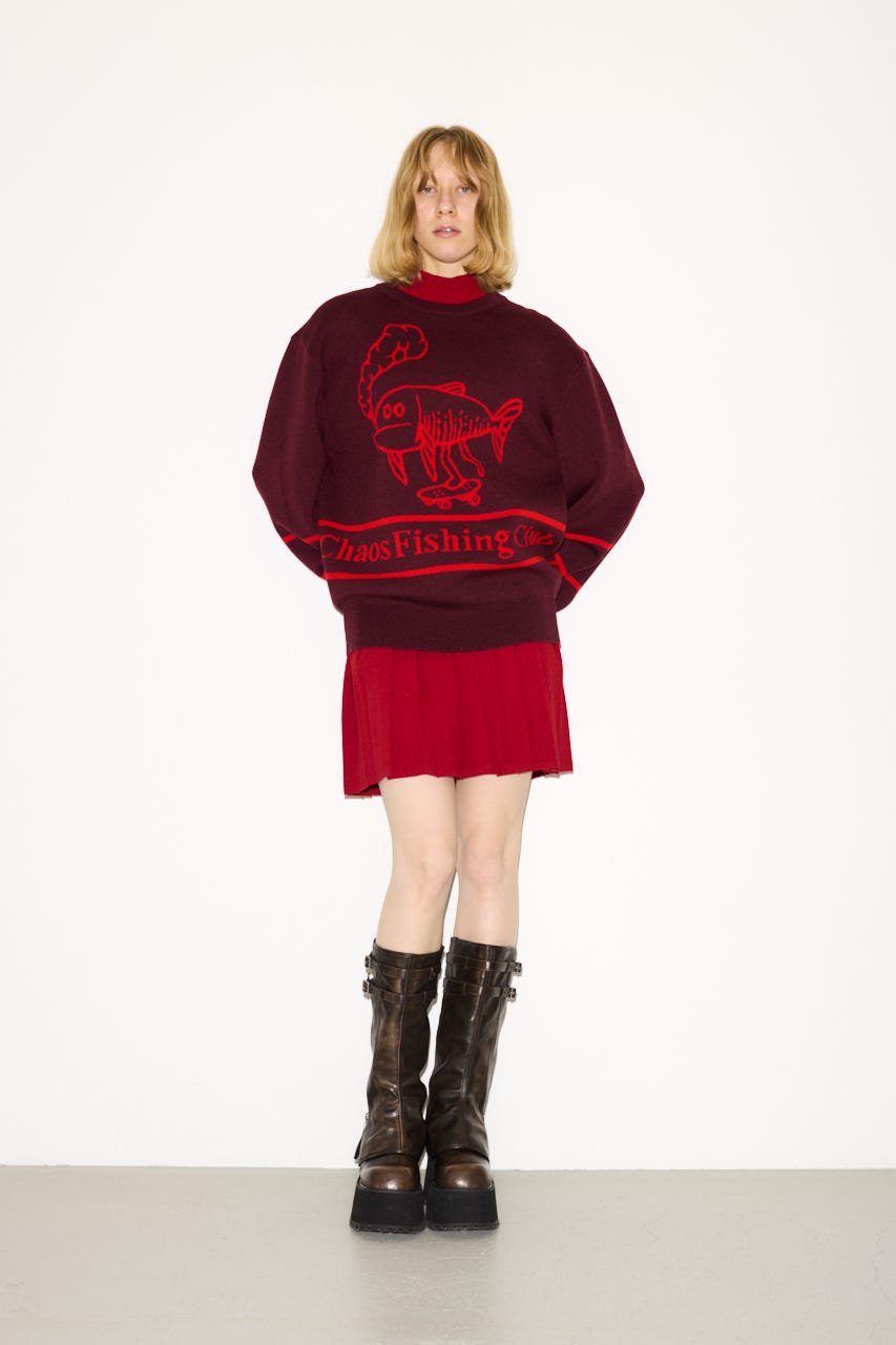 Chaos Fishing Clubの代名詞でもある(OSAKANA KUN)とロゴジャガードをフロントに大胆に取り入れたクルーネックニットトップス。