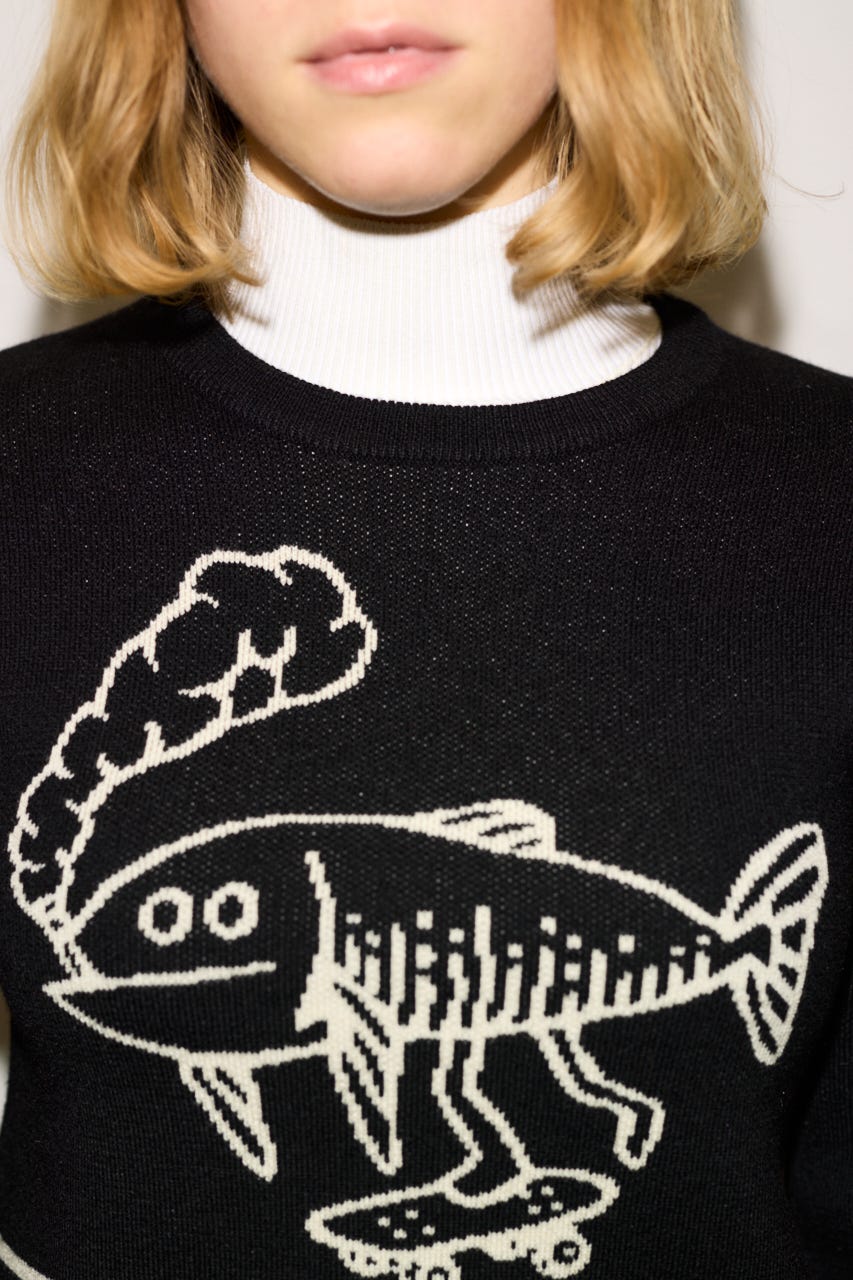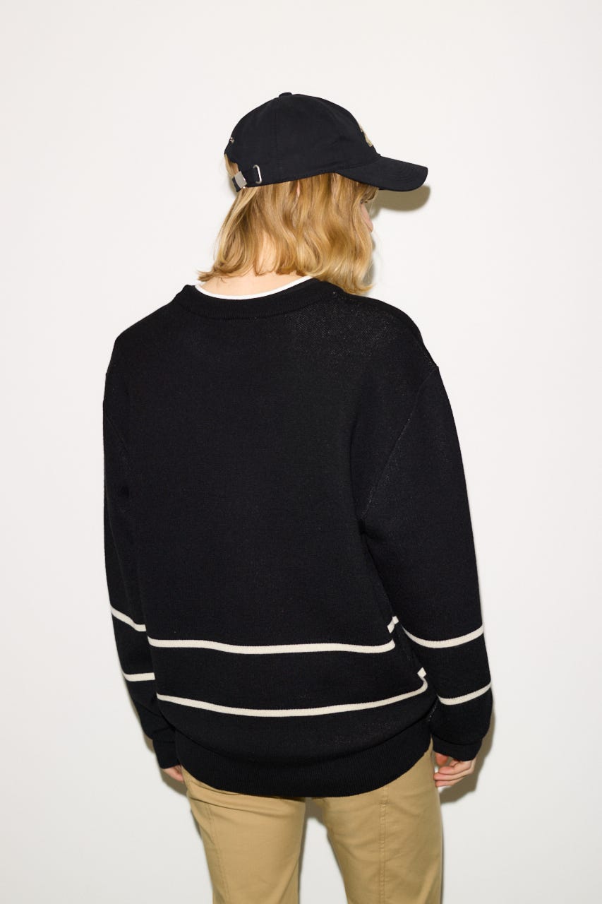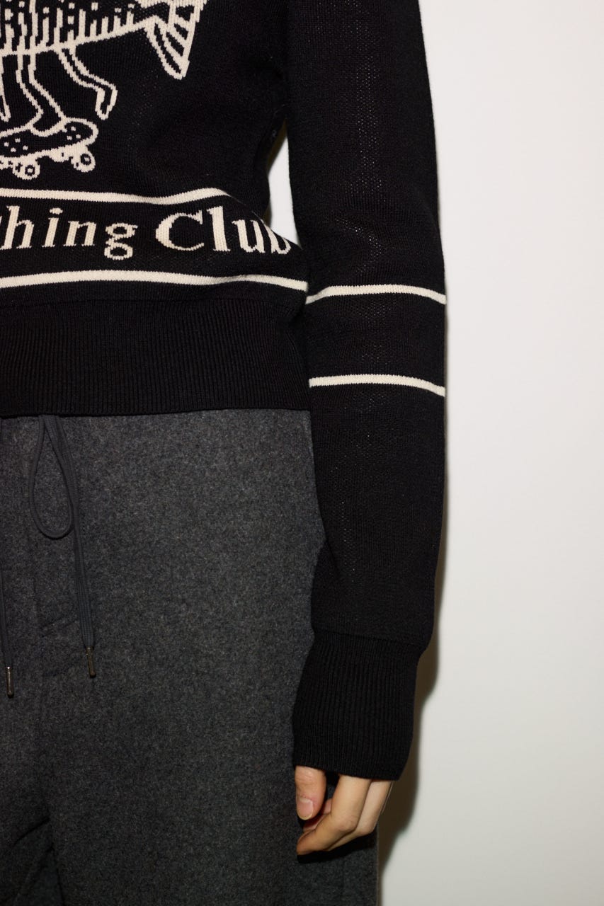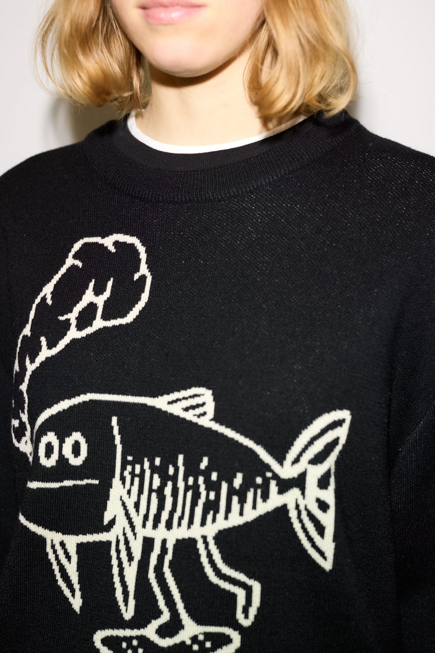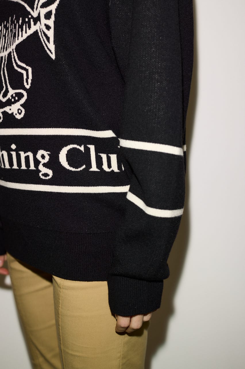 Chaos Fishing Clubの代名詞でもある(OSAKANA KUN)とロゴジャガードをフロントに大胆に取り入れたクルーネックニットトップス。