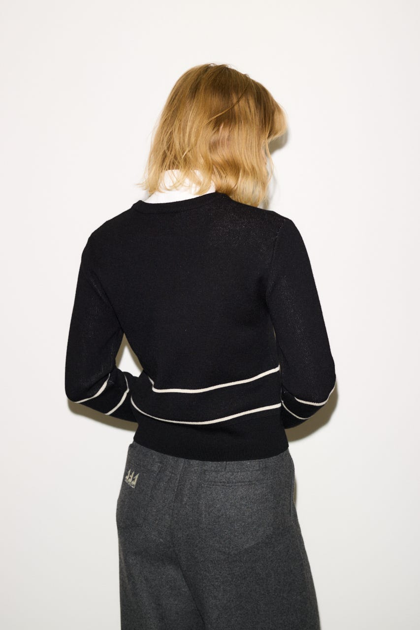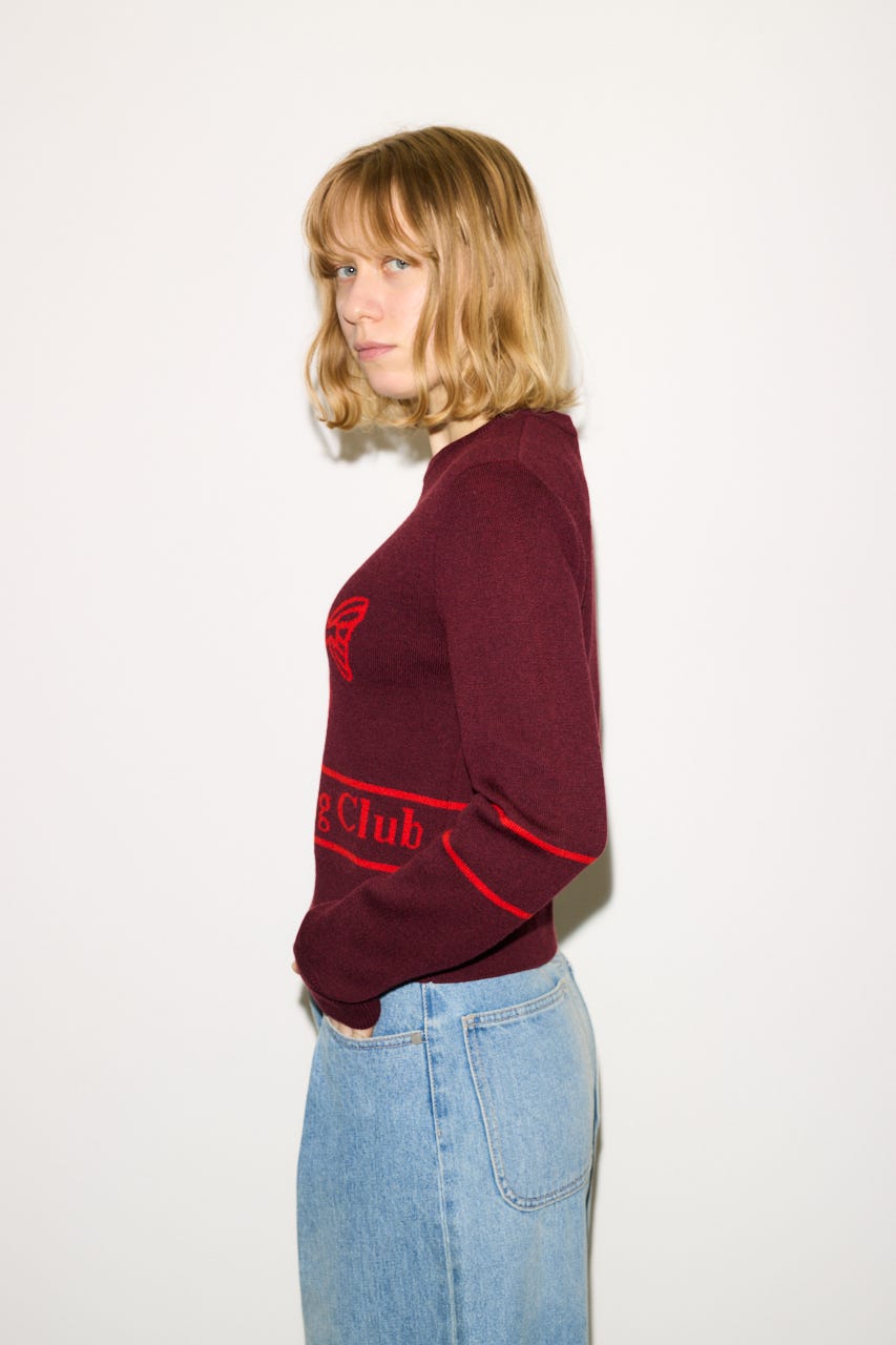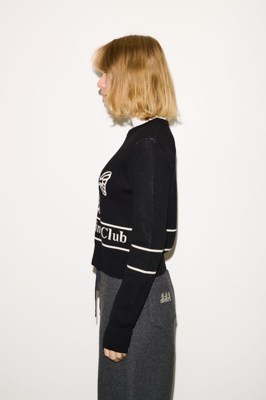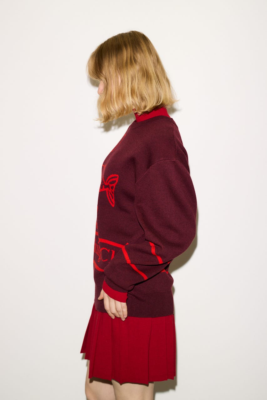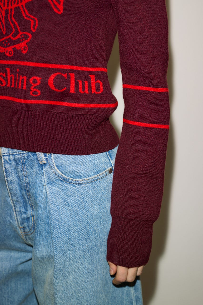 Chaos Fishing Clubの代名詞でもある(OSAKANA KUN)とロゴジャガードをフロントに大胆に取り入れたクルーネックニットトップス。