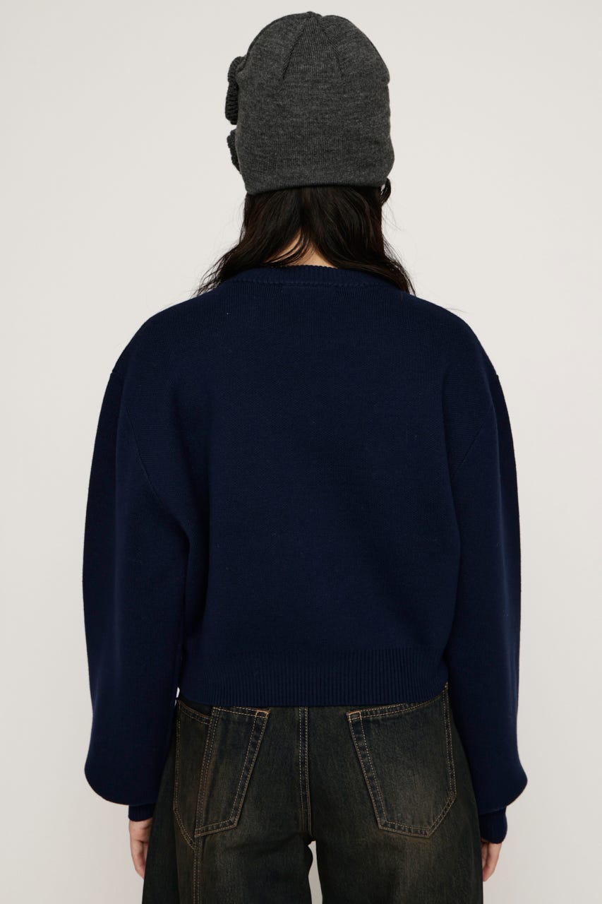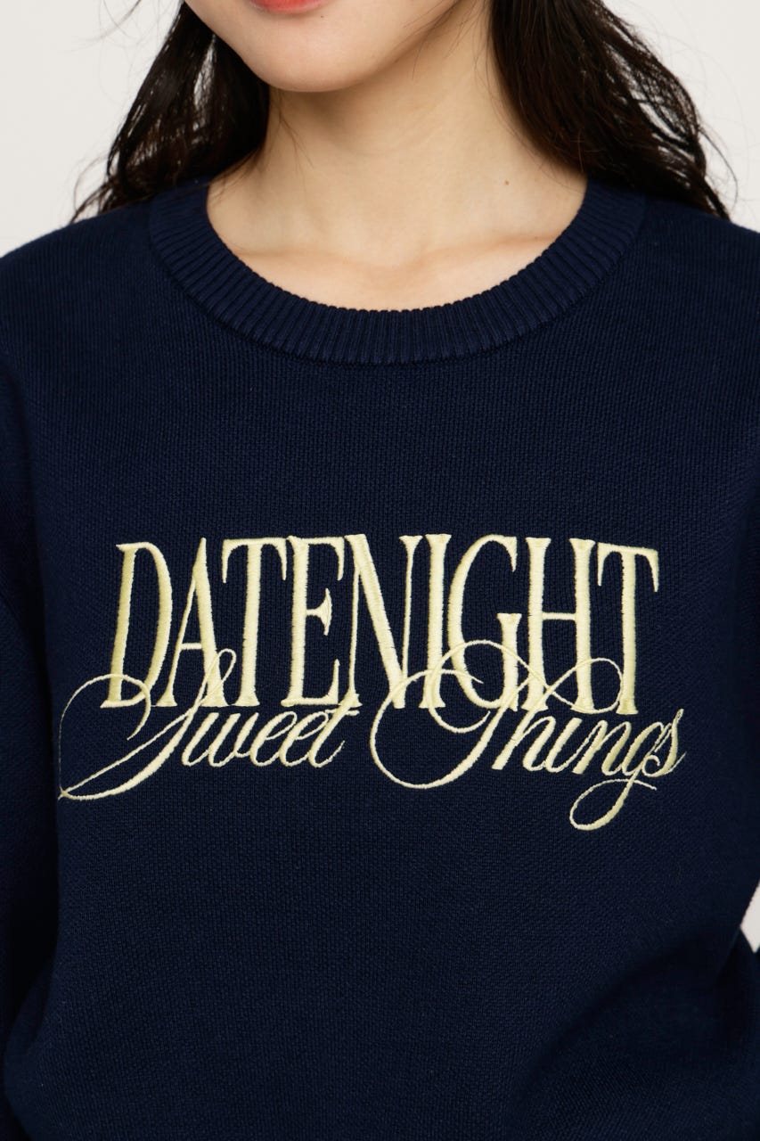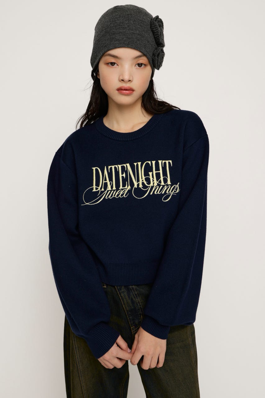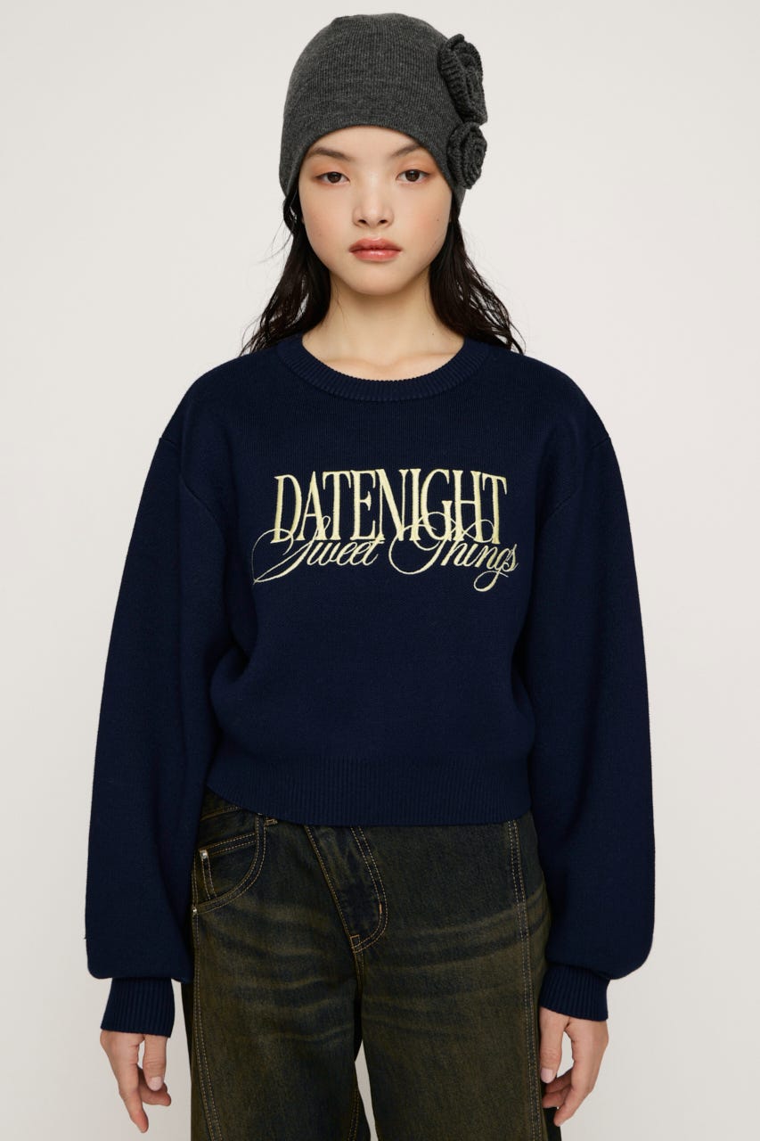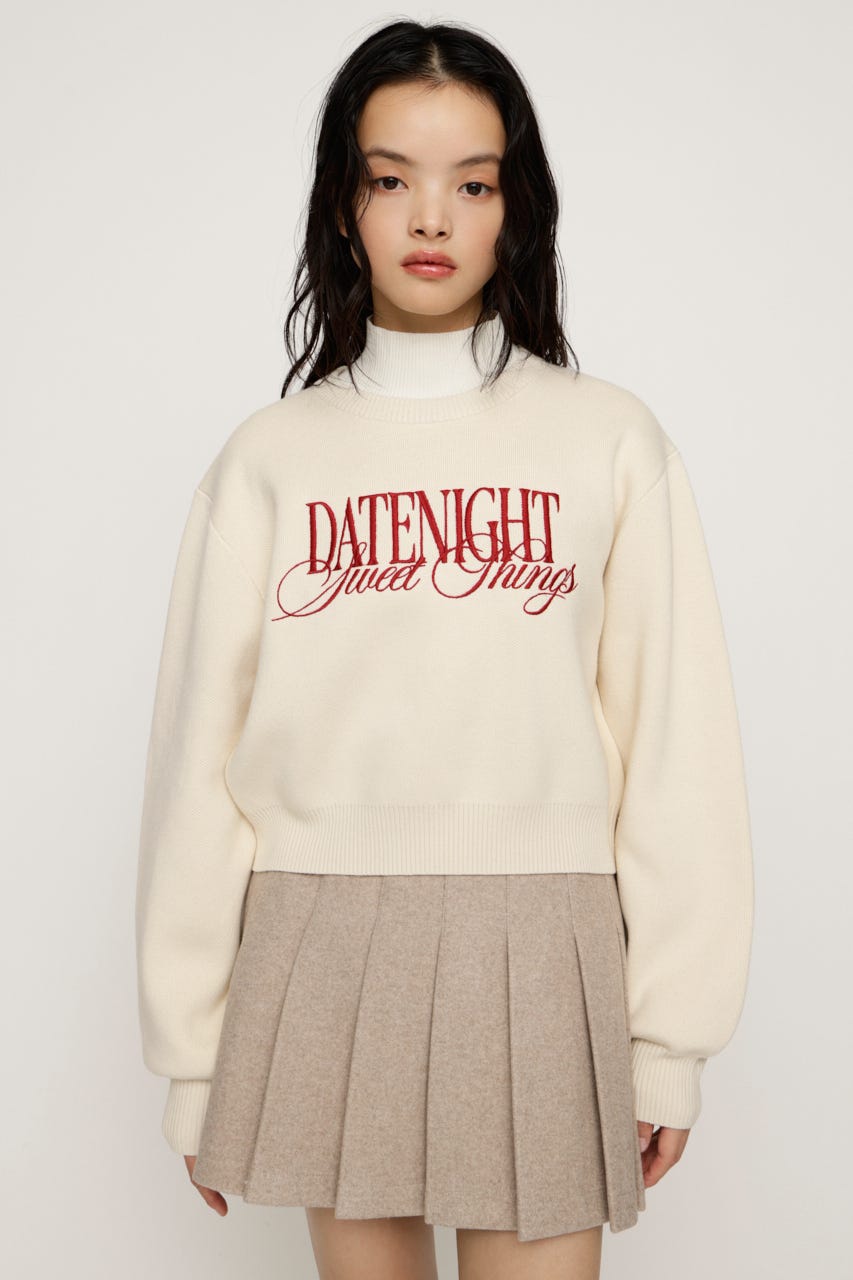 ホリデームードを高める刺繍ロゴが目を惹くニットトップス。