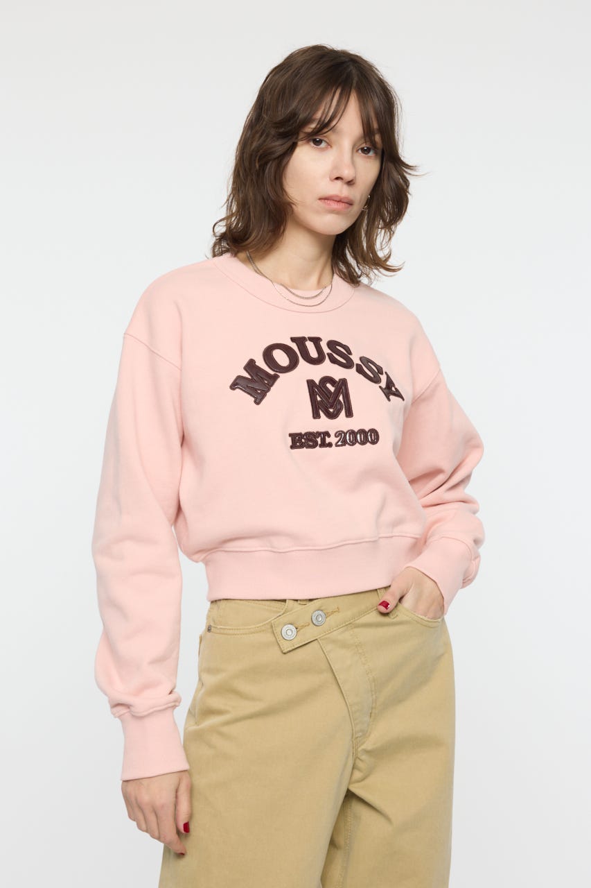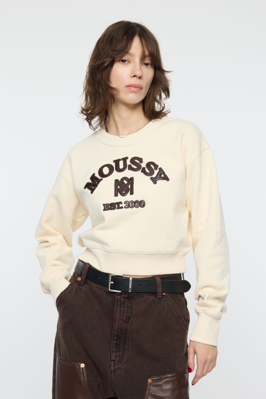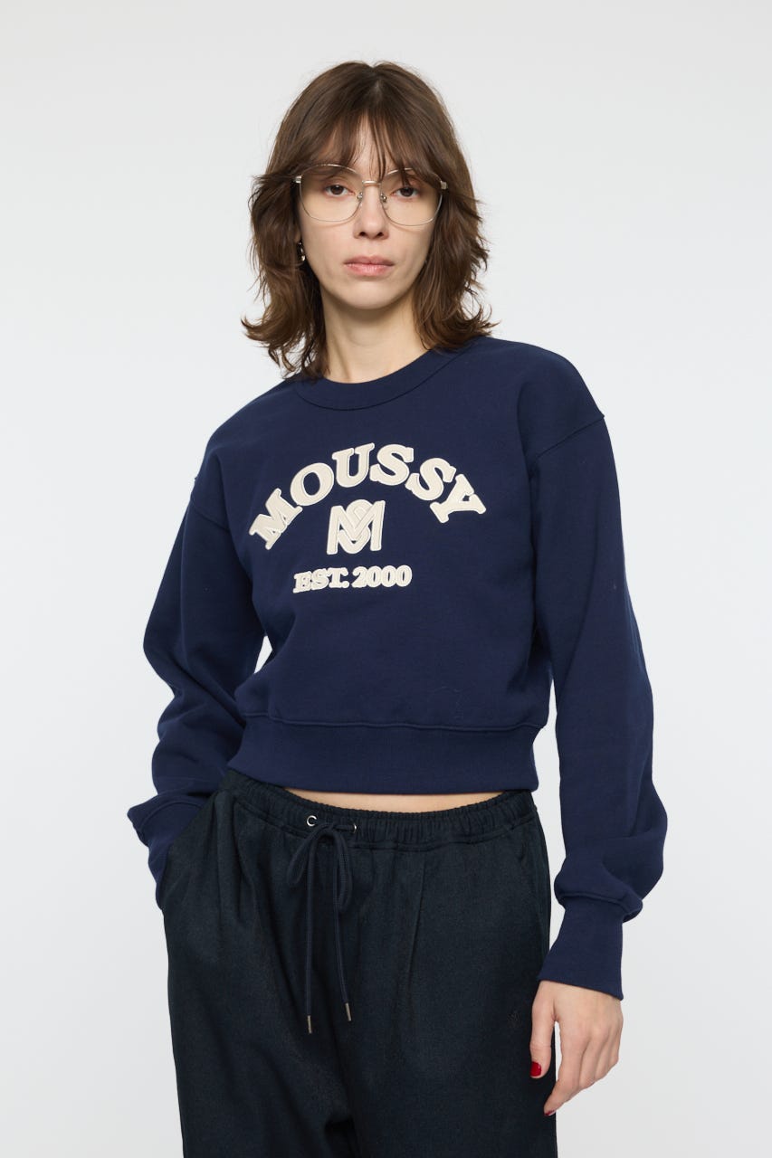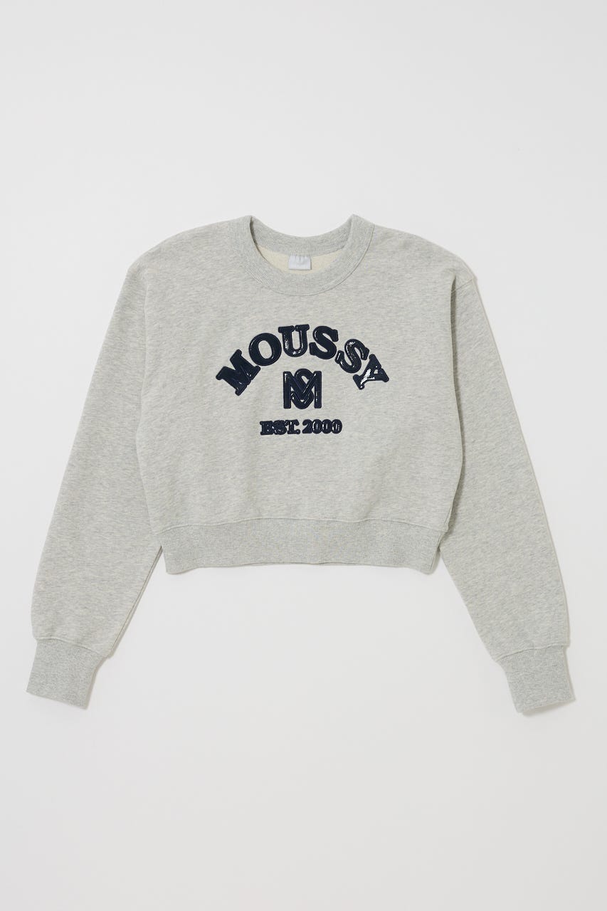 光沢のあるアップリケのロゴが映えるスウェットトップ。