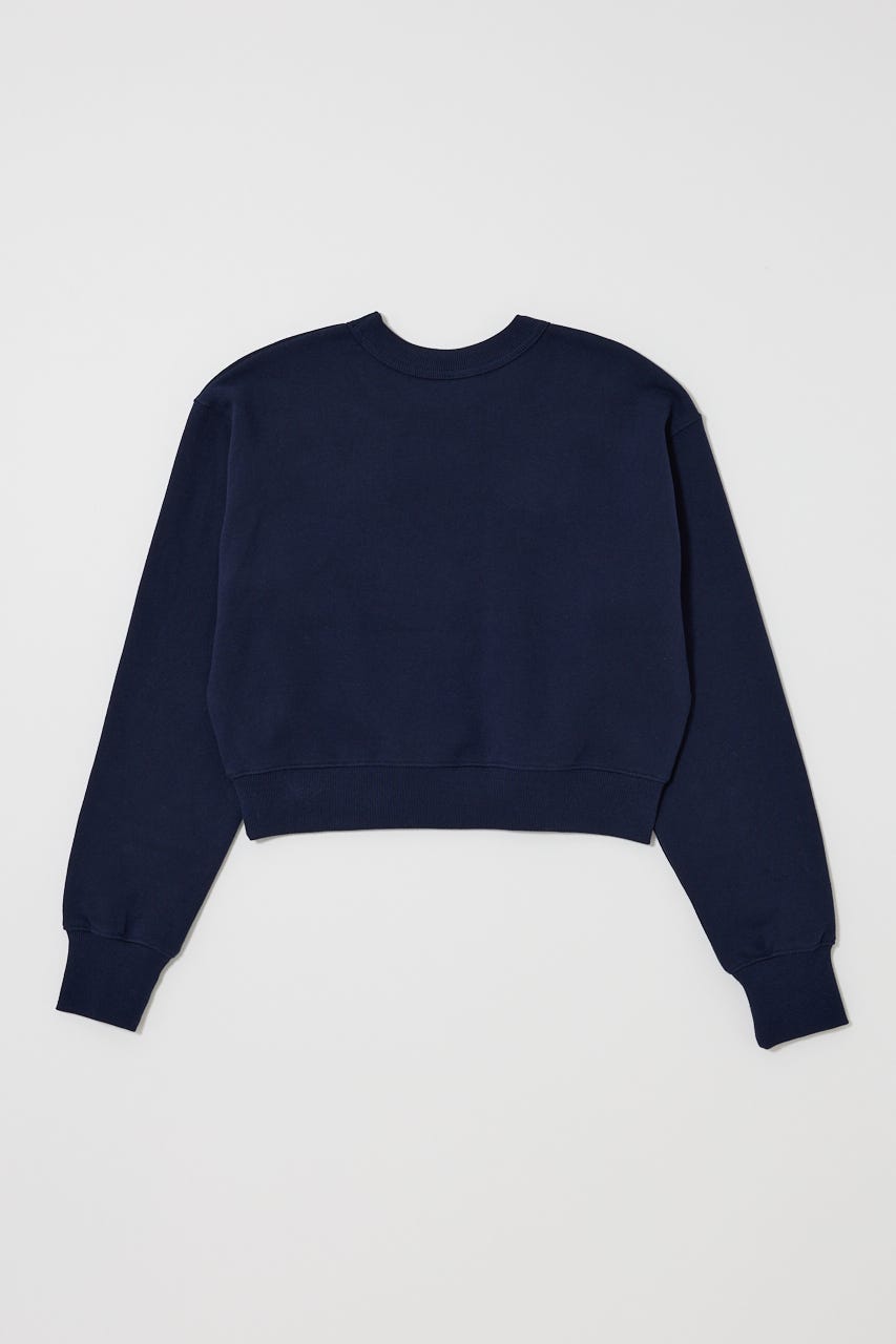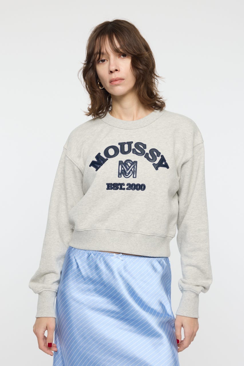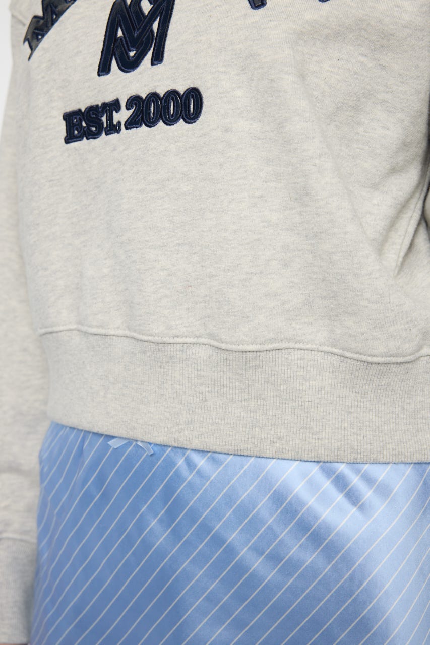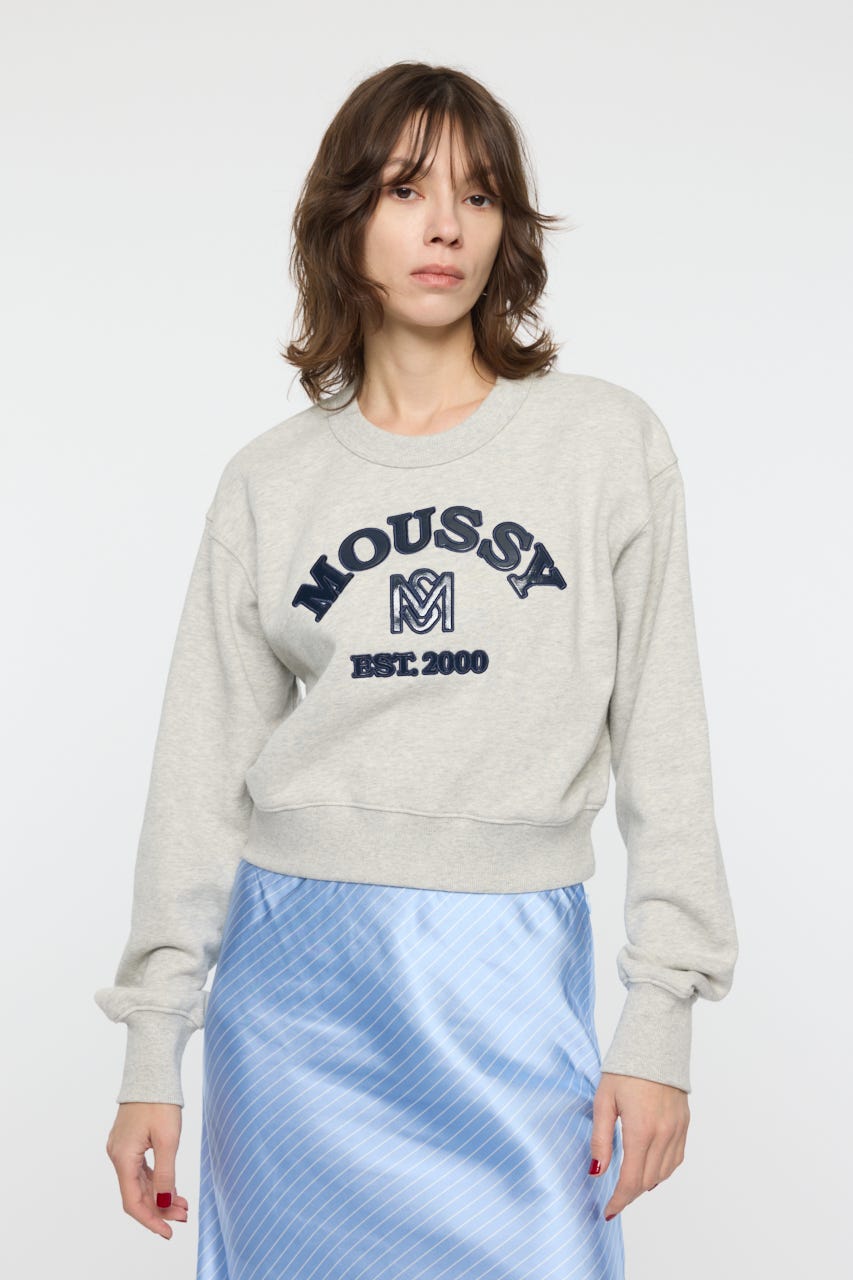 光沢のあるアップリケのロゴが映えるスウェットトップ。