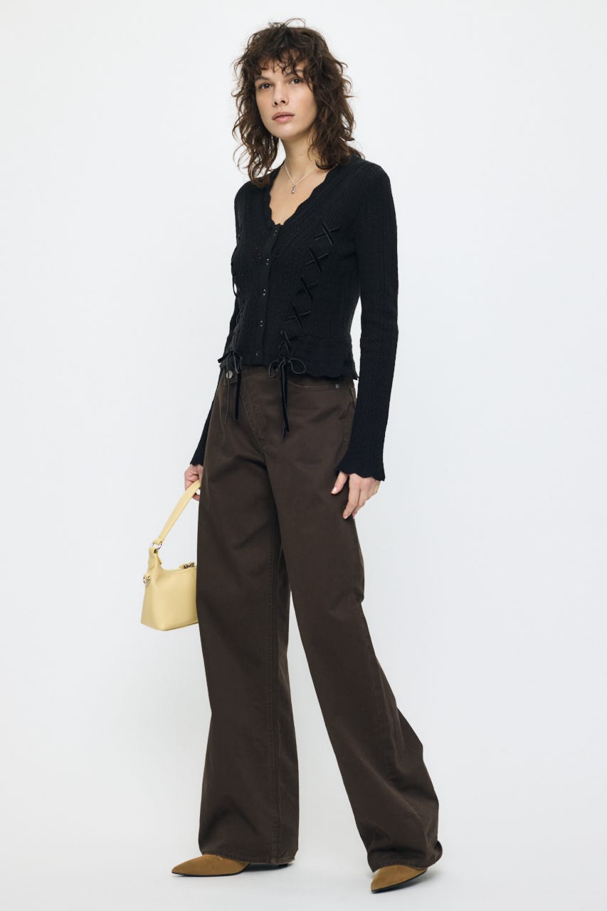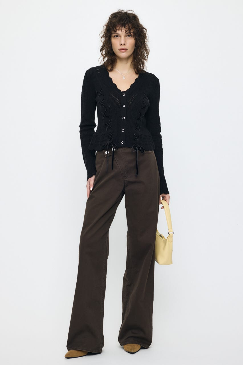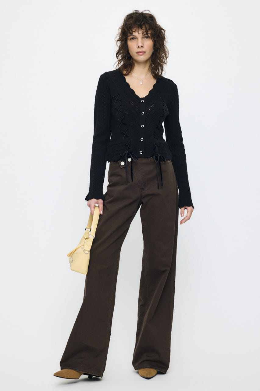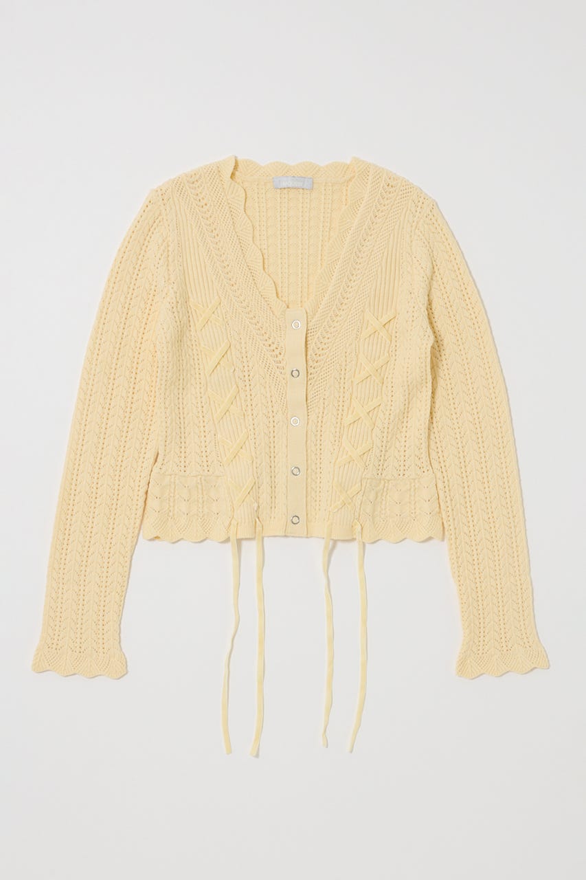 サイドにあしらったレースアップが目を惹くカーディガン。