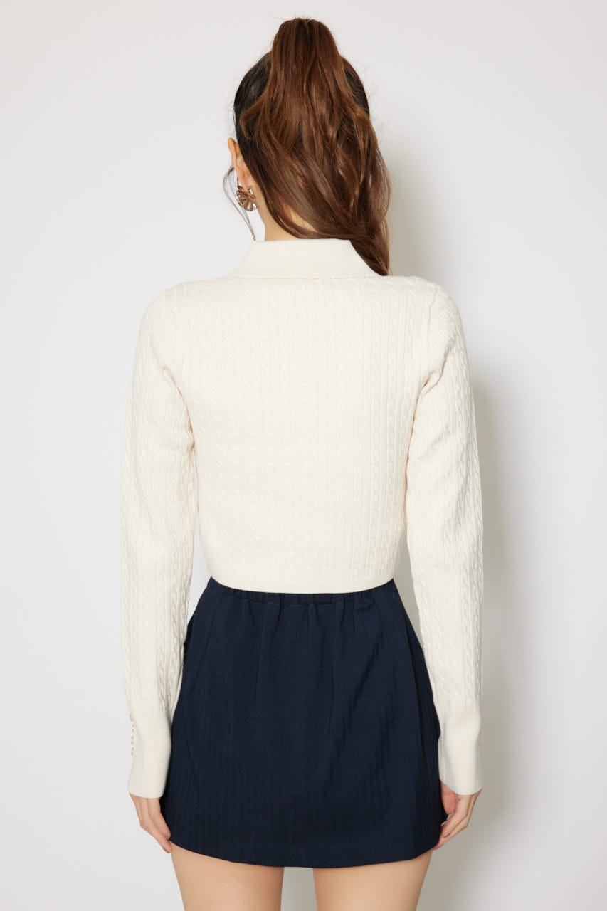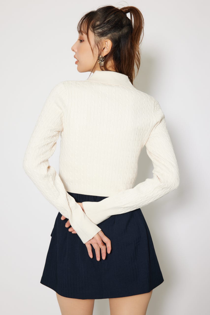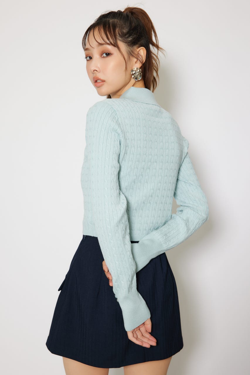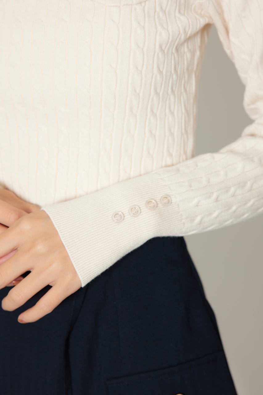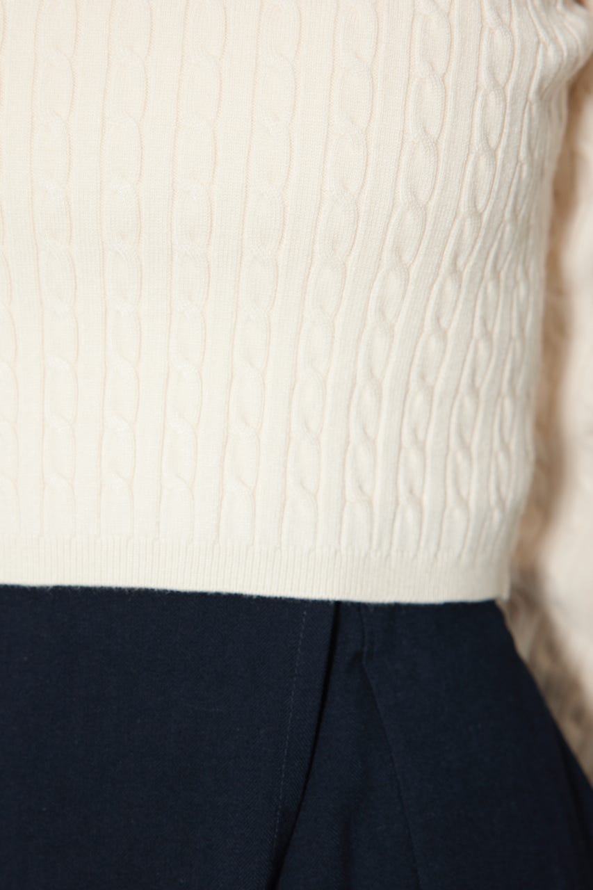 立体的なケーブル編みにより、ボディラインをぼかしつつも、クロップド丈に仕上げたのでバランスよく着ていただけます。