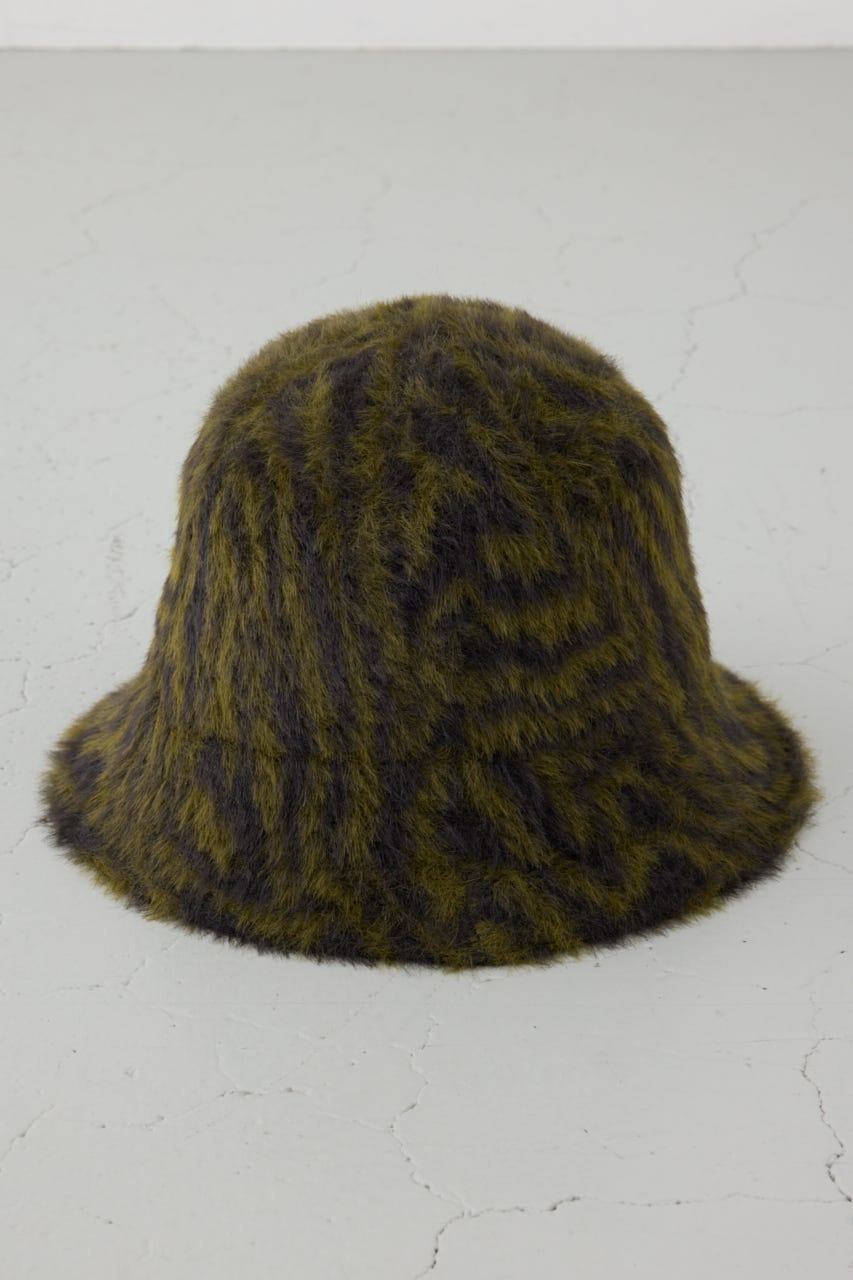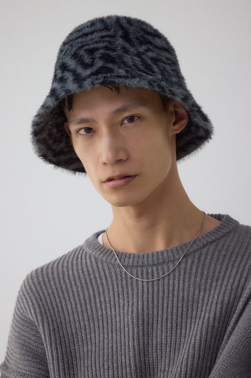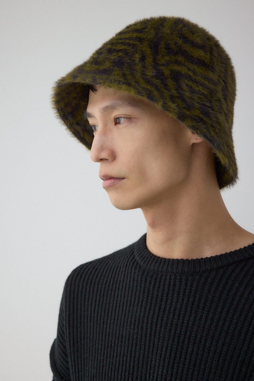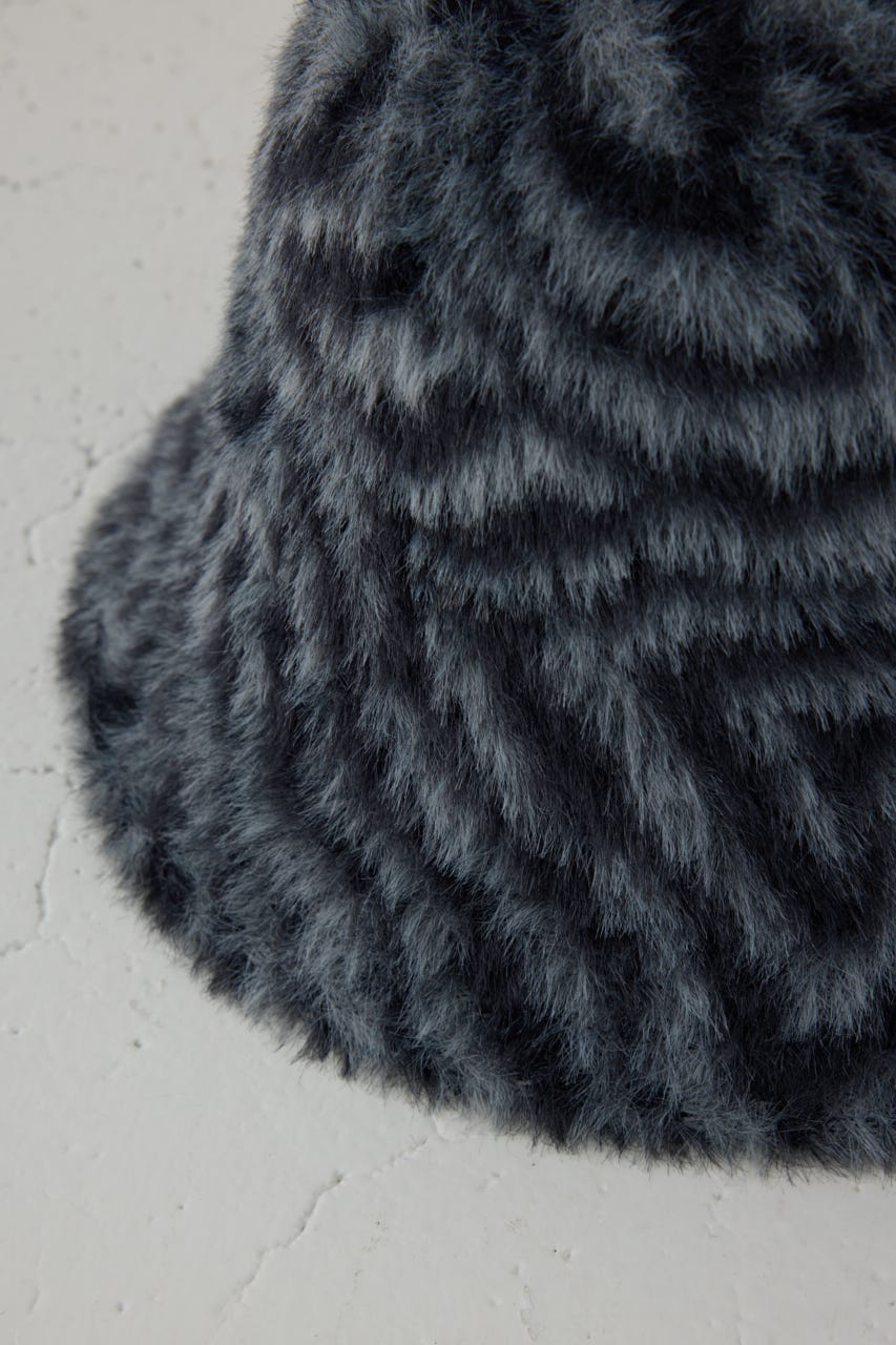 ゼブラの総柄が目をひくシャギー素材のバケットハットです。