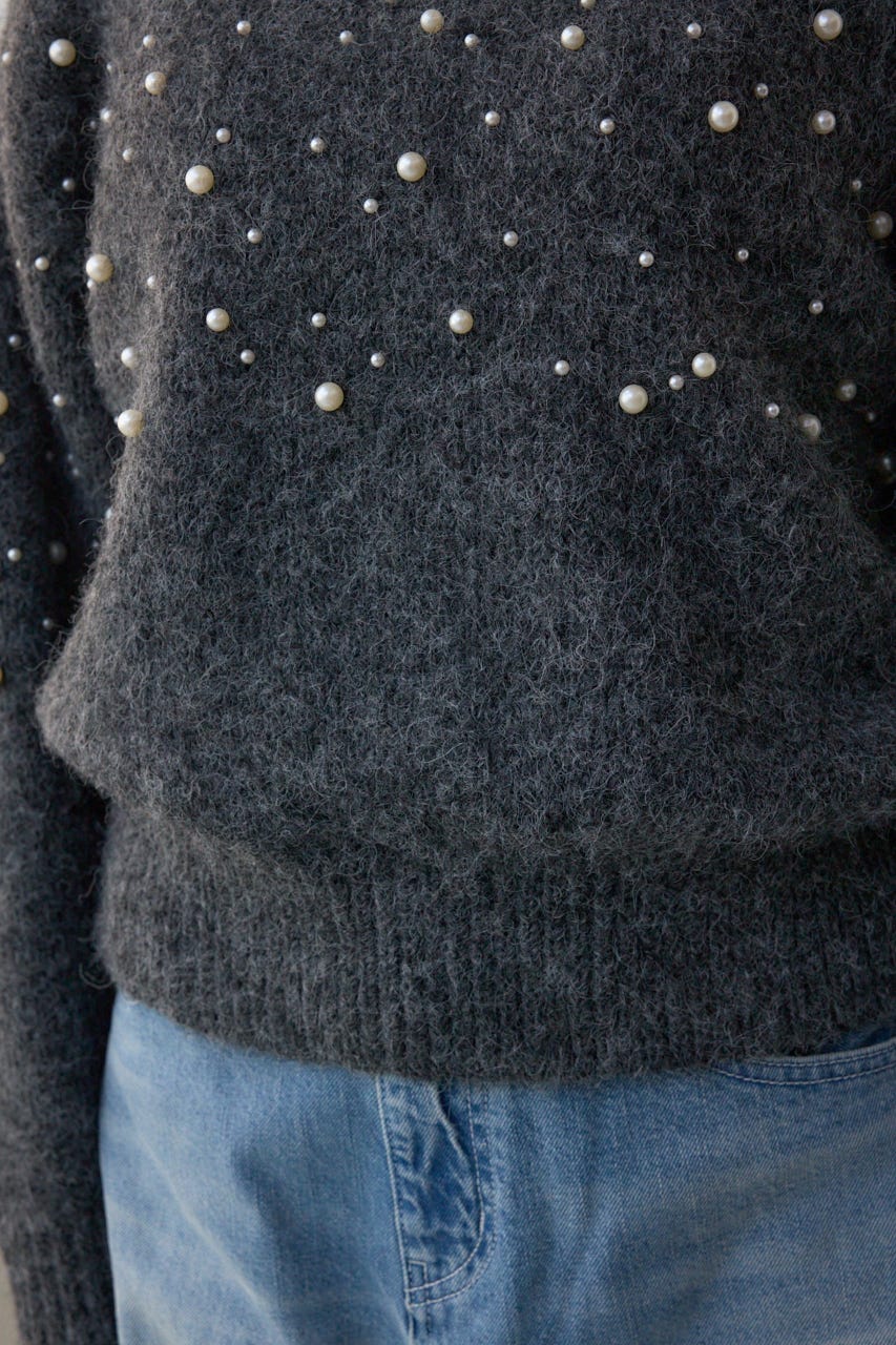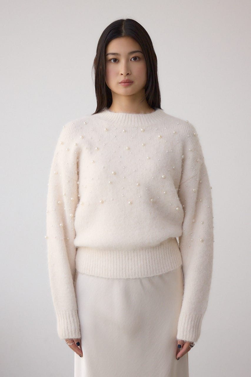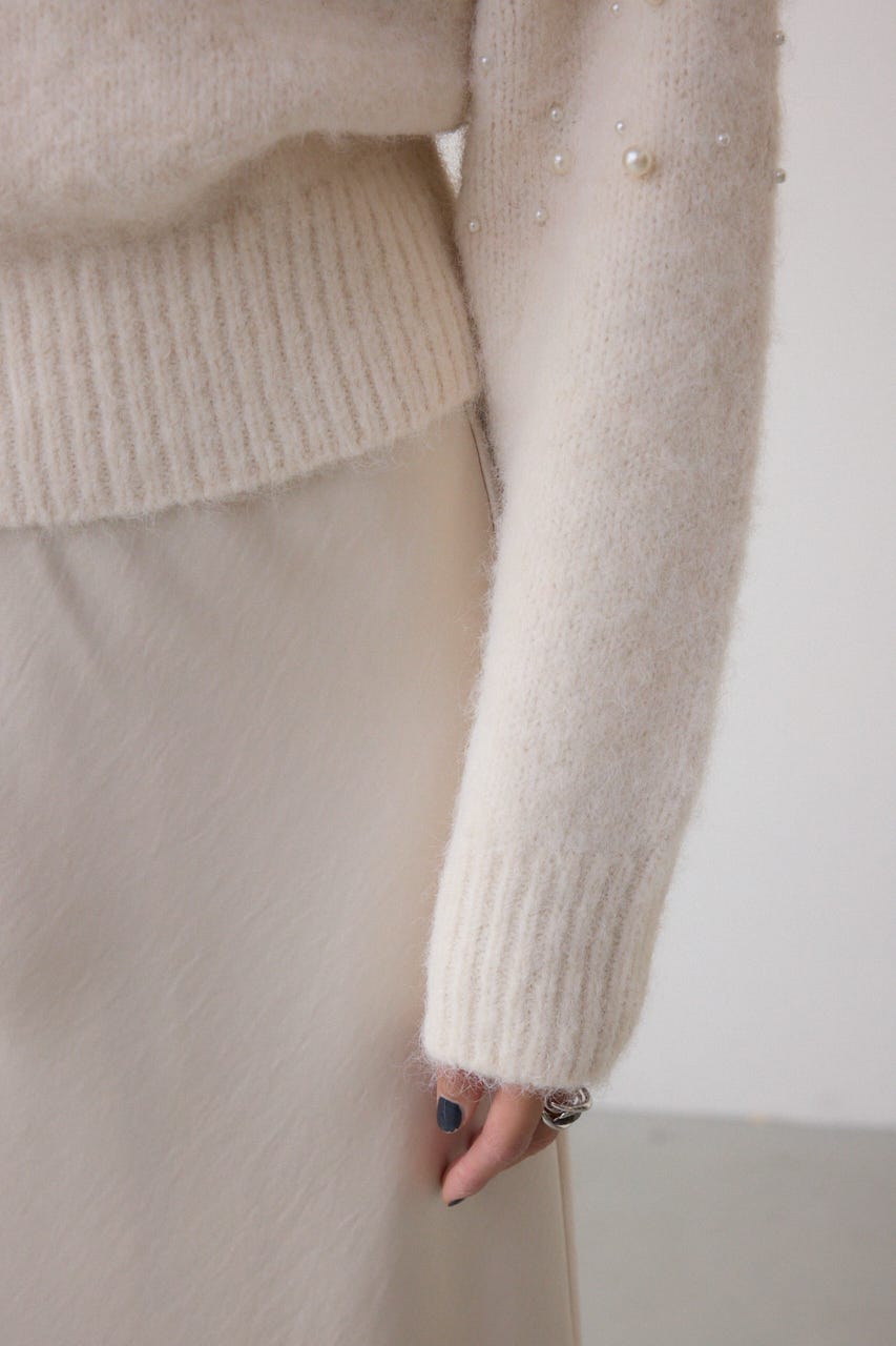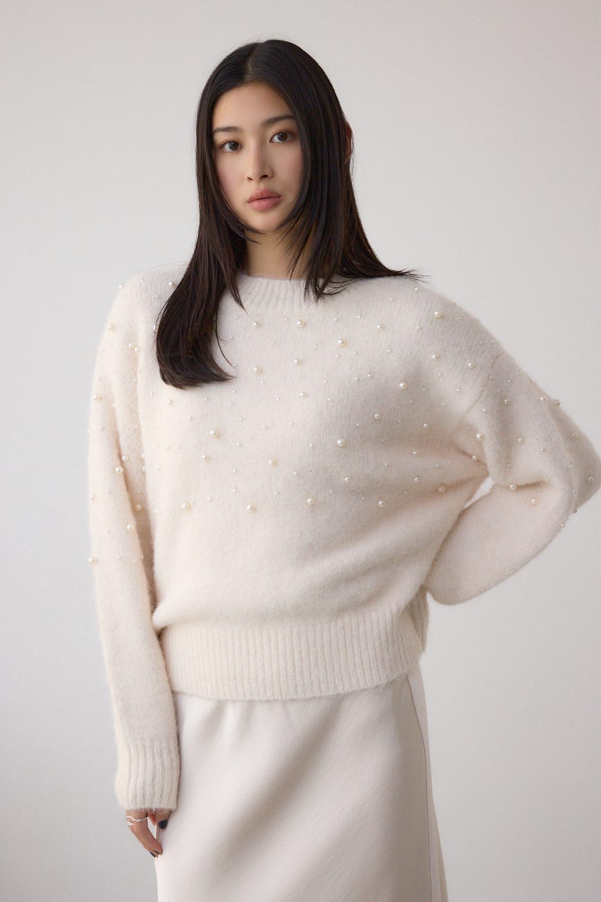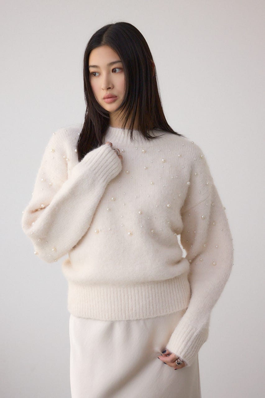 ふんわりとしたシャギー素材にパールを散りばめた、華やかさとフェミニンさを兼ね備えたニットプルオーバー。