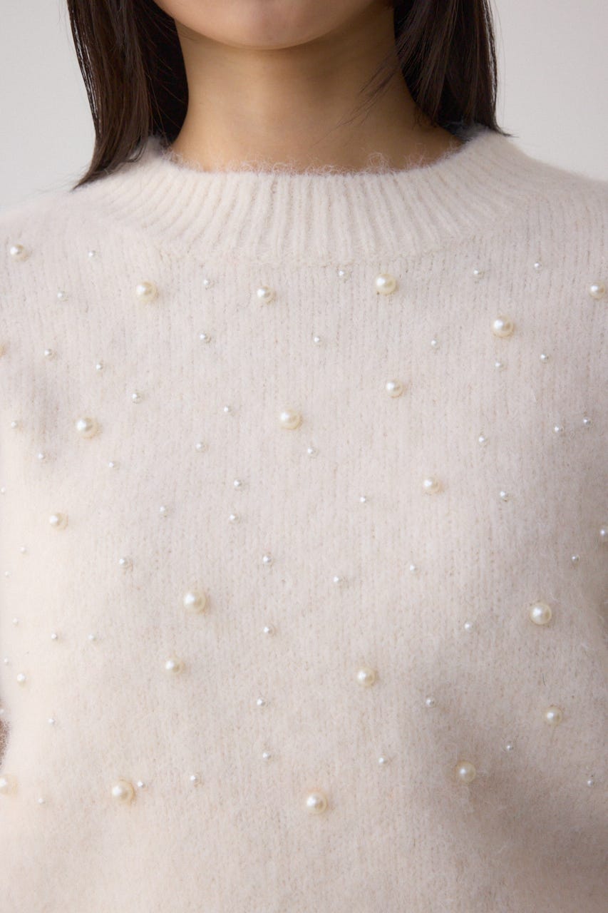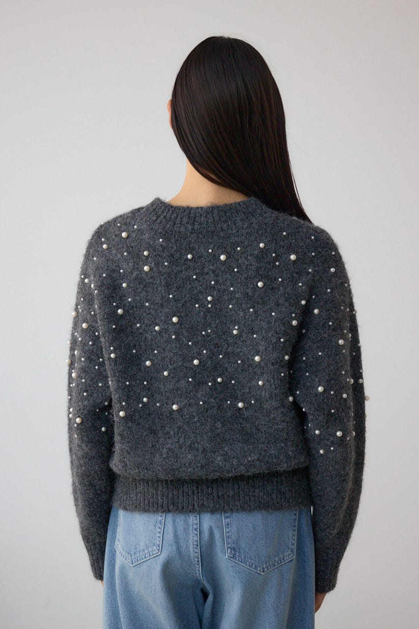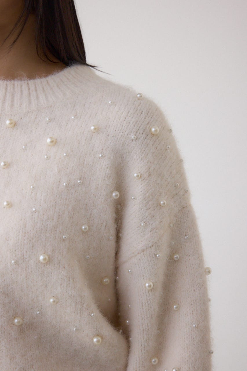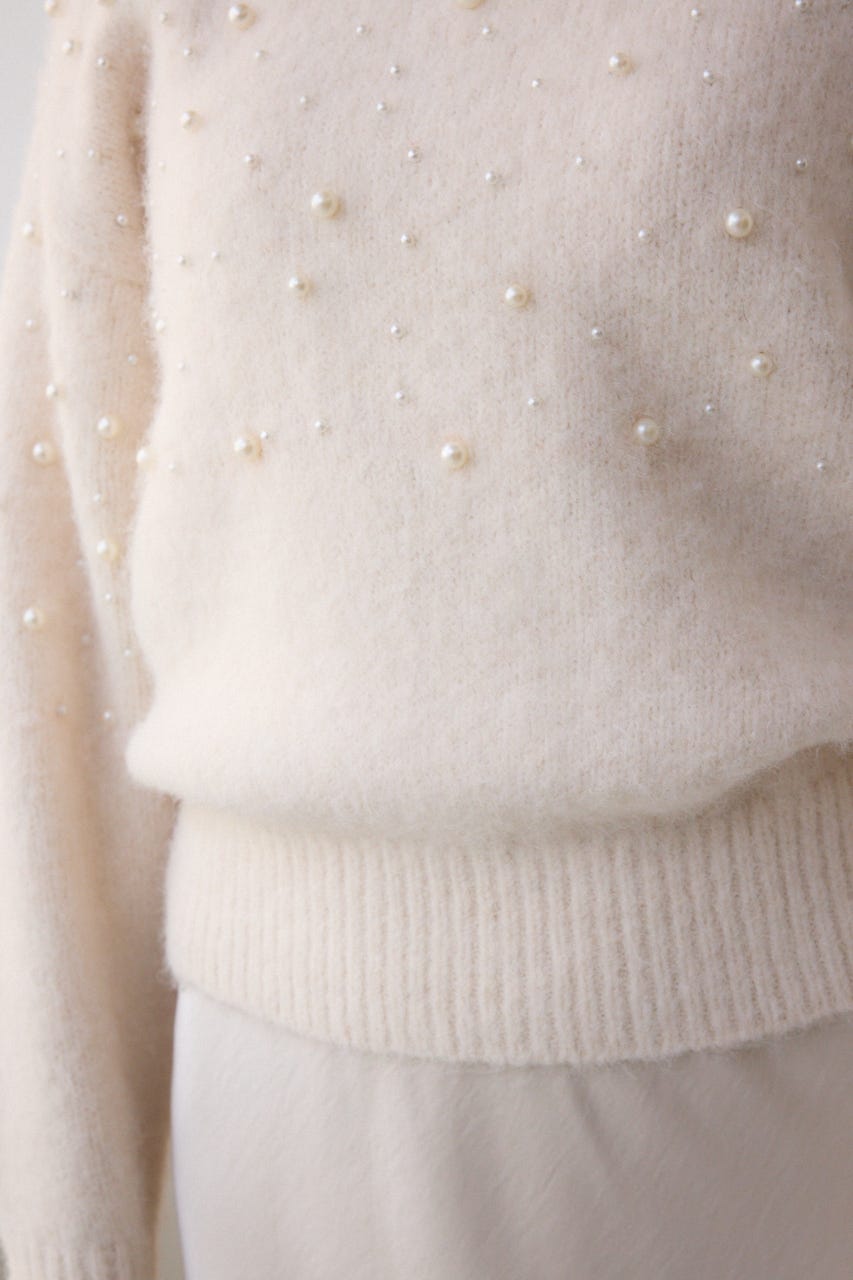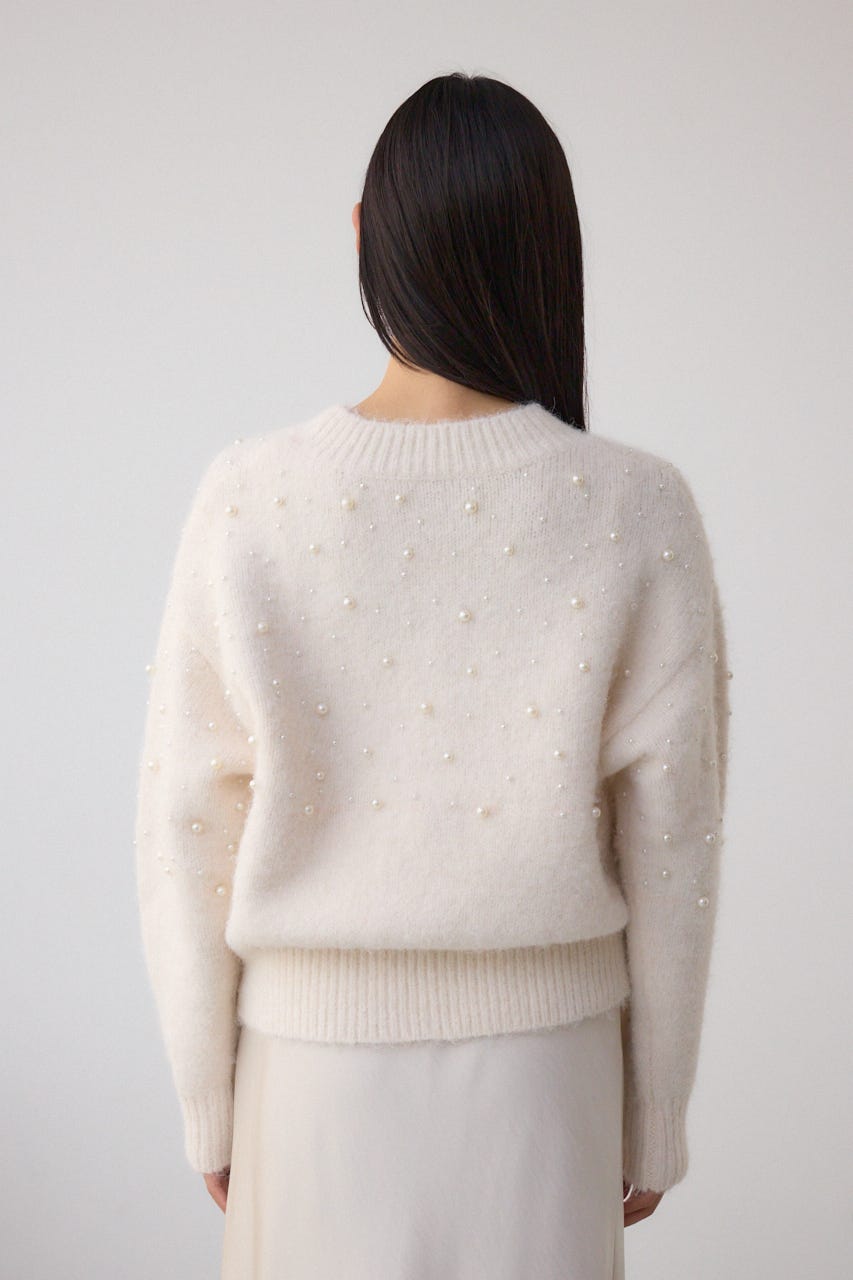 ふんわりとしたシャギー素材にパールを散りばめた、華やかさとフェミニンさを兼ね備えたニットプルオーバー。