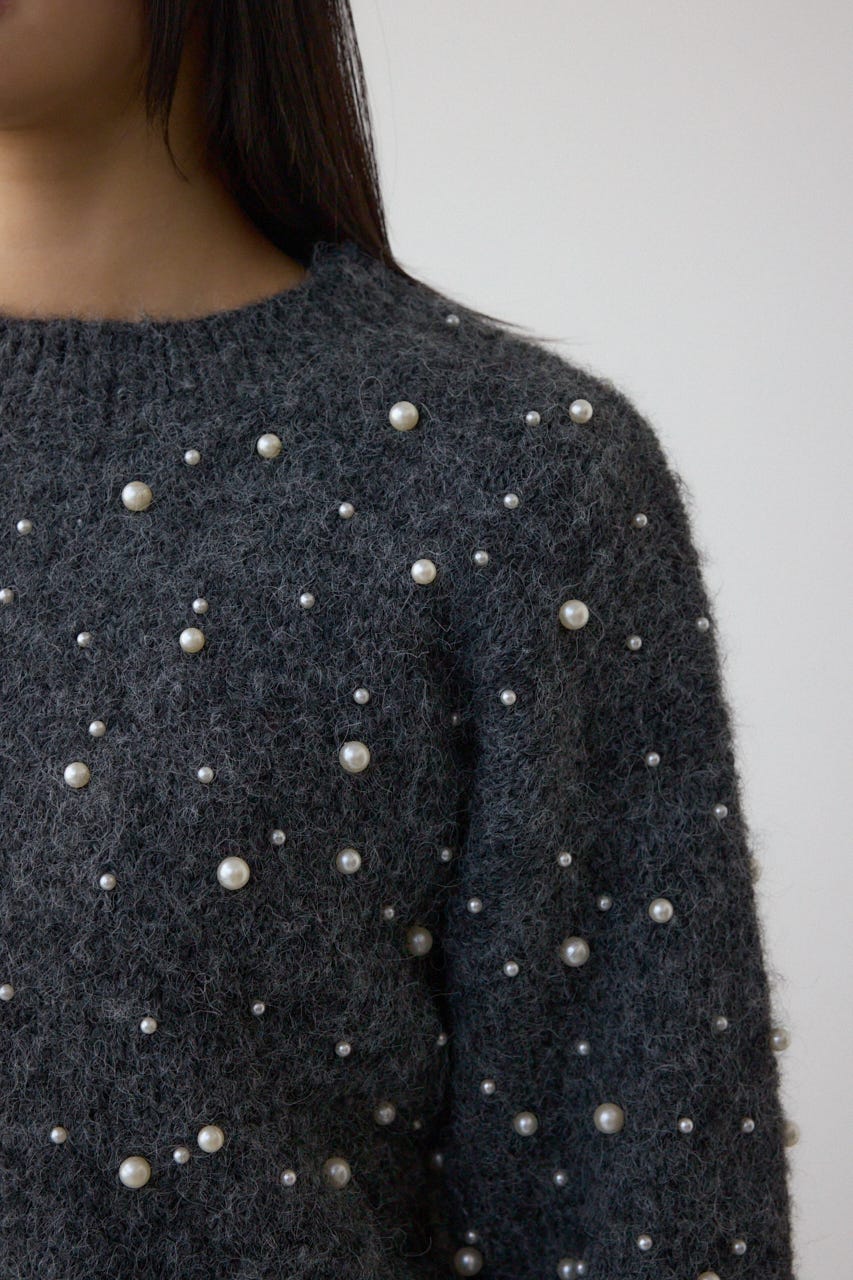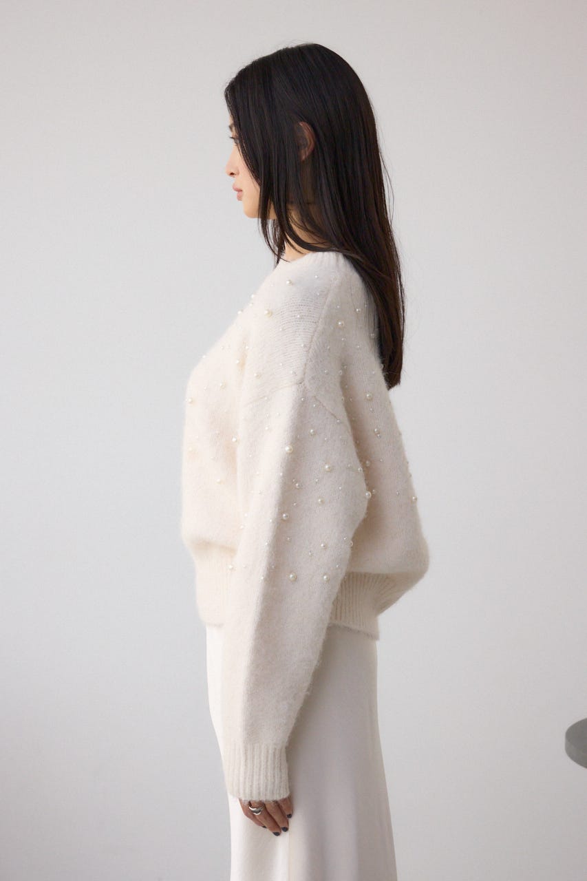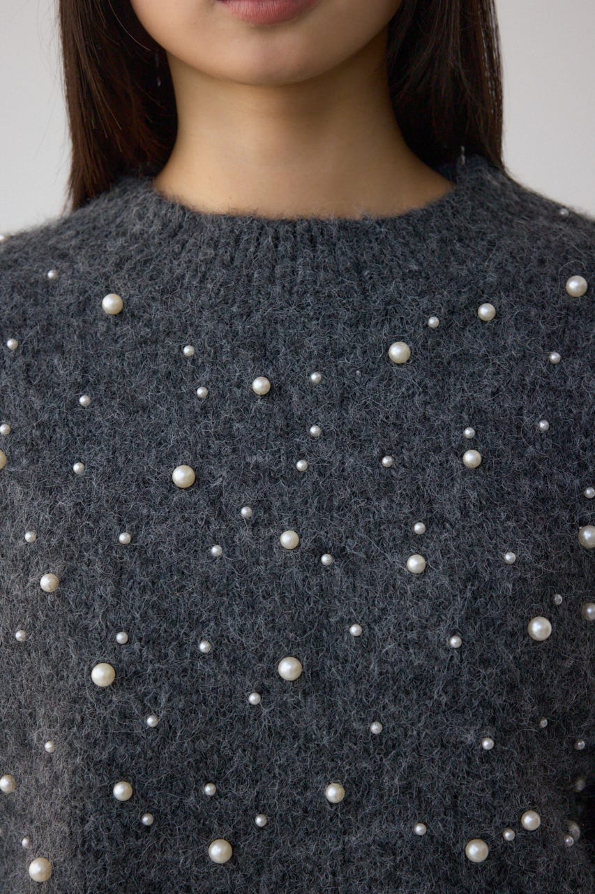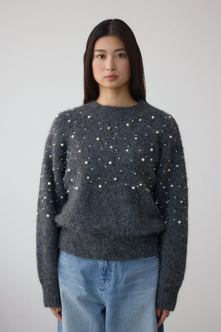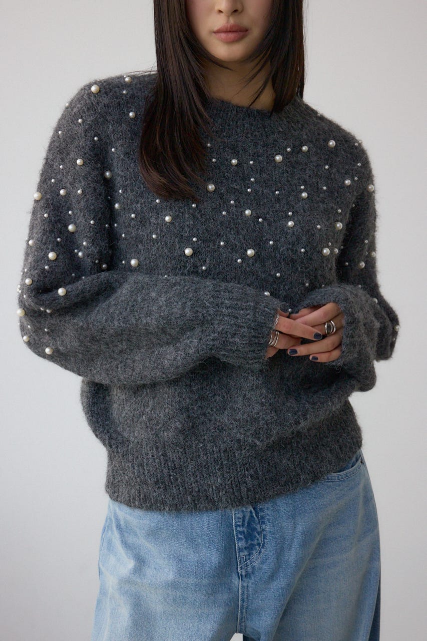 ふんわりとしたシャギー素材にパールを散りばめた、華やかさとフェミニンさを兼ね備えたニットプルオーバー。