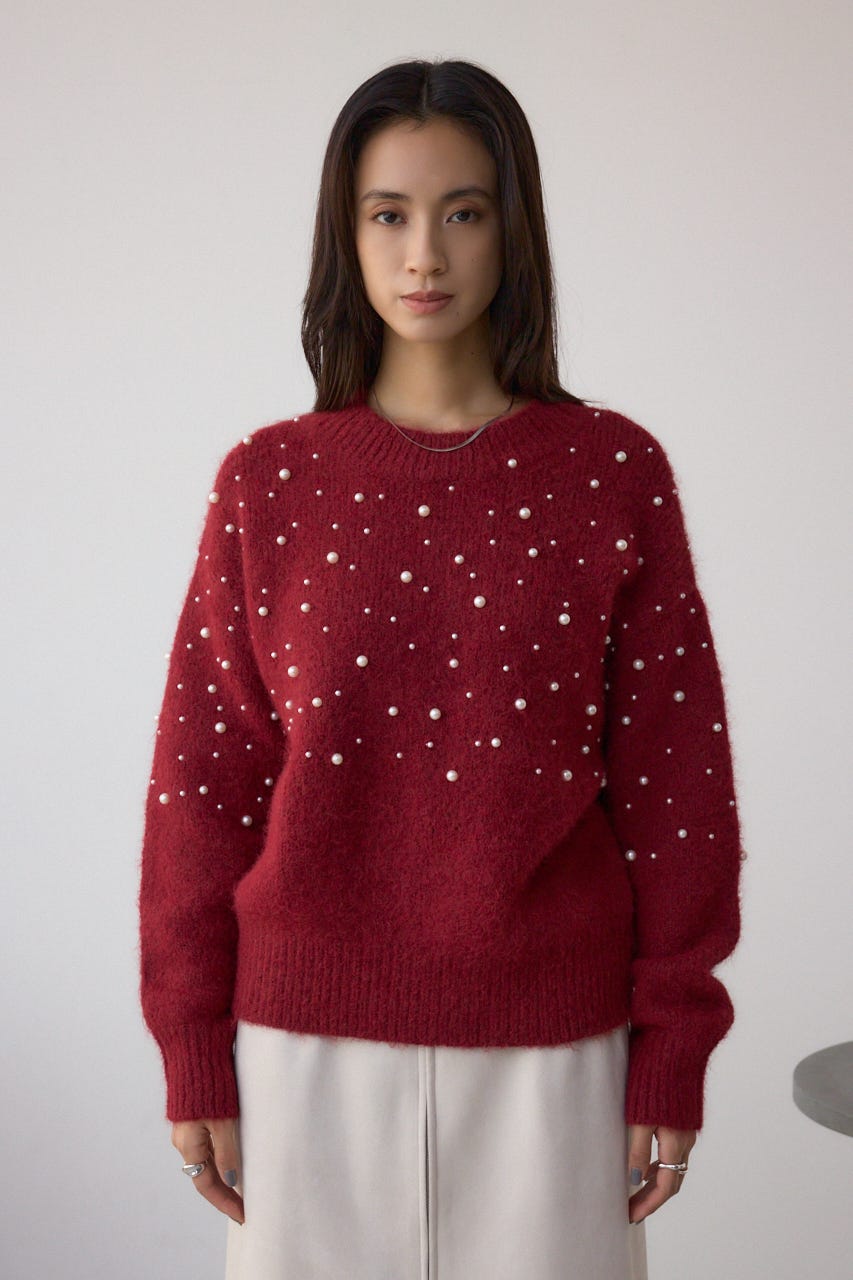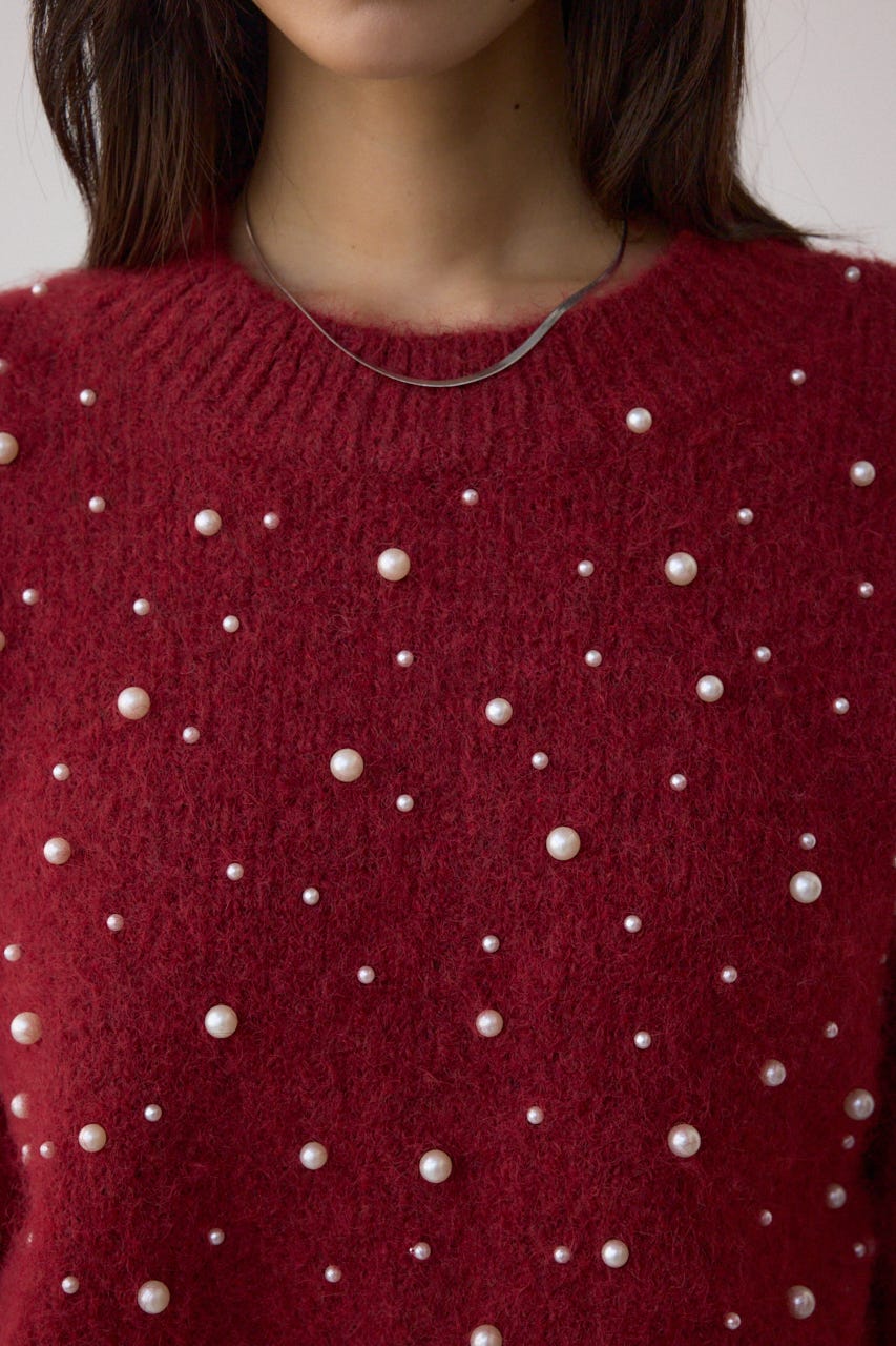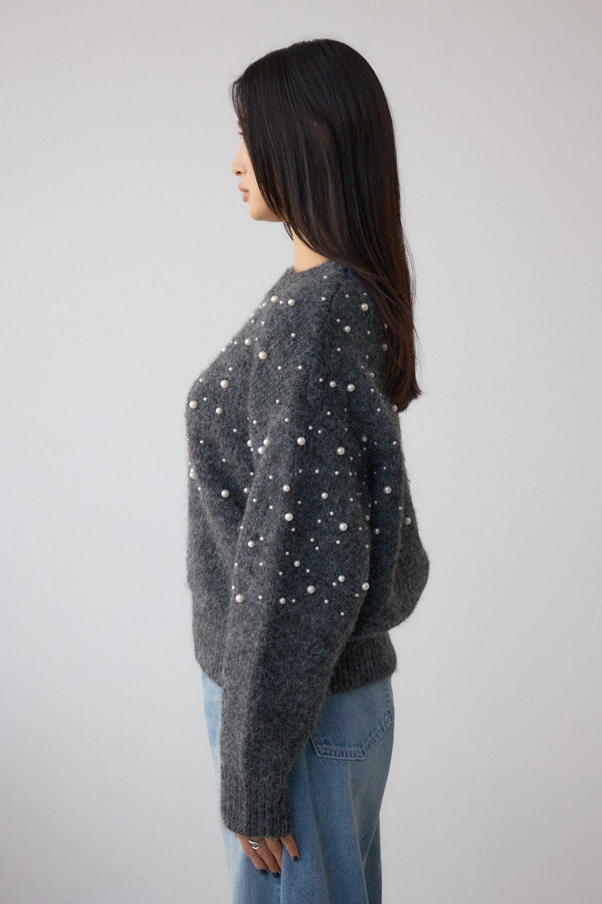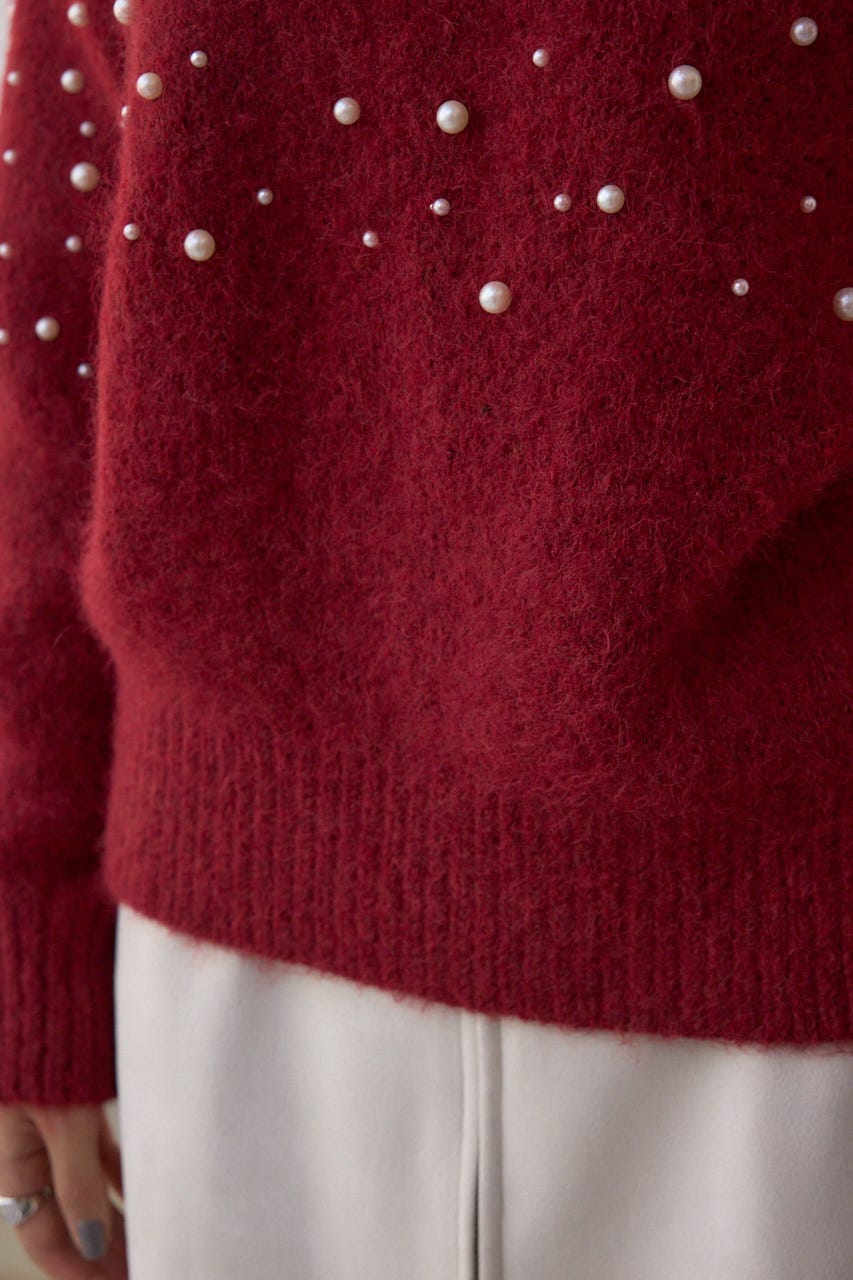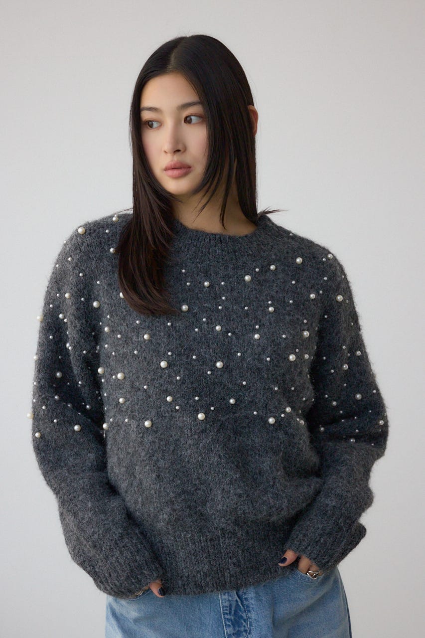 ふんわりとしたシャギー素材にパールを散りばめた、華やかさとフェミニンさを兼ね備えたニットプルオーバー。