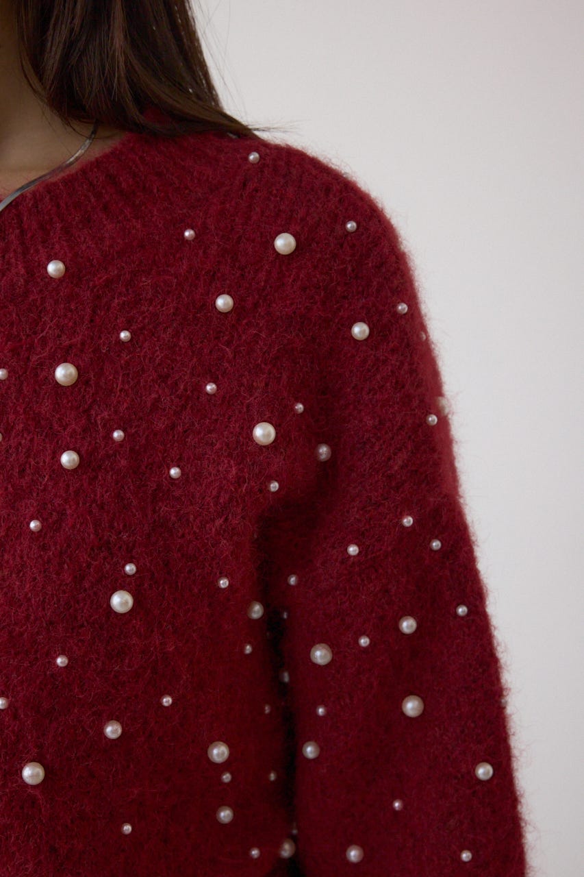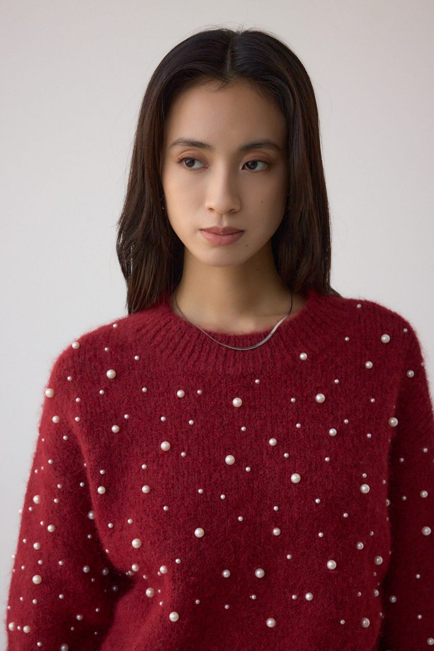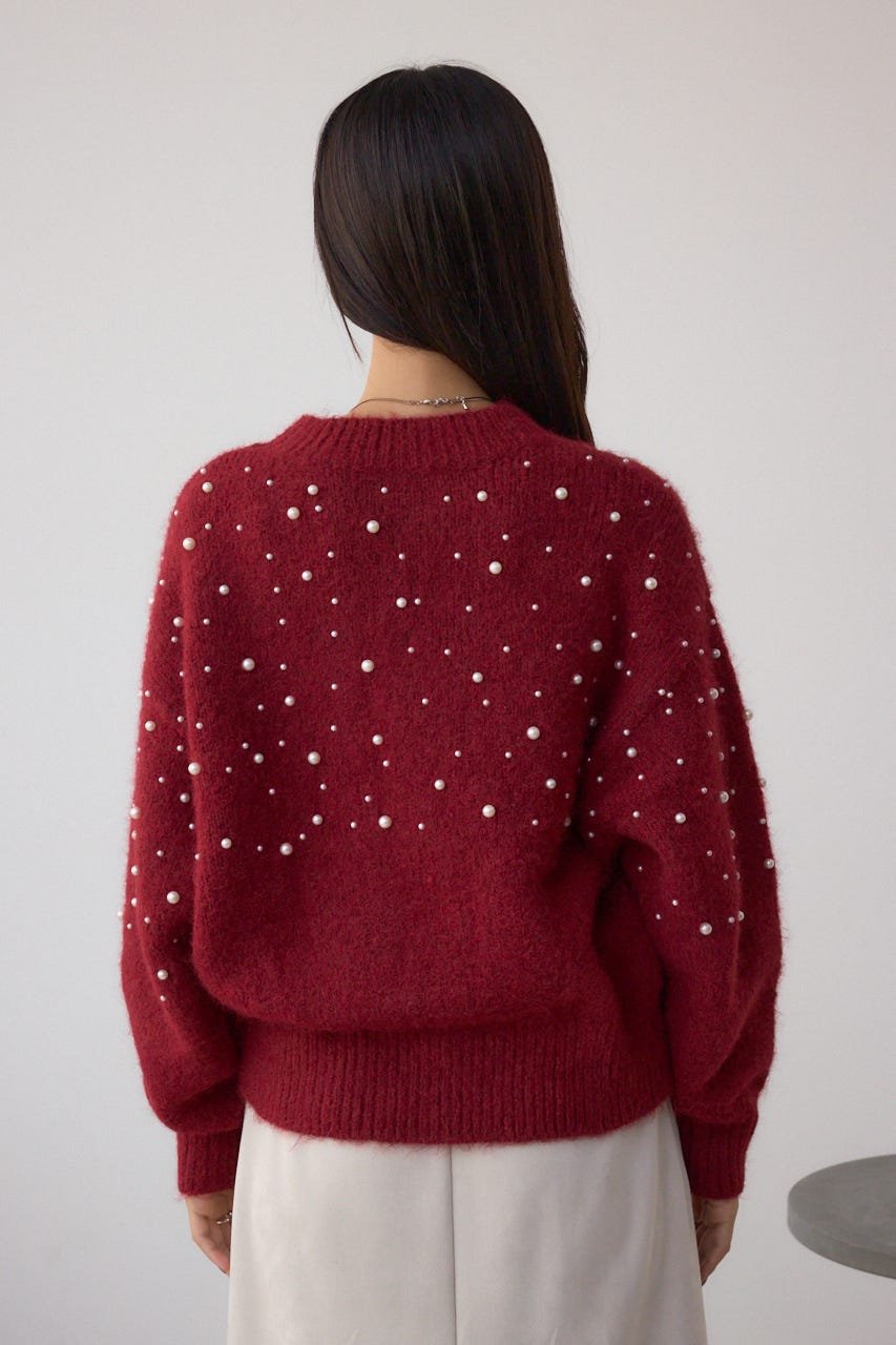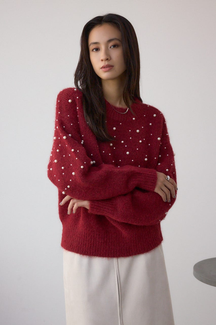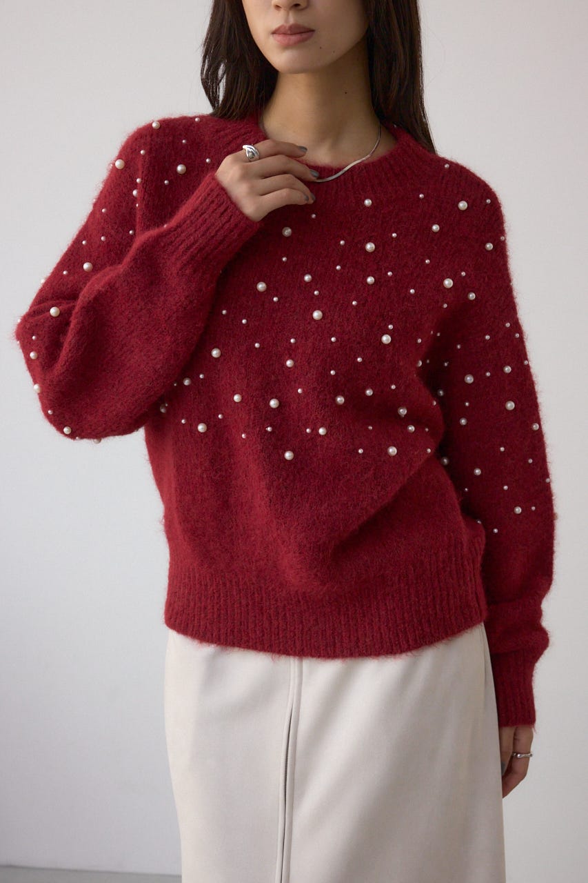 ふんわりとしたシャギー素材にパールを散りばめた、華やかさとフェミニンさを兼ね備えたニットプルオーバー。