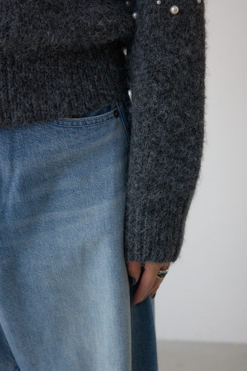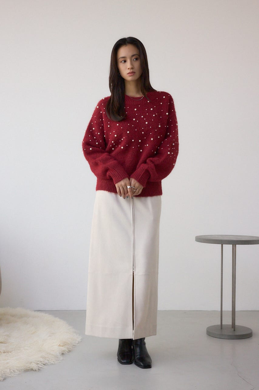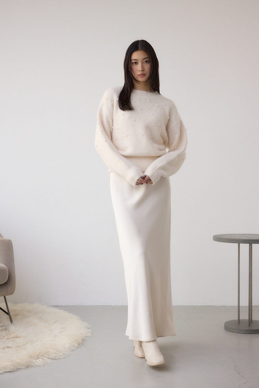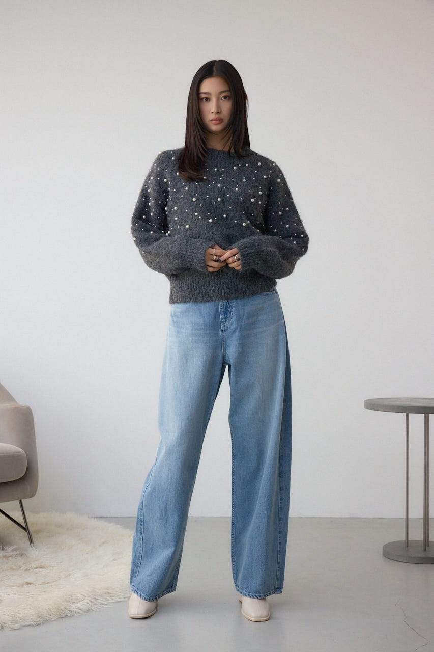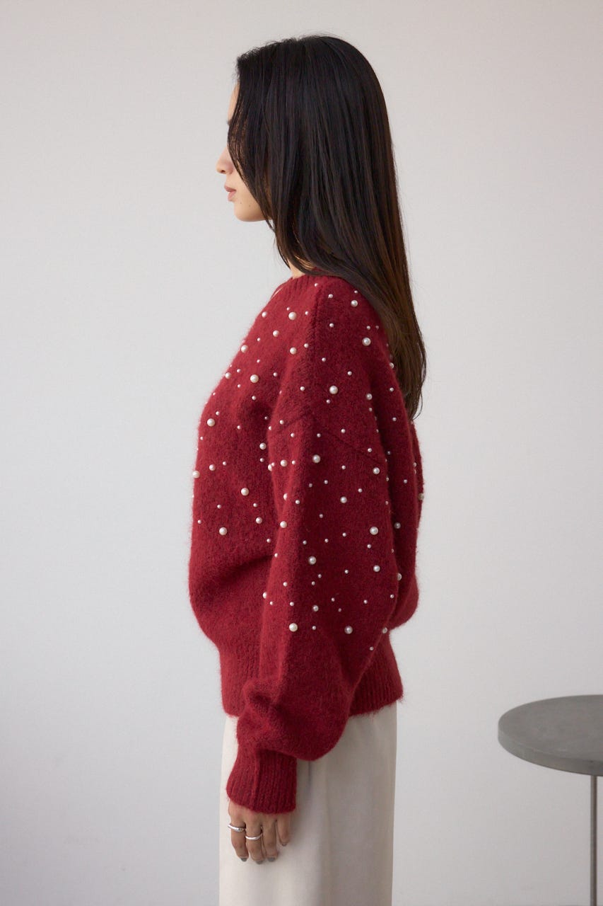 ふんわりとしたシャギー素材にパールを散りばめた、華やかさとフェミニンさを兼ね備えたニットプルオーバー。