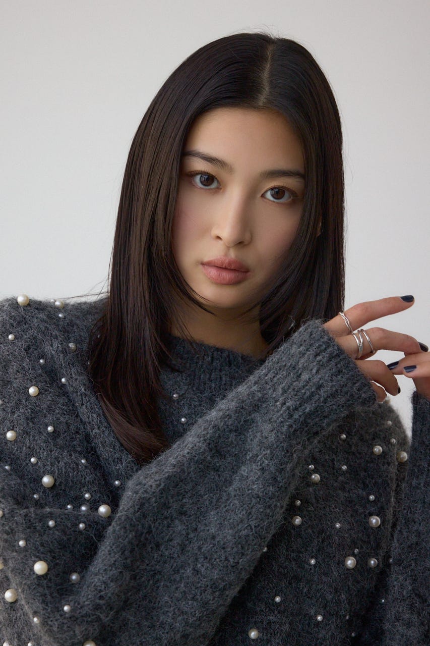ランダムにあしらったパールが上品なアクセントとなり、1枚で主役級の存在感を放ちます。