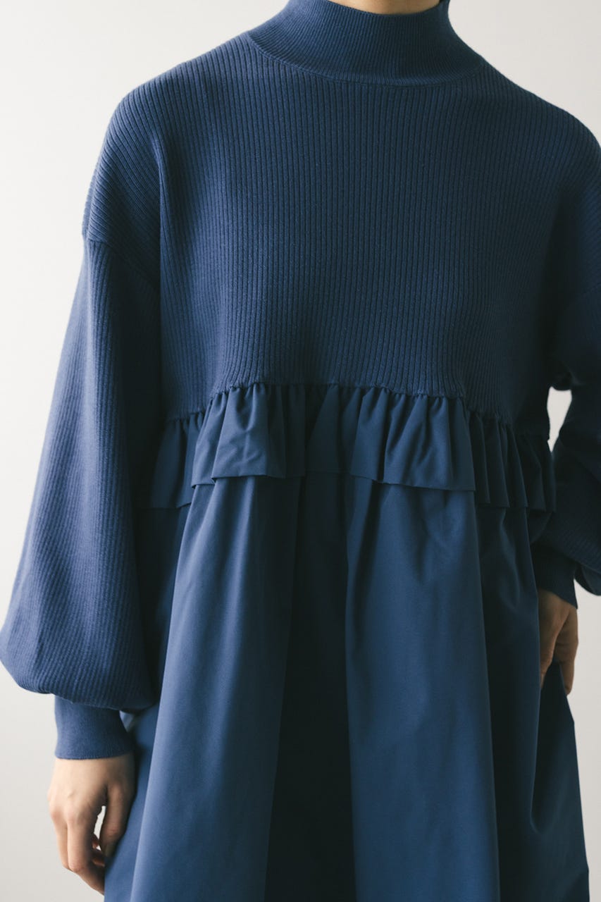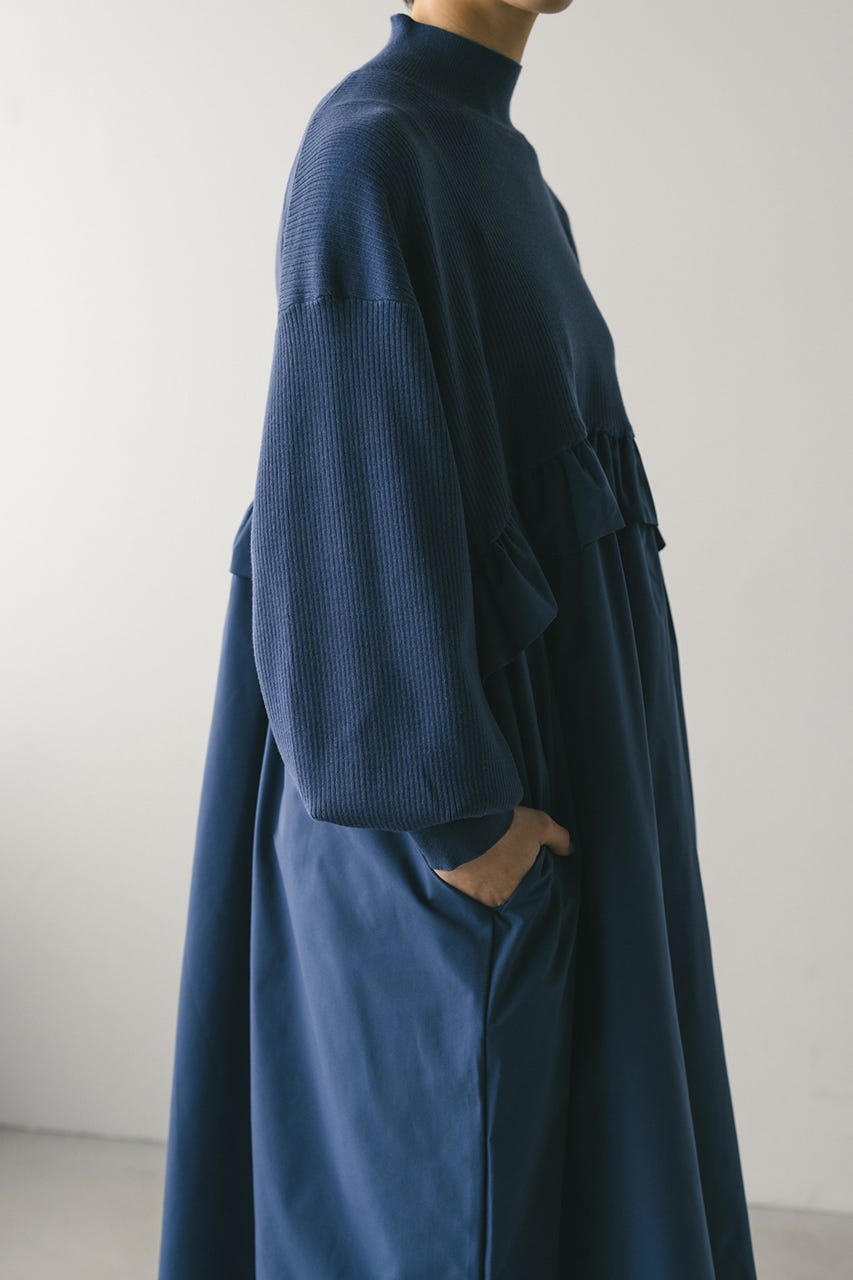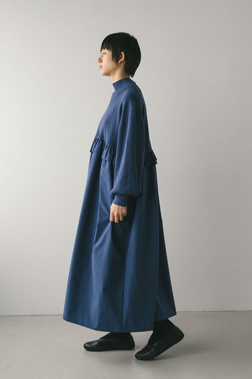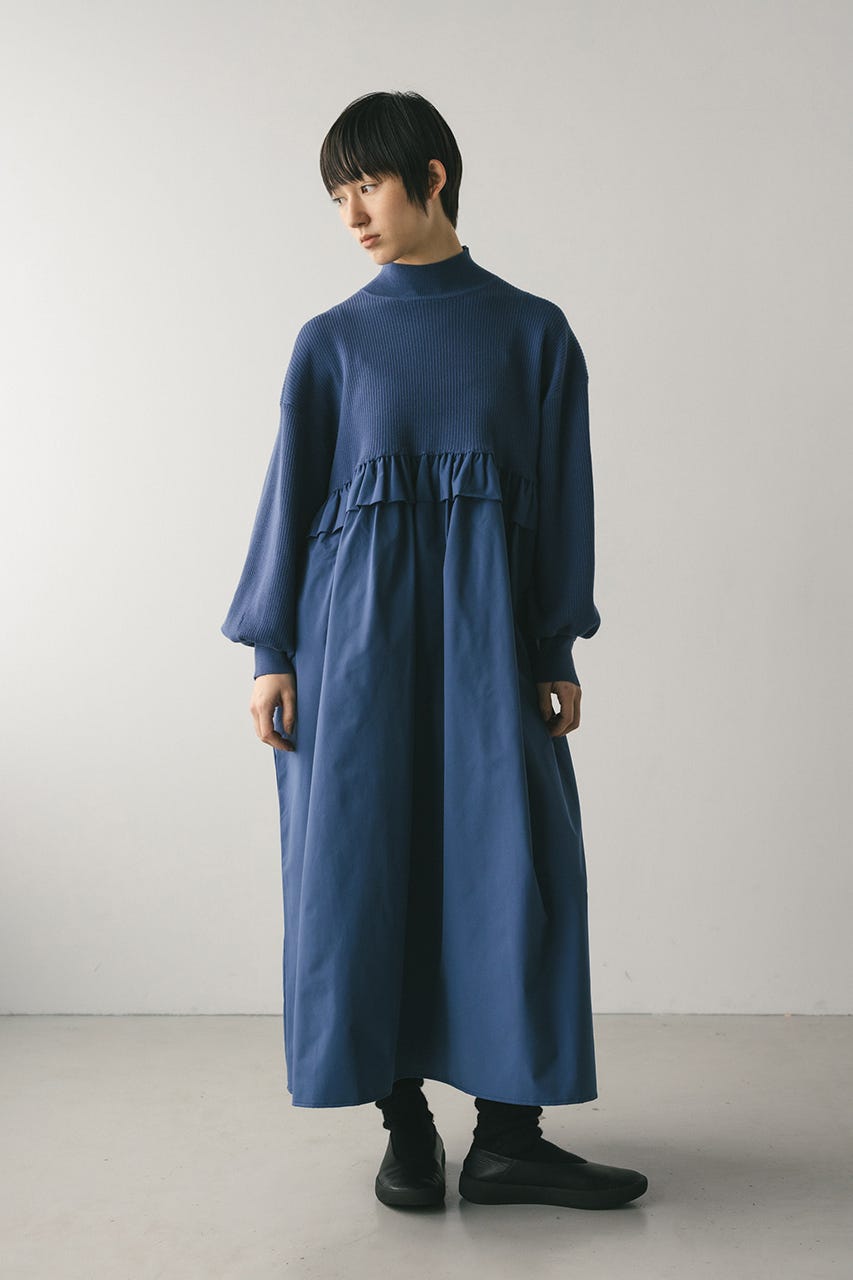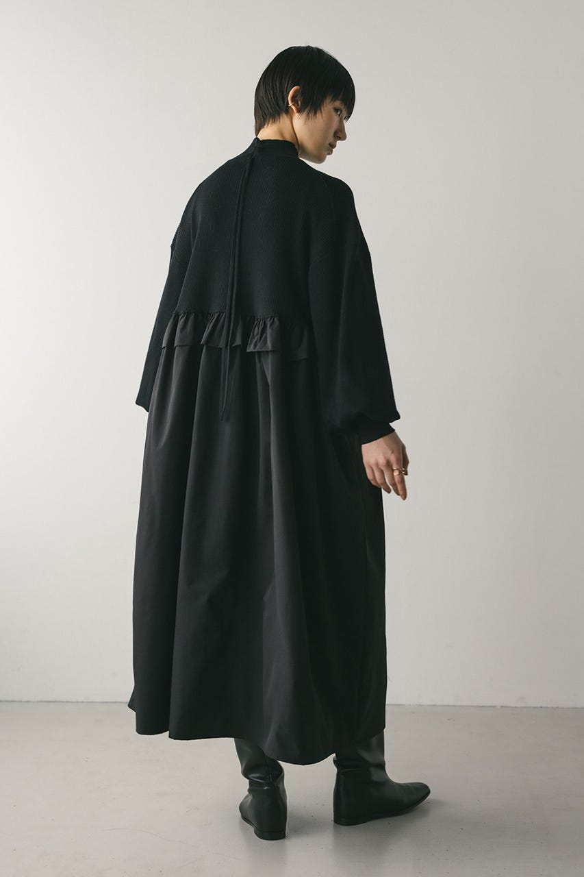 ニットトップスとハリのあるスカートをドッキングした異素材のコントラストが映えるコンビネーションワンピース。