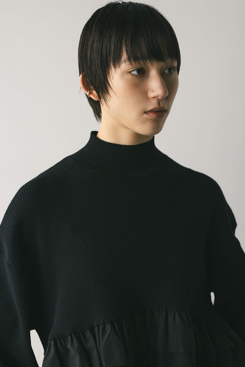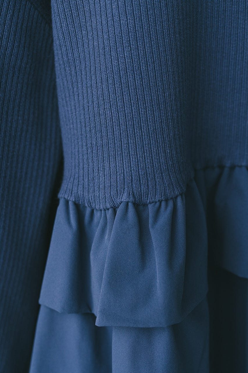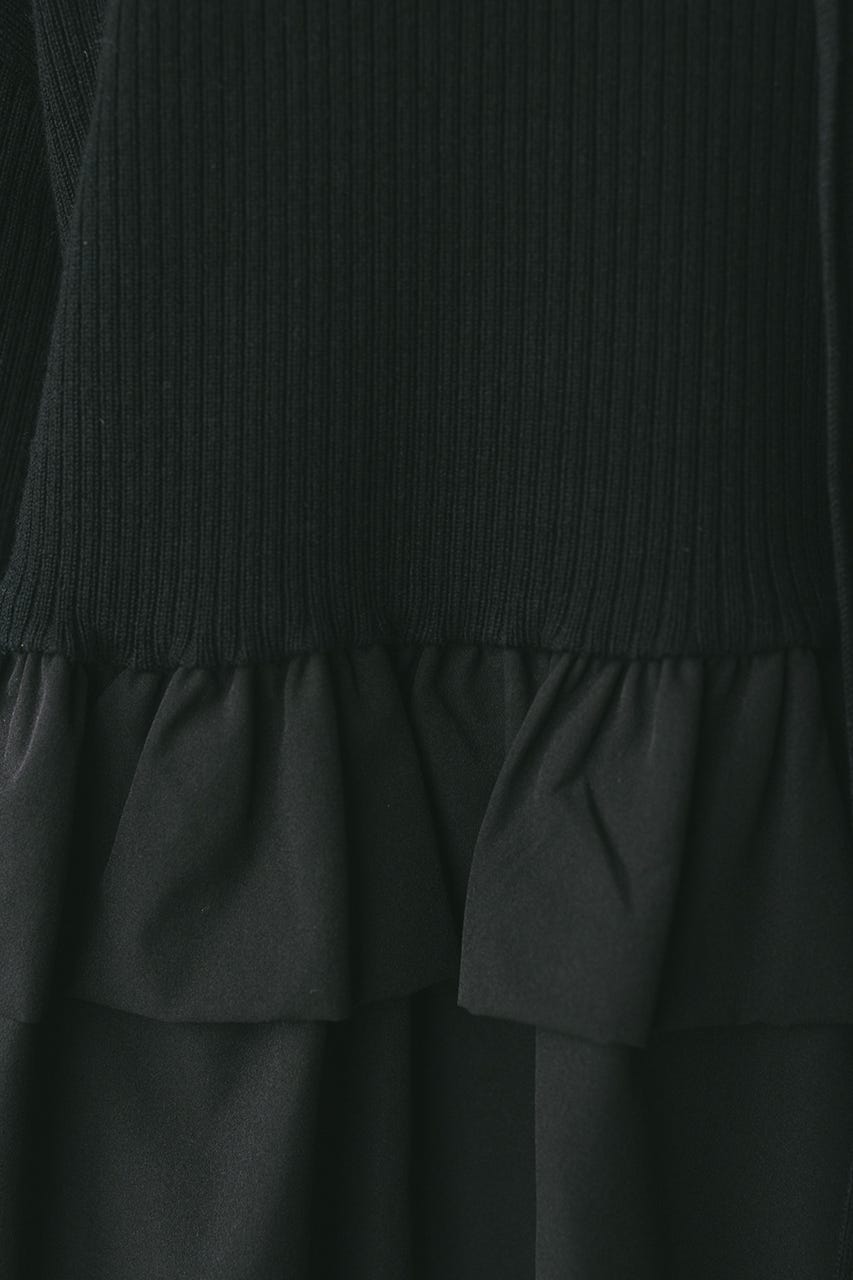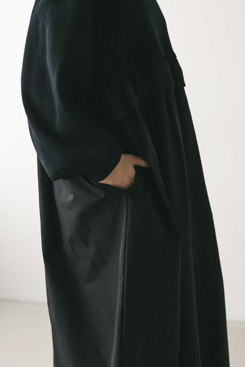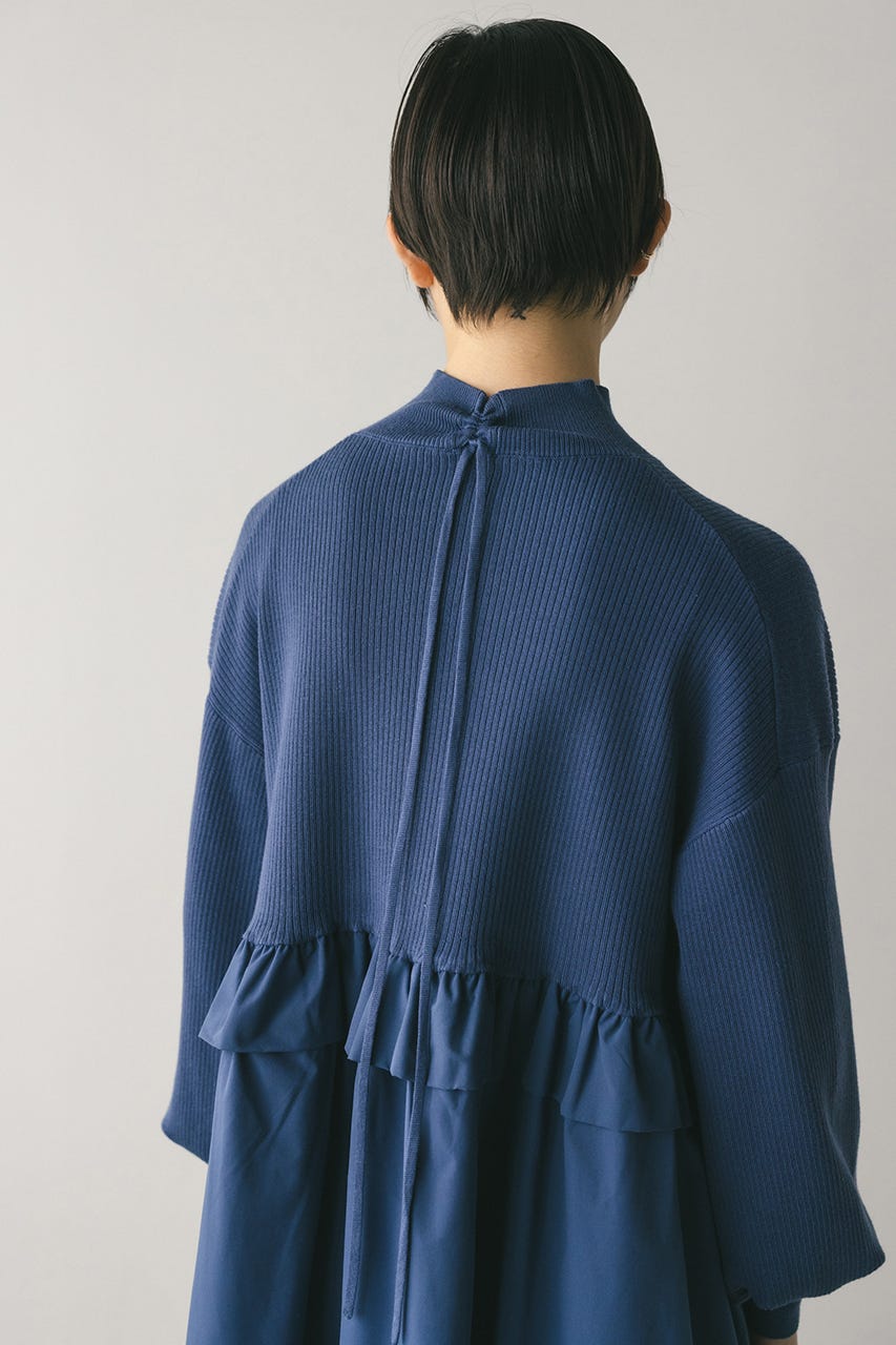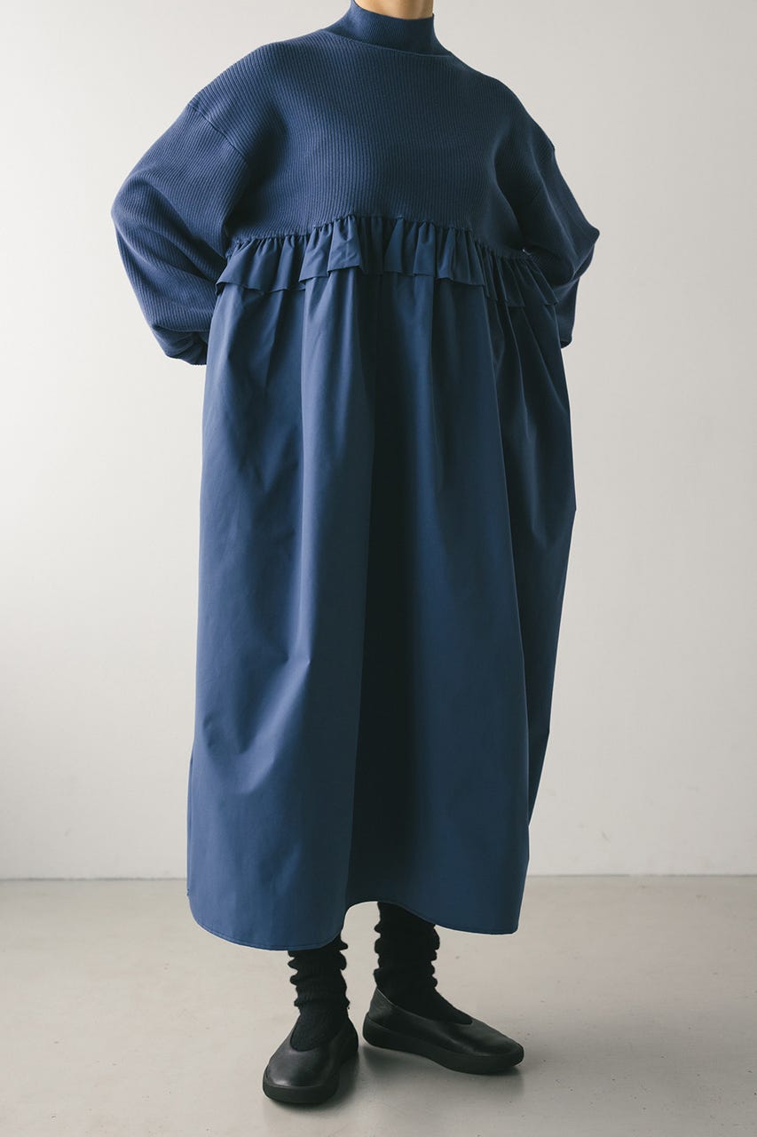 ニットトップスとハリのあるスカートをドッキングした異素材のコントラストが映えるコンビネーションワンピース。
