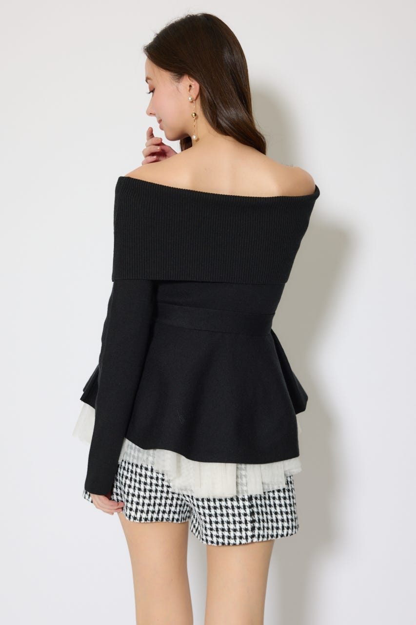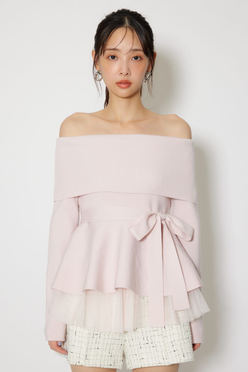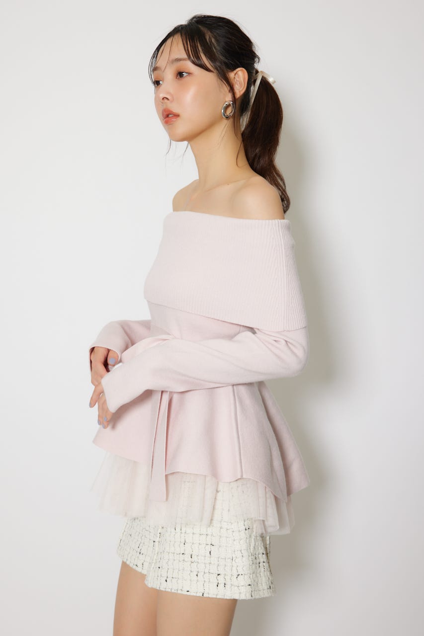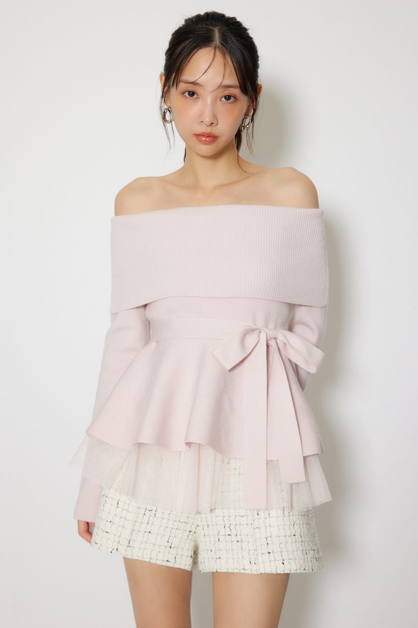 ※お届け時期:2026年1月上旬以降 【たっぷりチュールが裾から覗く華やかなペプラムニットTOPS】