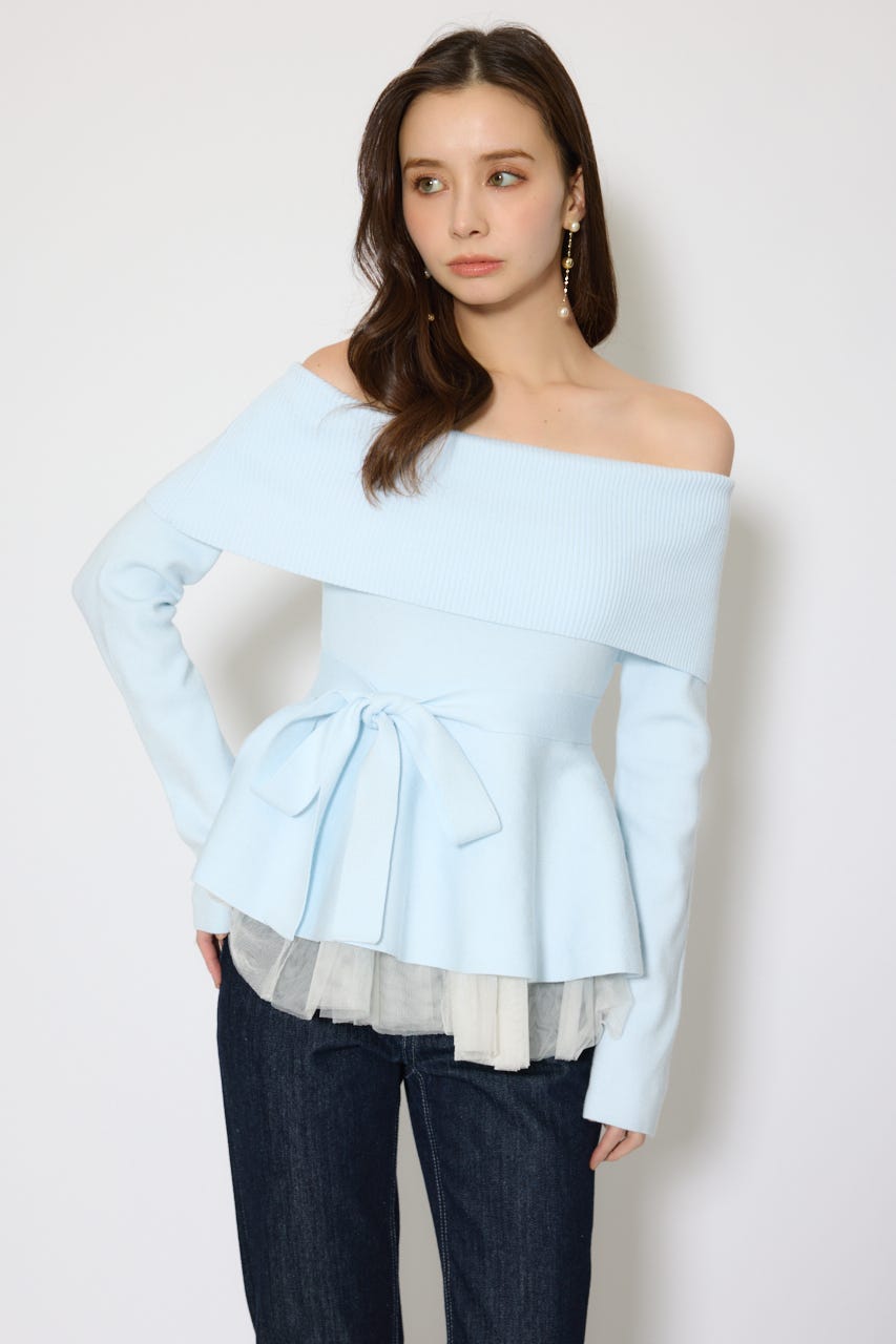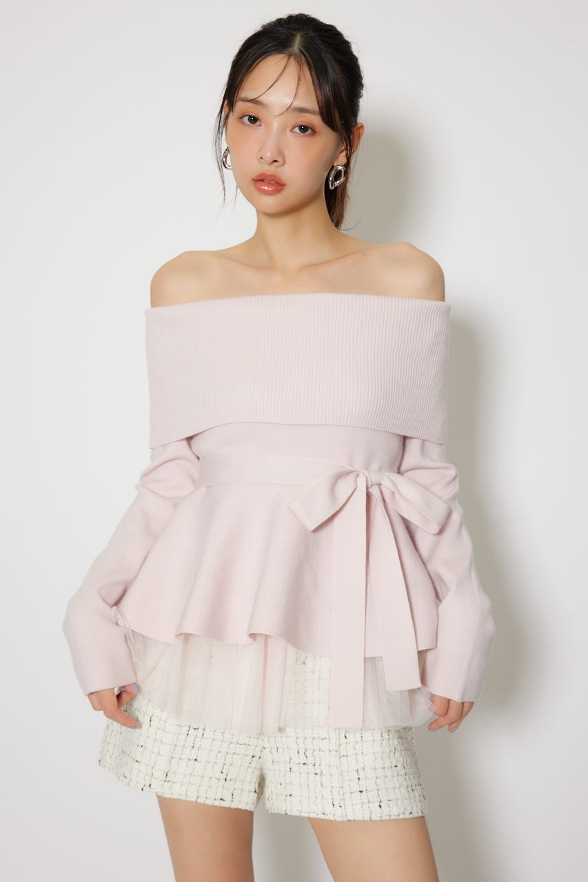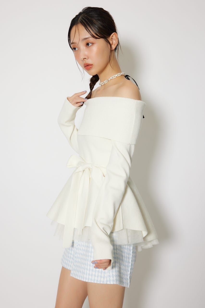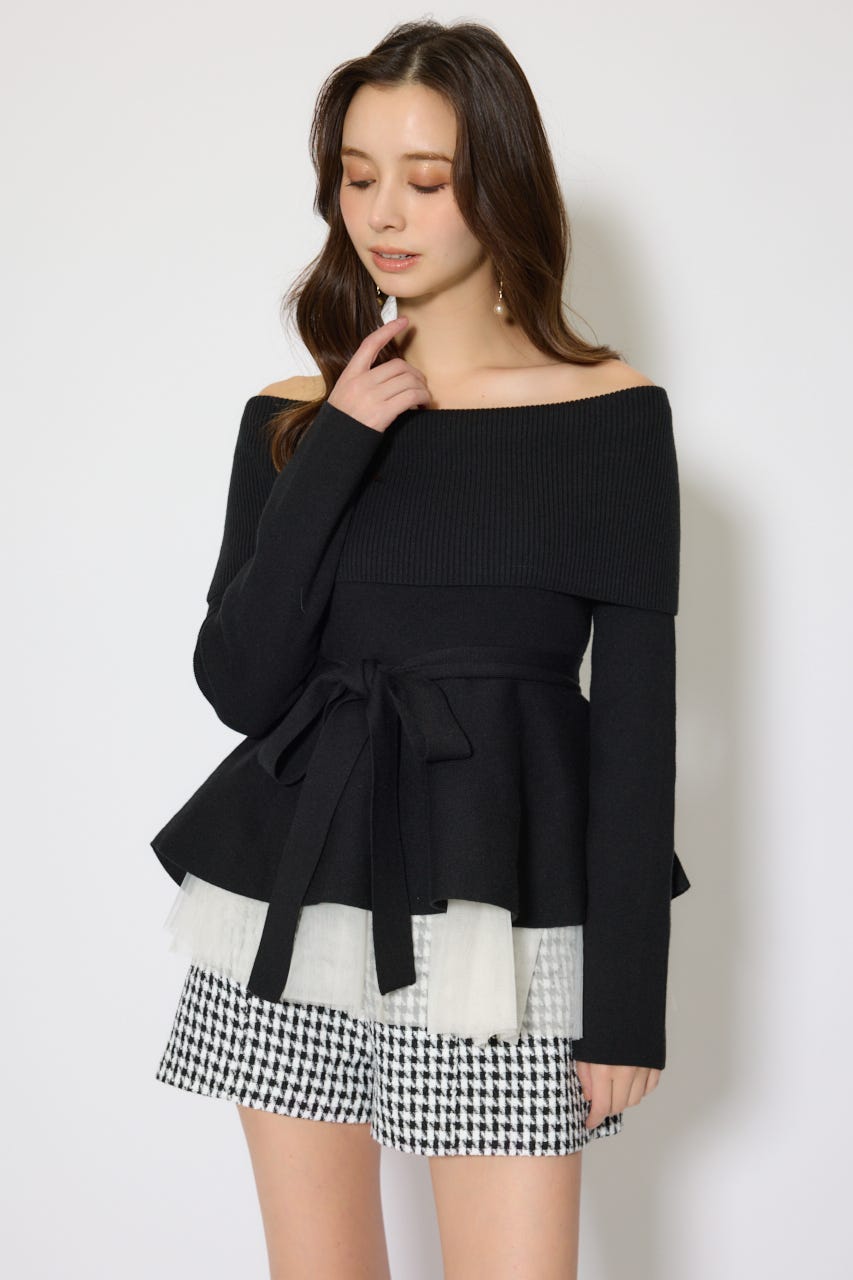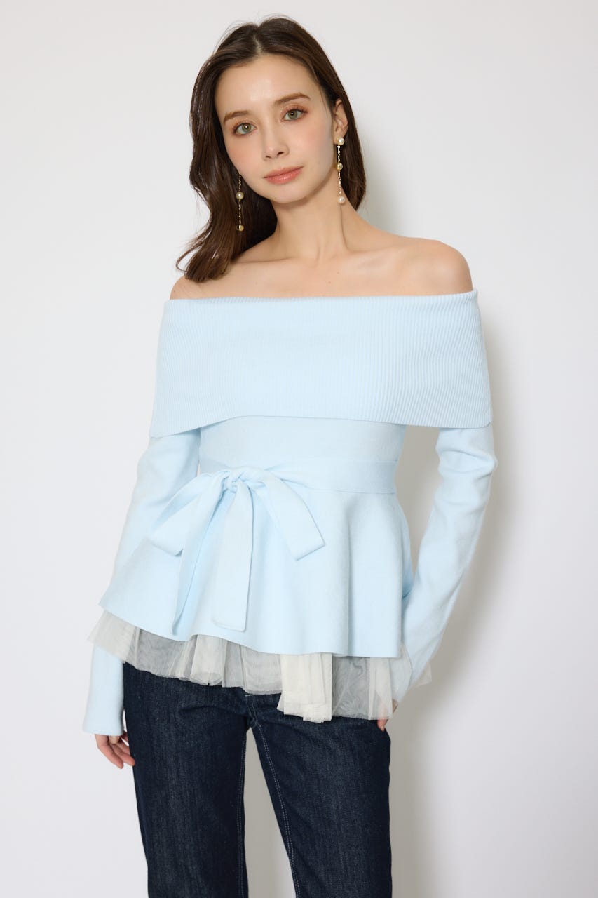 ※お届け時期:2026年1月上旬以降 【たっぷりチュールが裾から覗く華やかなペプラムニットTOPS】