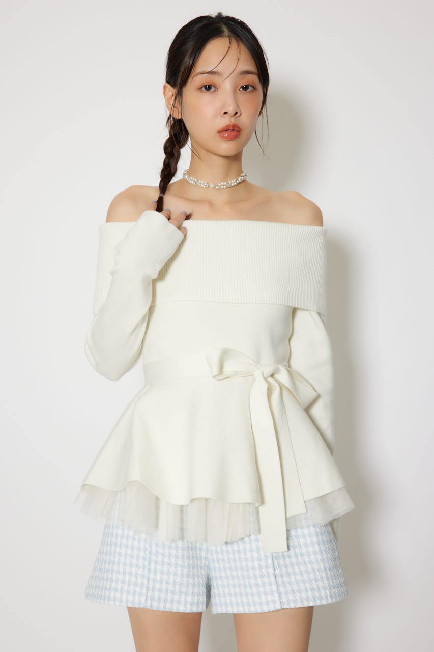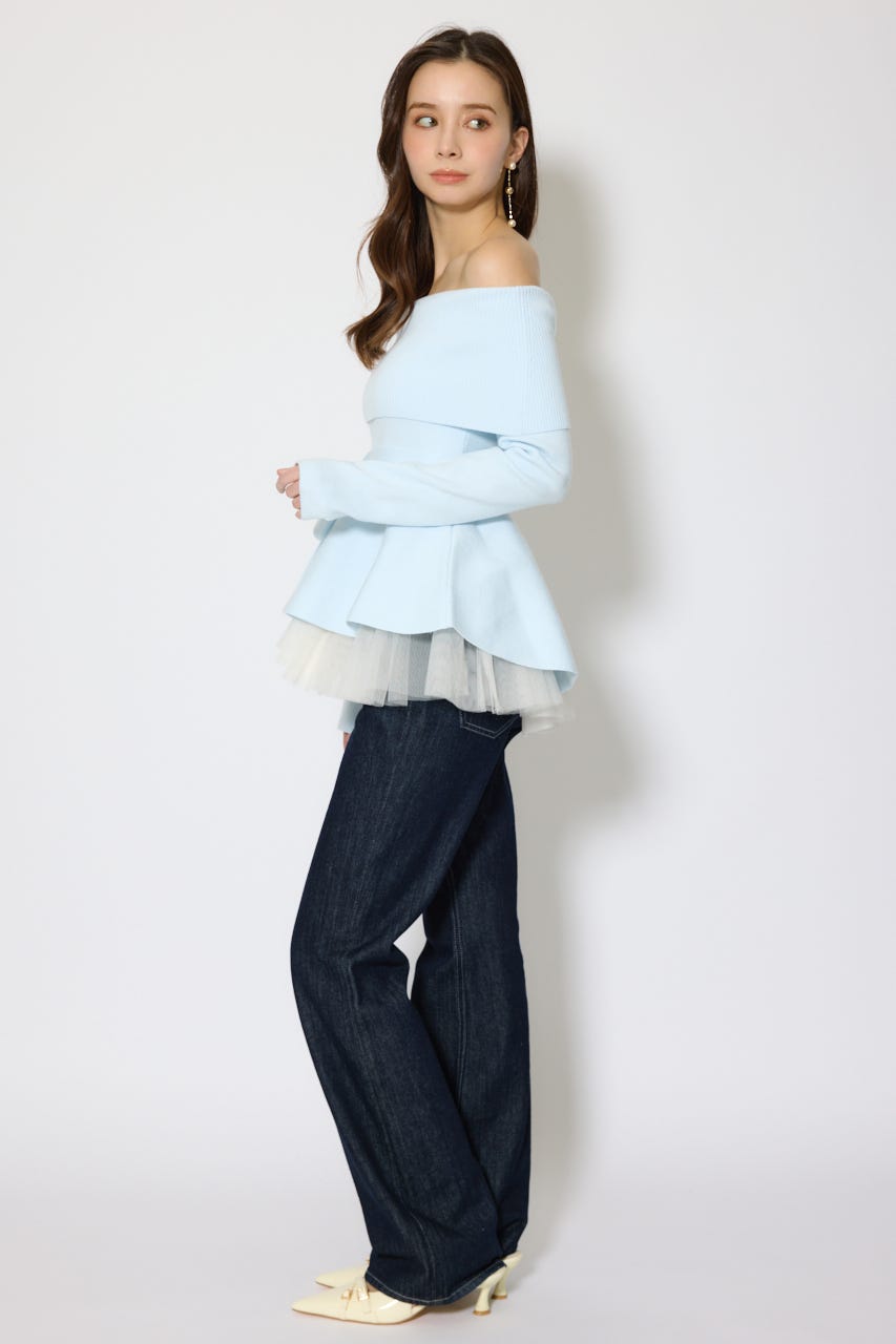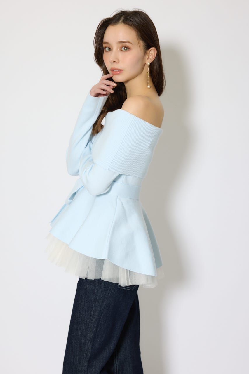 その裾からは取り外し可能なチュールペプラムがチラ見え、取り外せばシンプルなオフショルペプラムトップスとしても使えてマルチな着こなしが楽しめます。