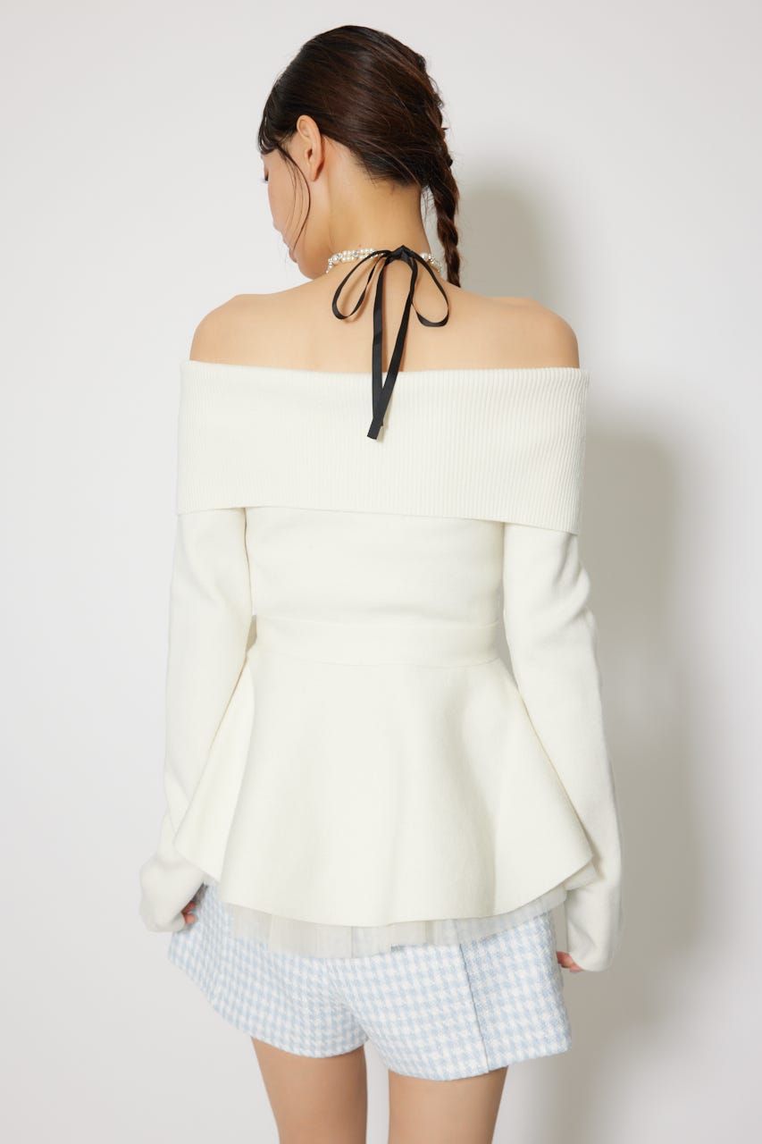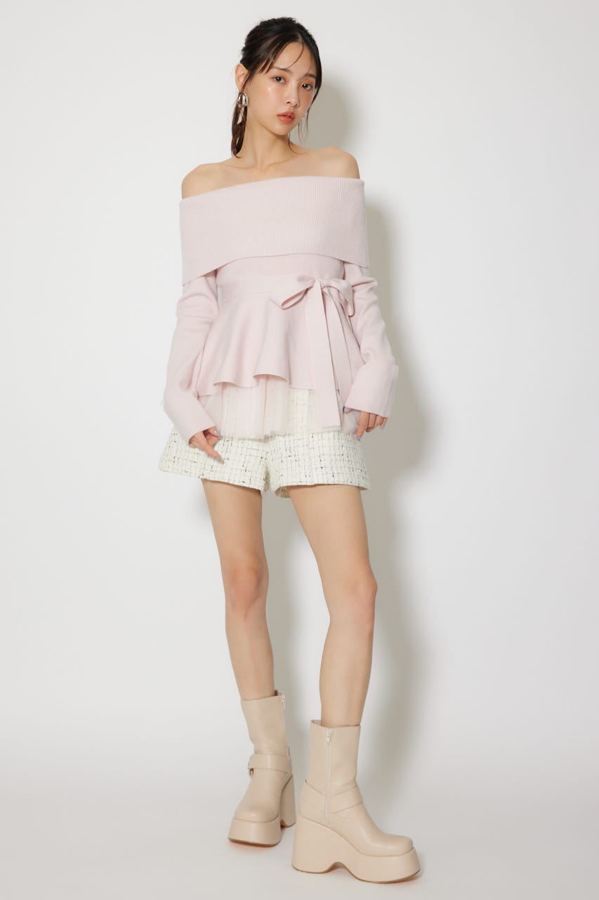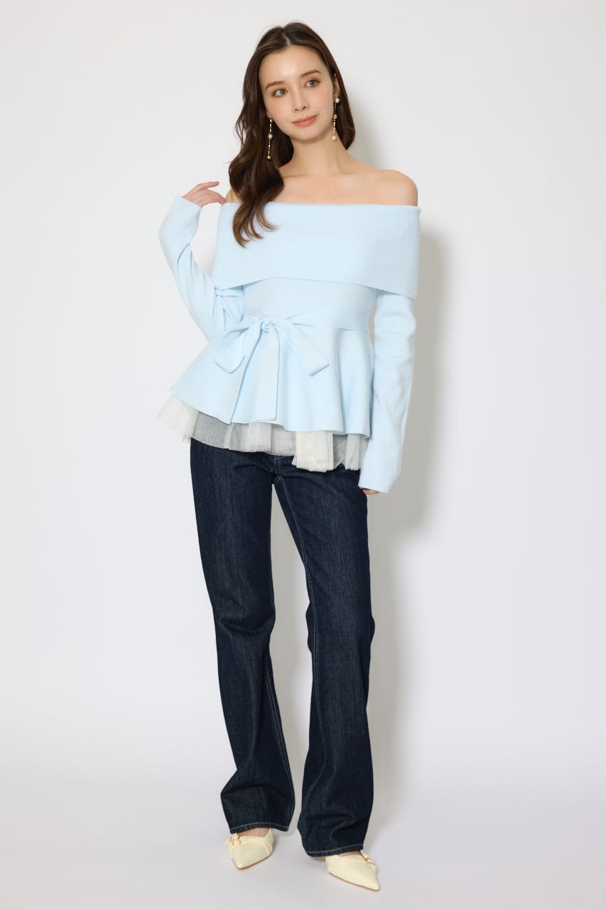 その裾からは取り外し可能なチュールペプラムがチラ見え、取り外せばシンプルなオフショルペプラムトップスとしても使えてマルチな着こなしが楽しめます。