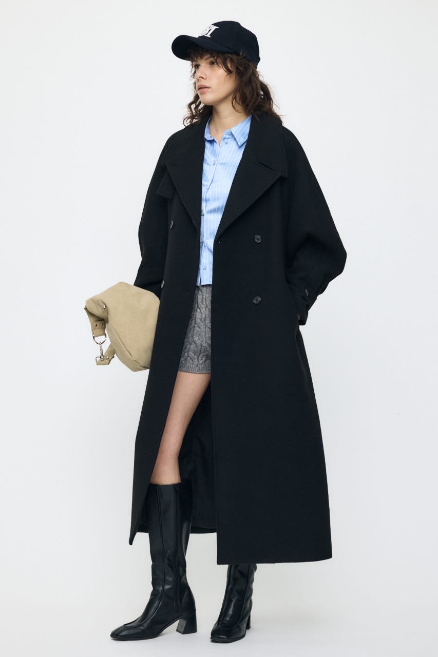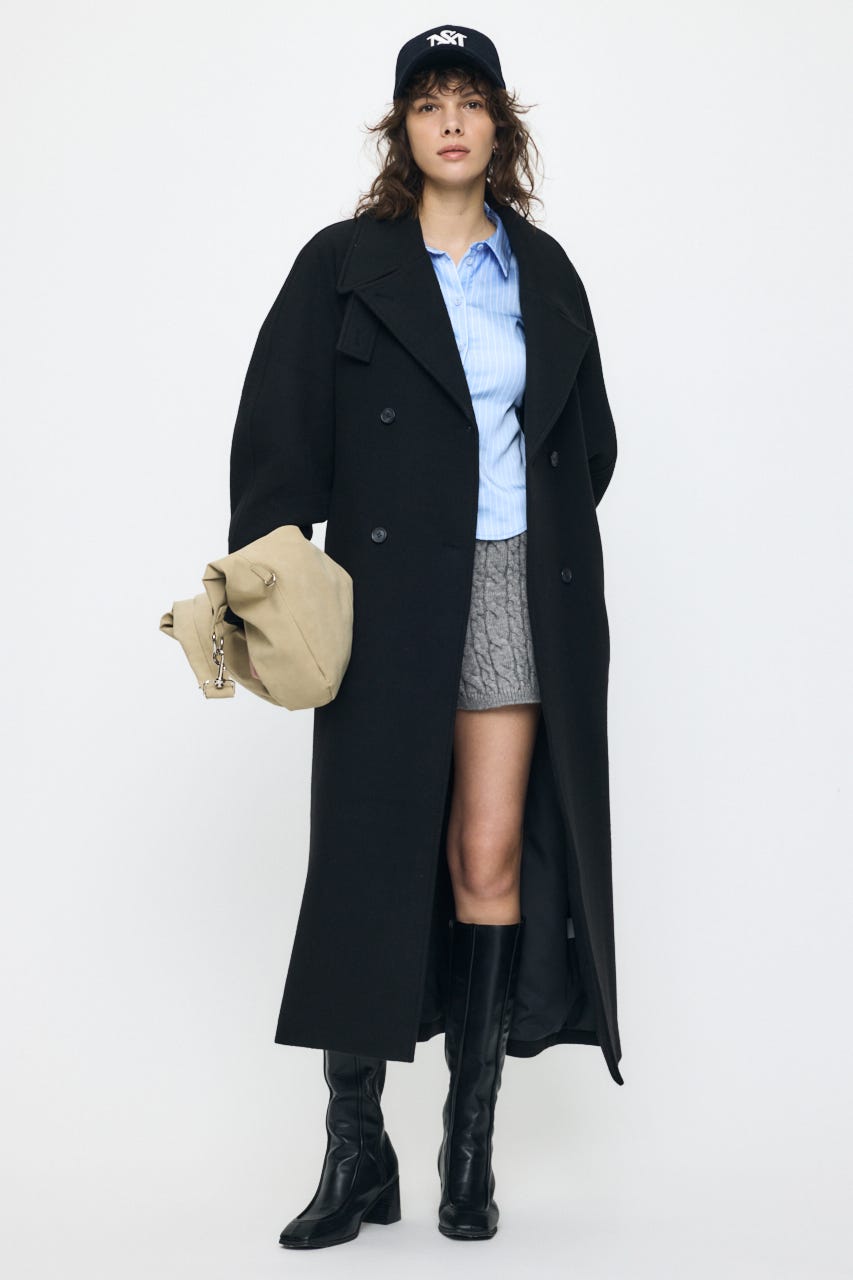 ブーツやタイツ+ヒールで脚を見せるスタイリングがバランスよく決まります。
