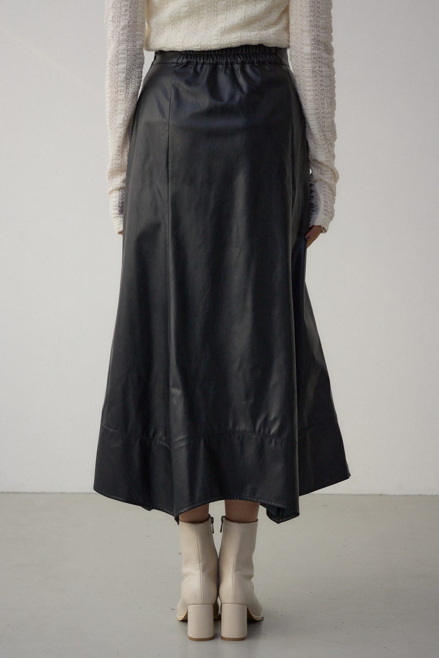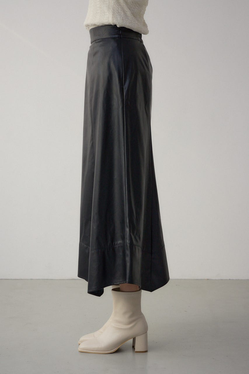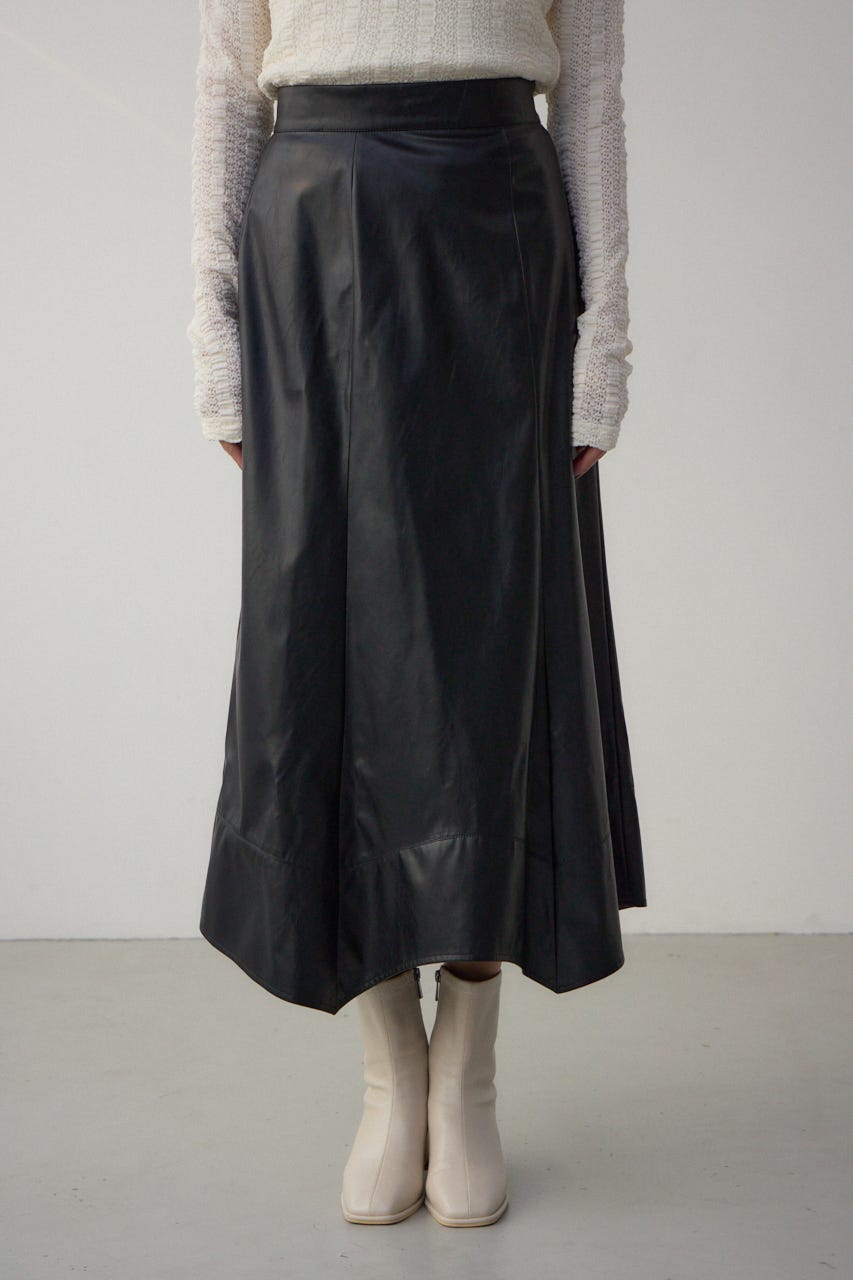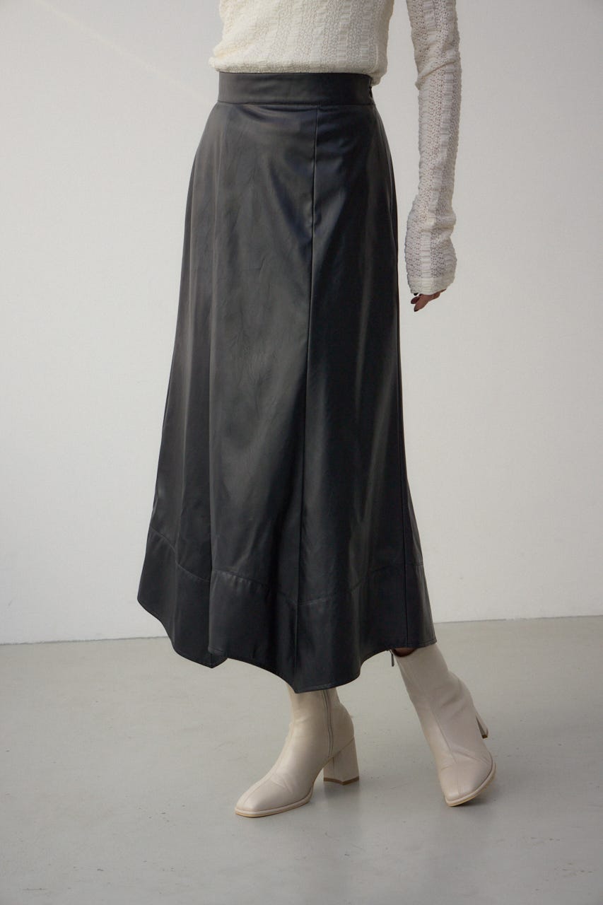 マットなフェイクレザーと揺れ感のあるハンカチーフヘムが、辛口とフェミニンを絶妙に両立するスカート。