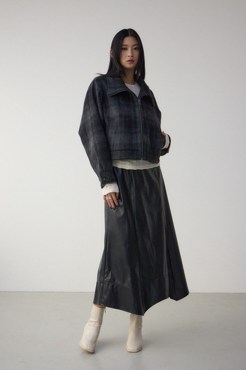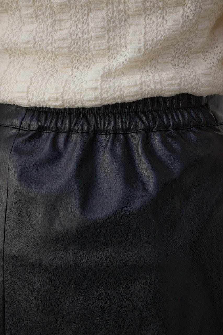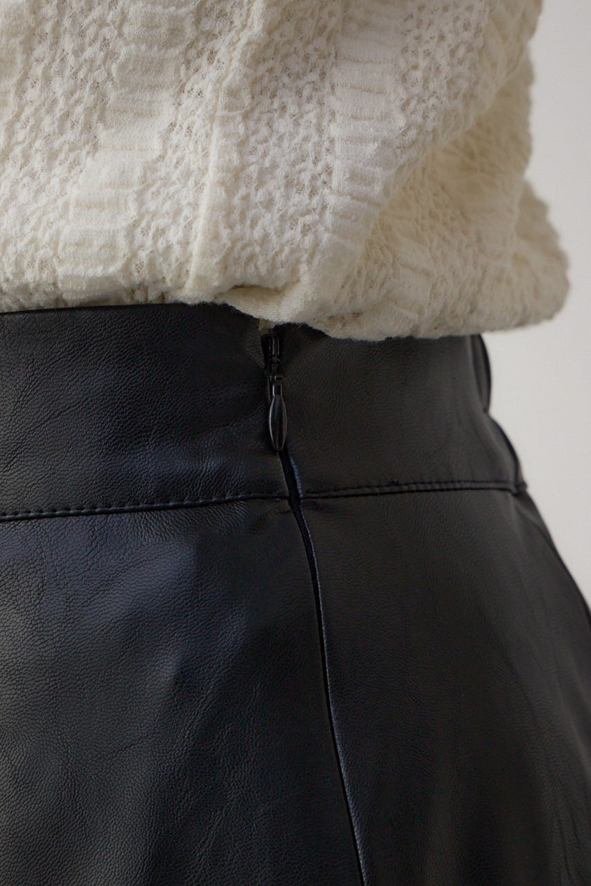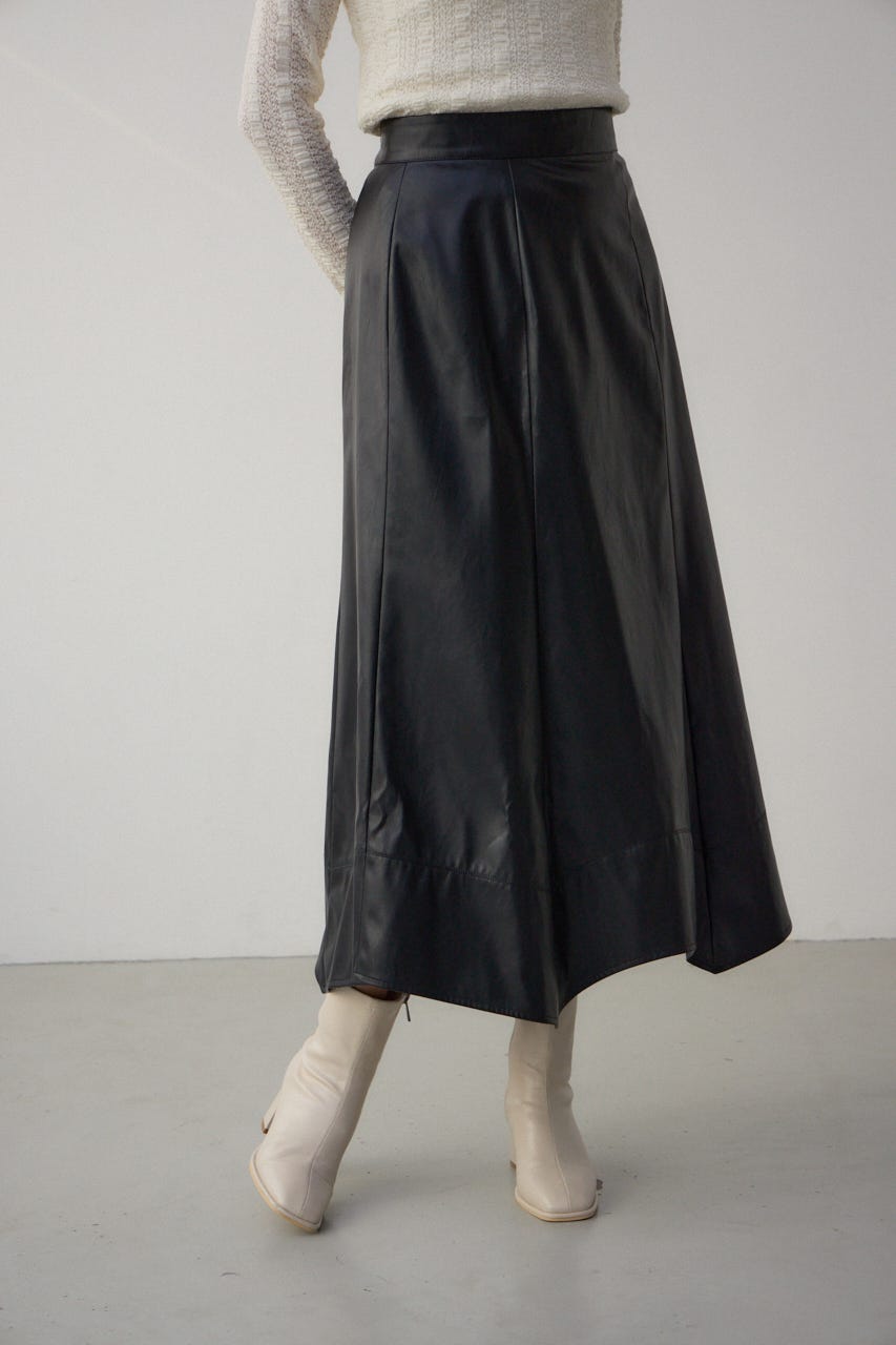 マットなフェイクレザーと揺れ感のあるハンカチーフヘムが、辛口とフェミニンを絶妙に両立するスカート。