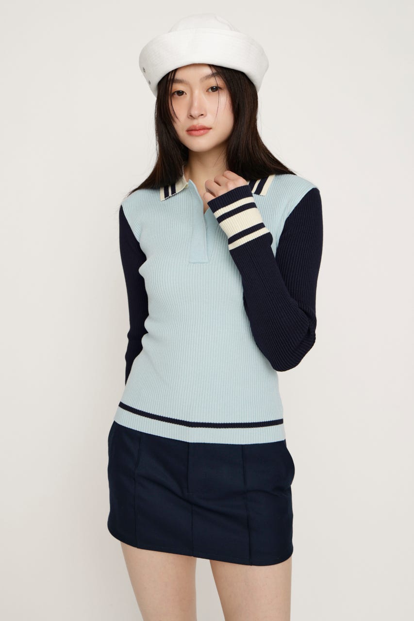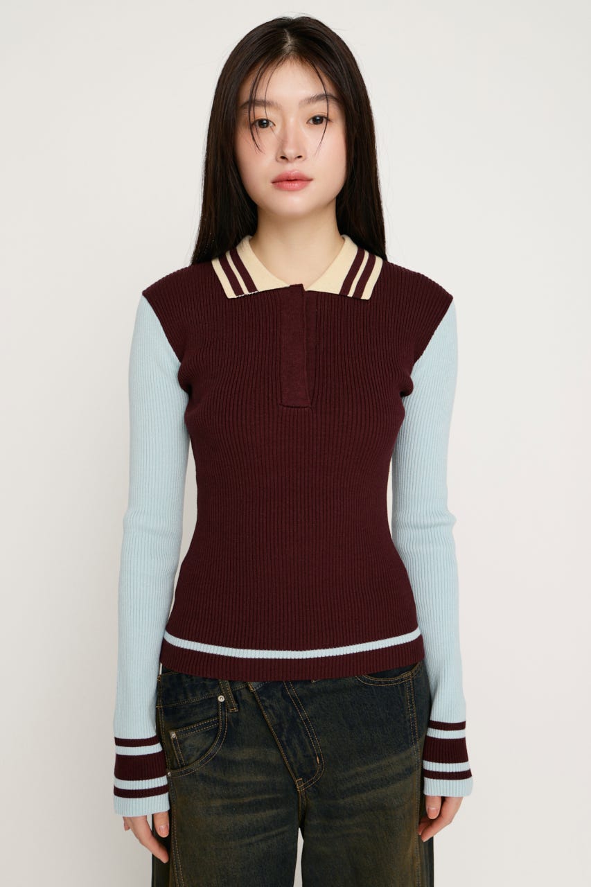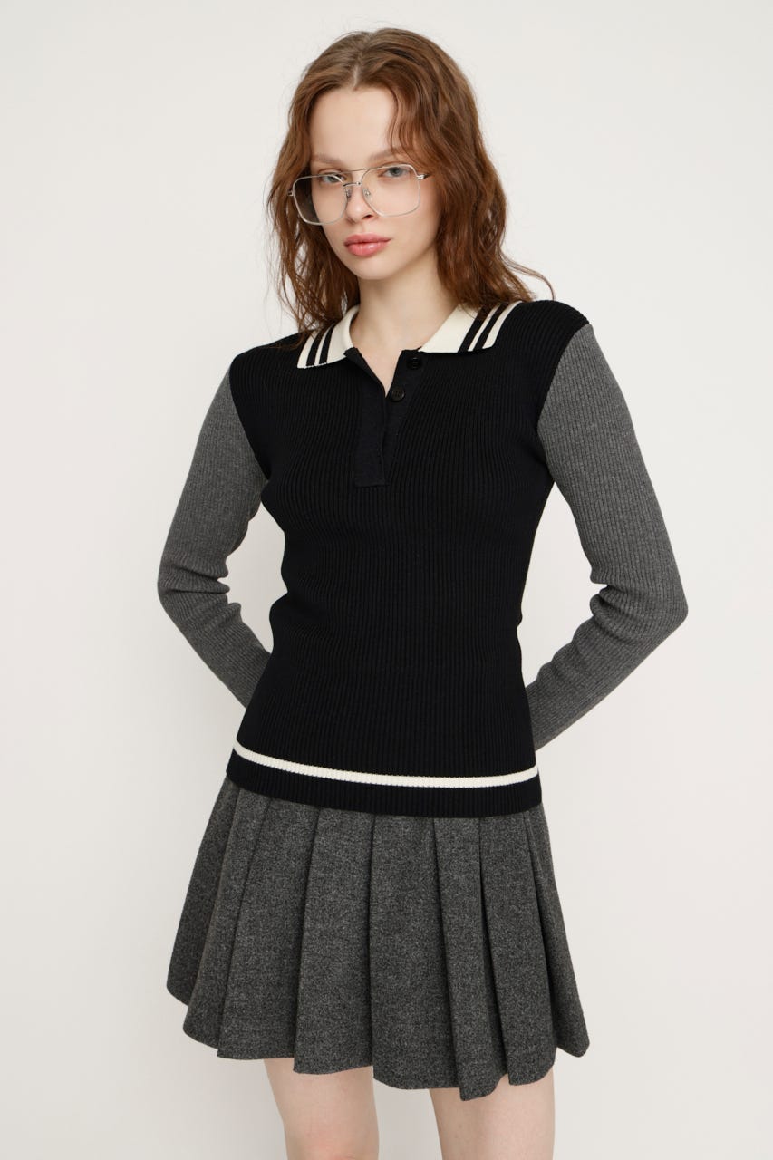 バイカラー配色と襟や裾のラインがポイントとなった襟付きニットトップス。