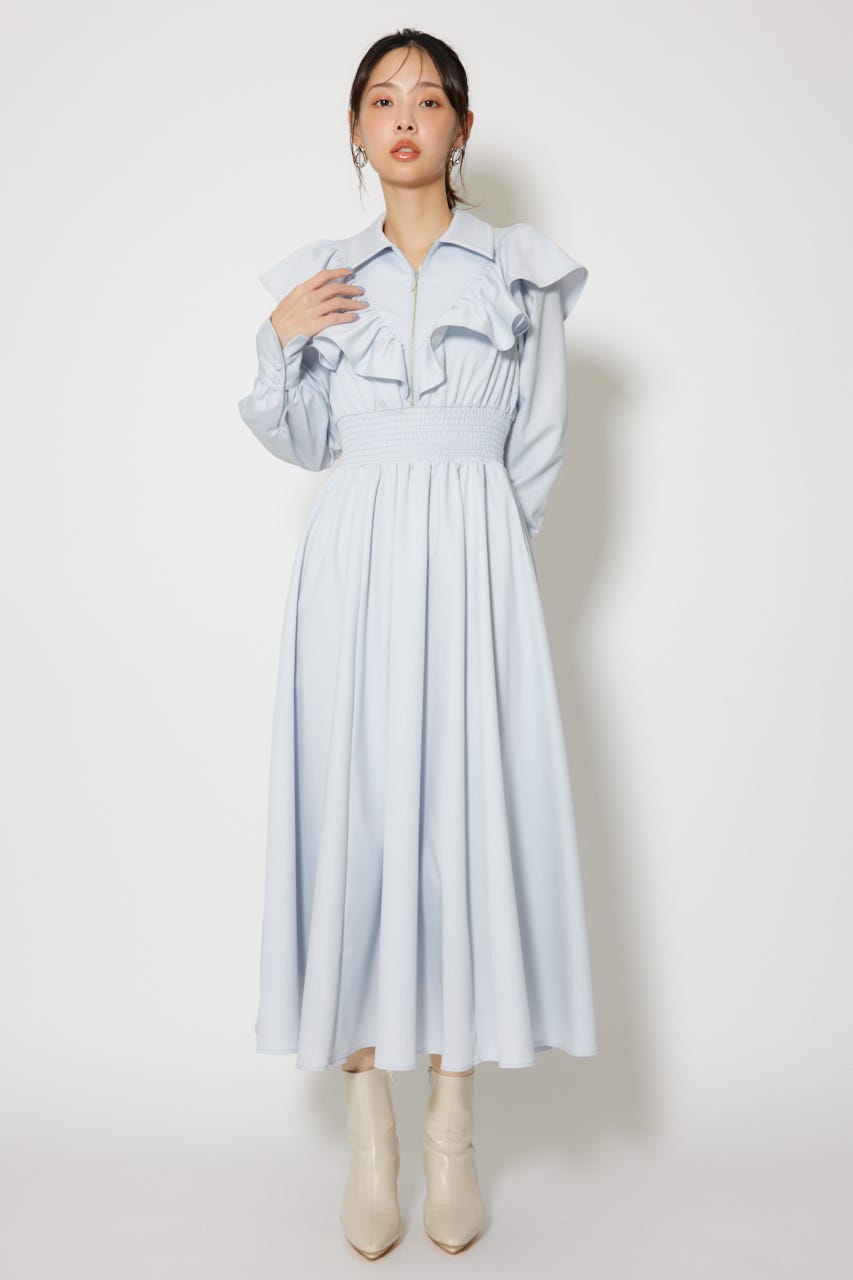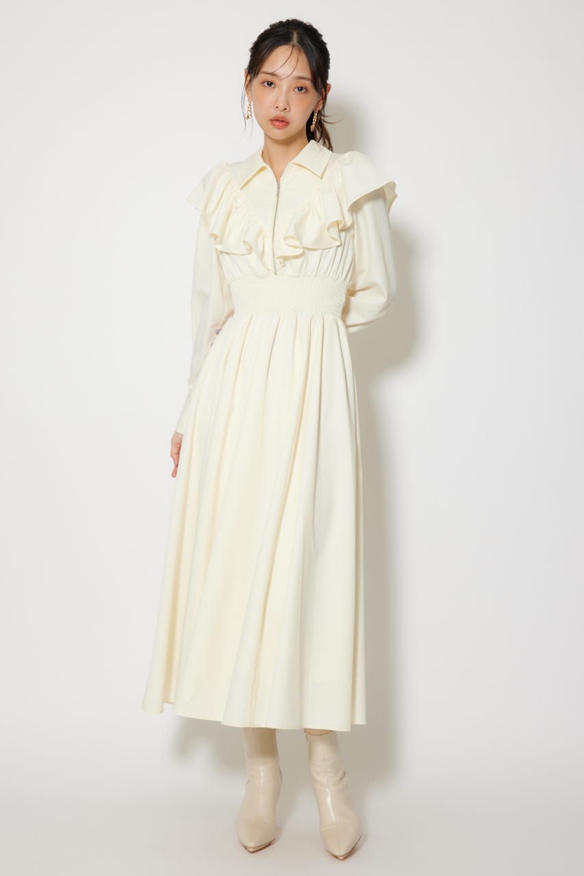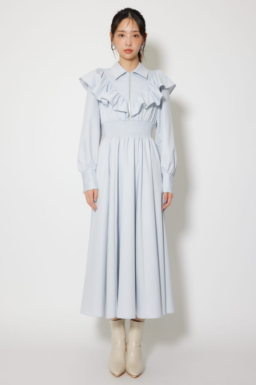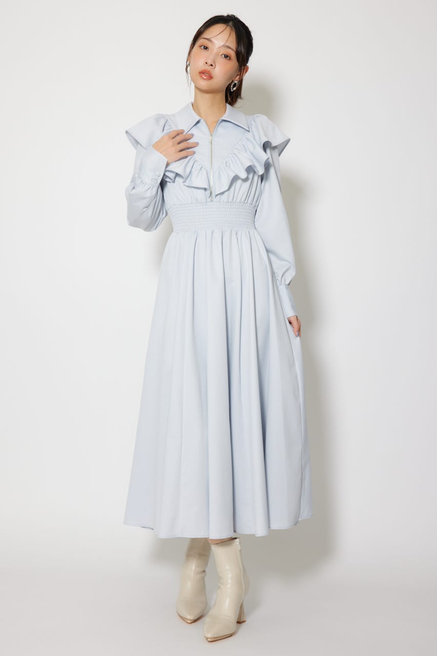 【フロントZIPとフリルデザインでクールさとフェミニンが融合されたシャツワンピース】