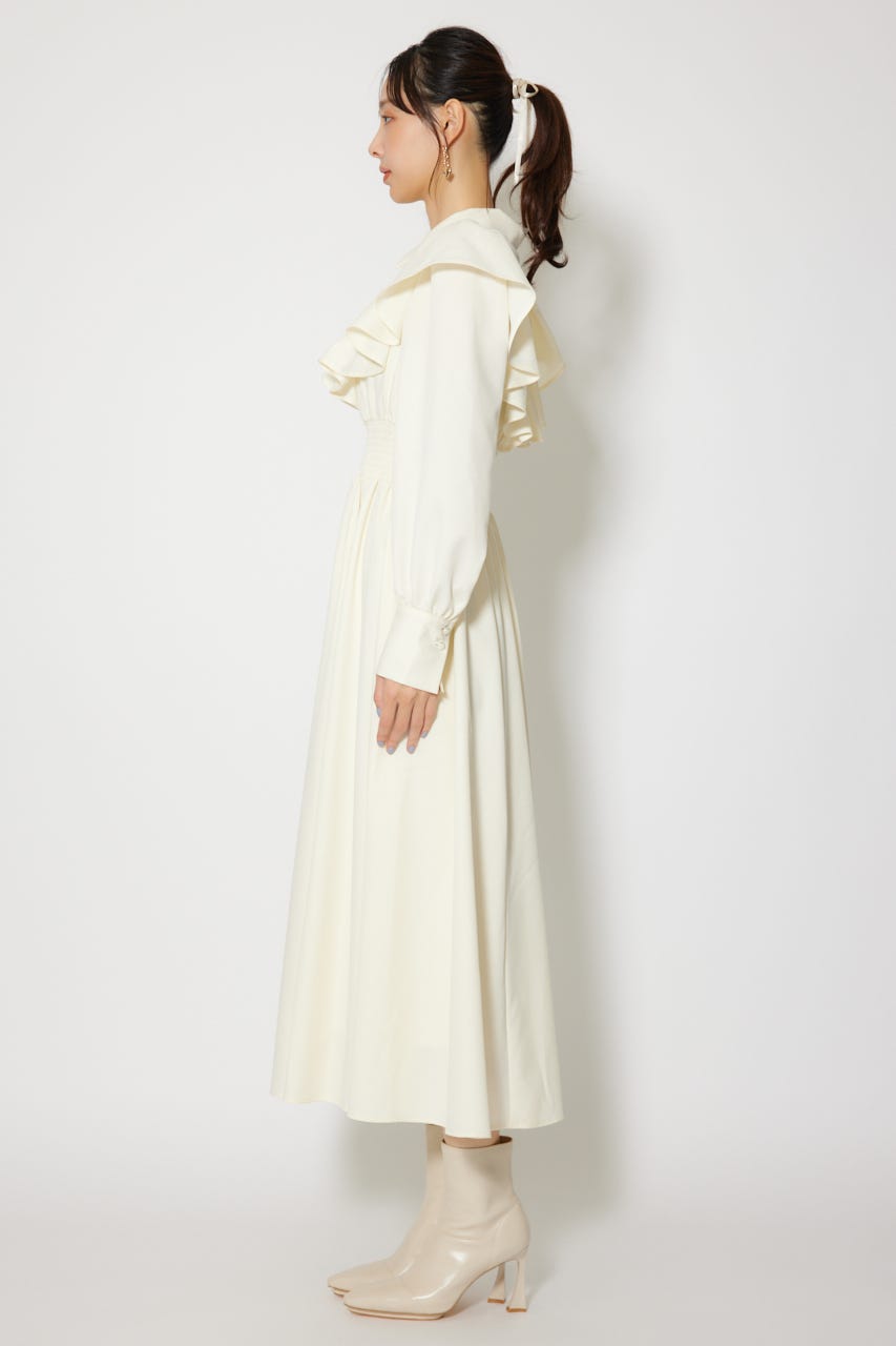 シャープな襟とフロントZIPデザインでクールな要素を表現しながら、Vの字で施したフリルデティールを入れて甘辛ミックスのシャツワンピースを製作しました。