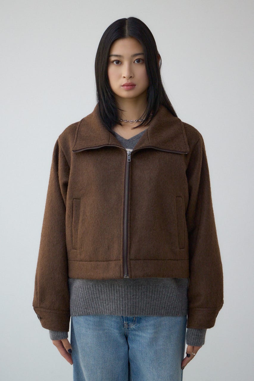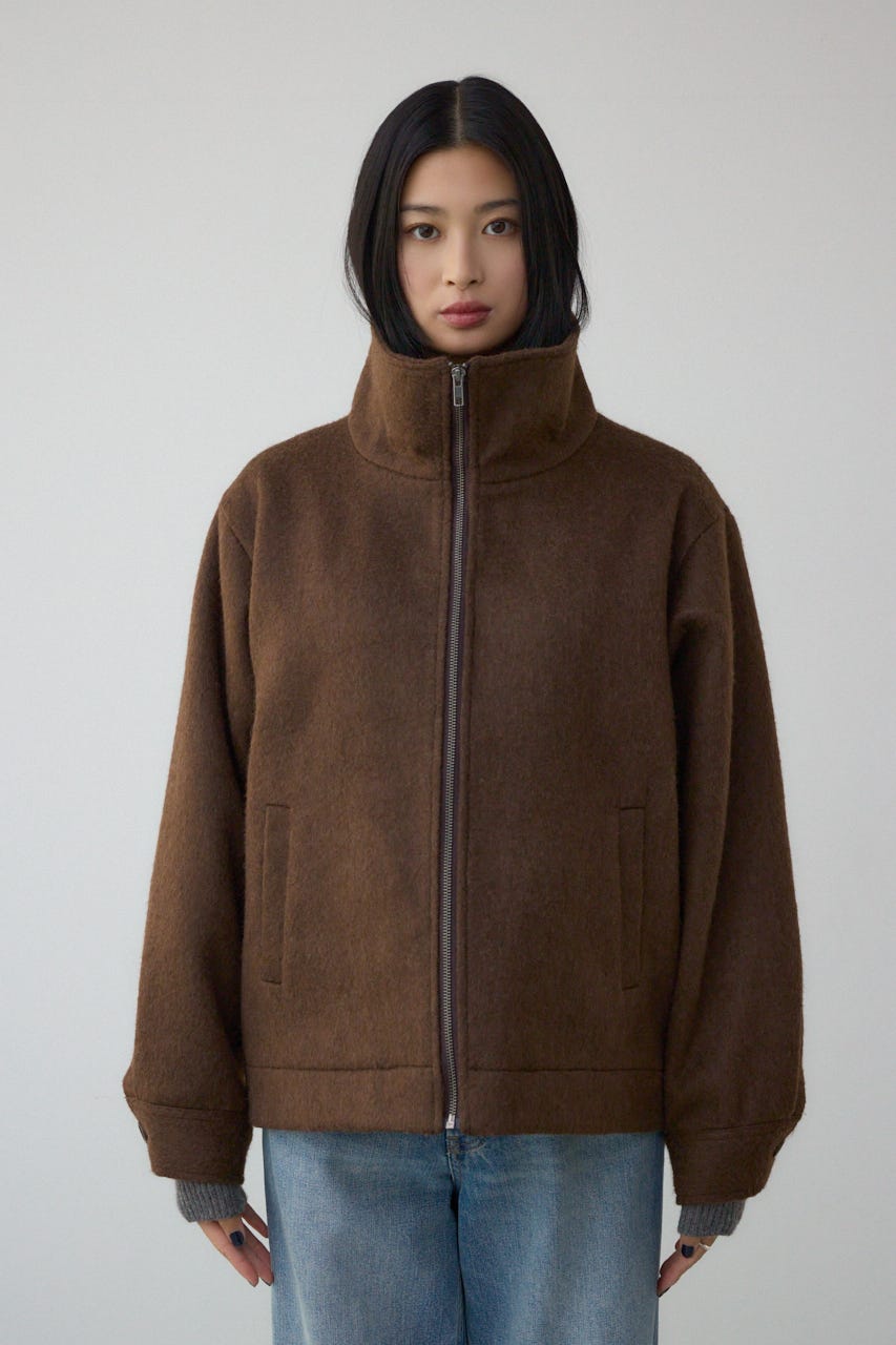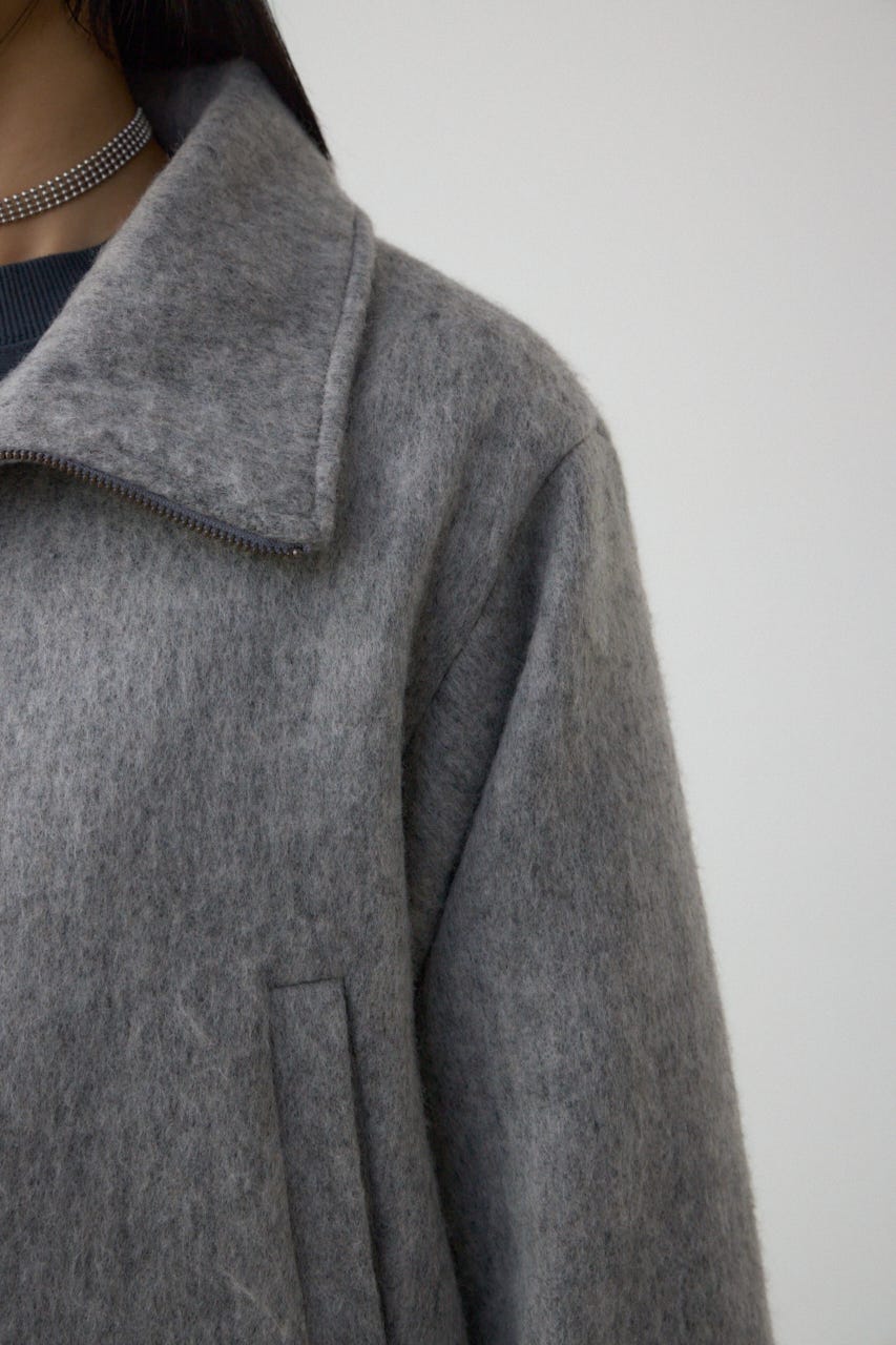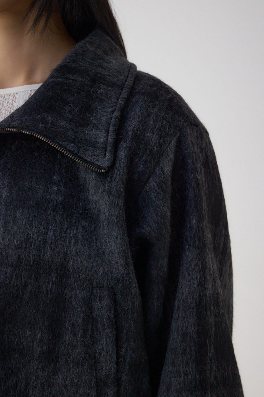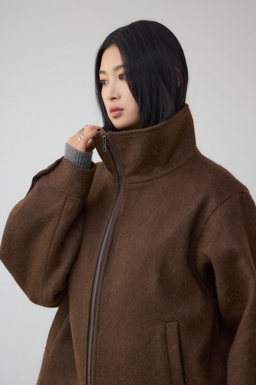 ふんわりとしたシャギー素材が、上品な温もりを添えるスタンドカラーコート。