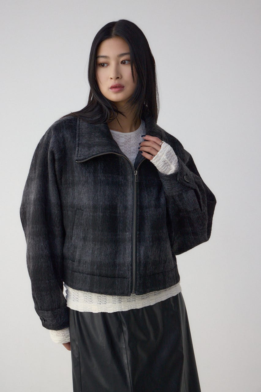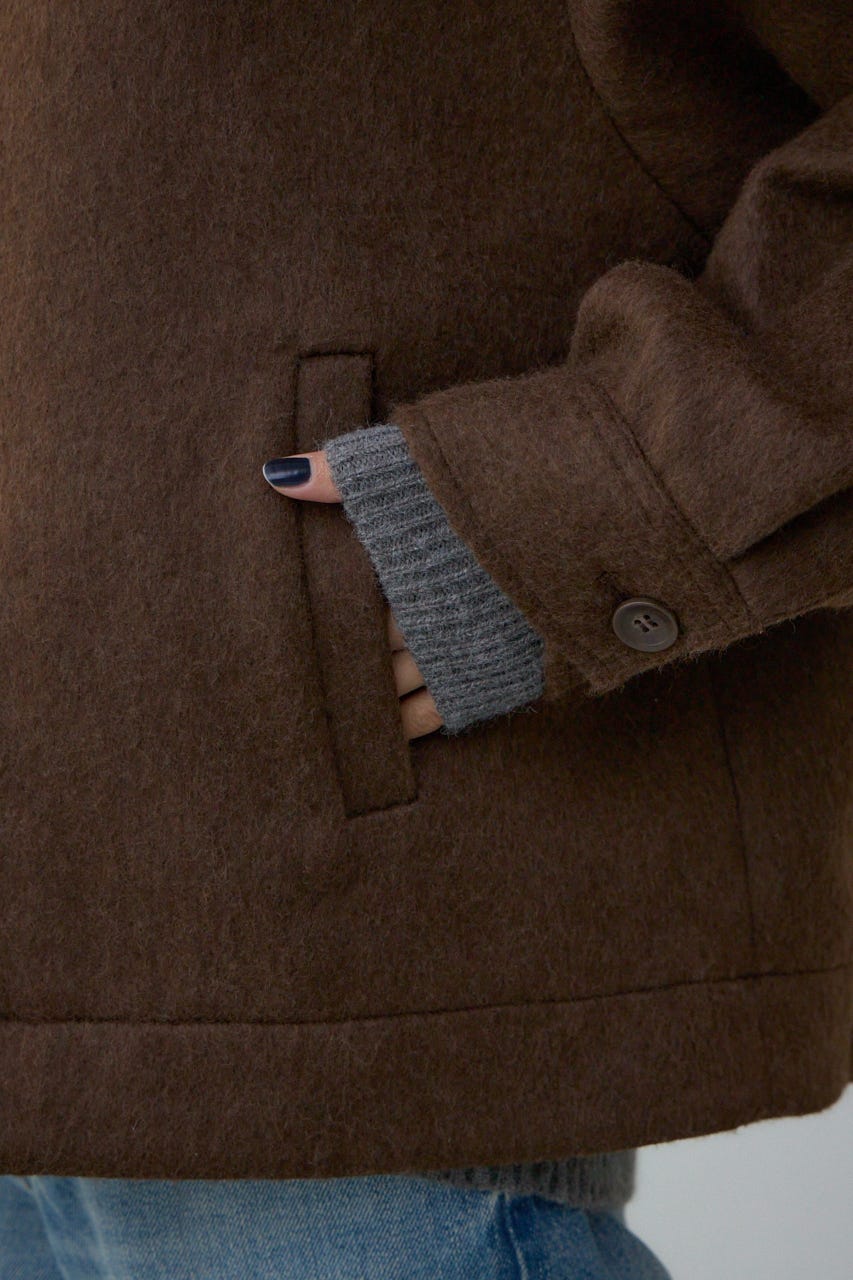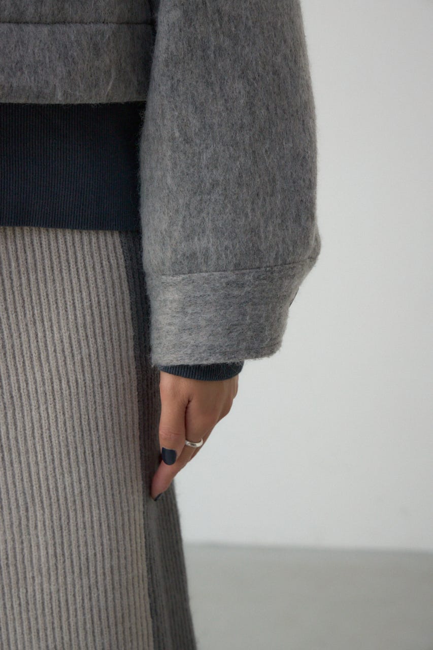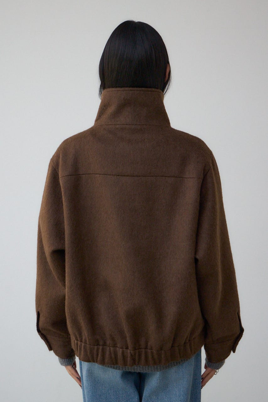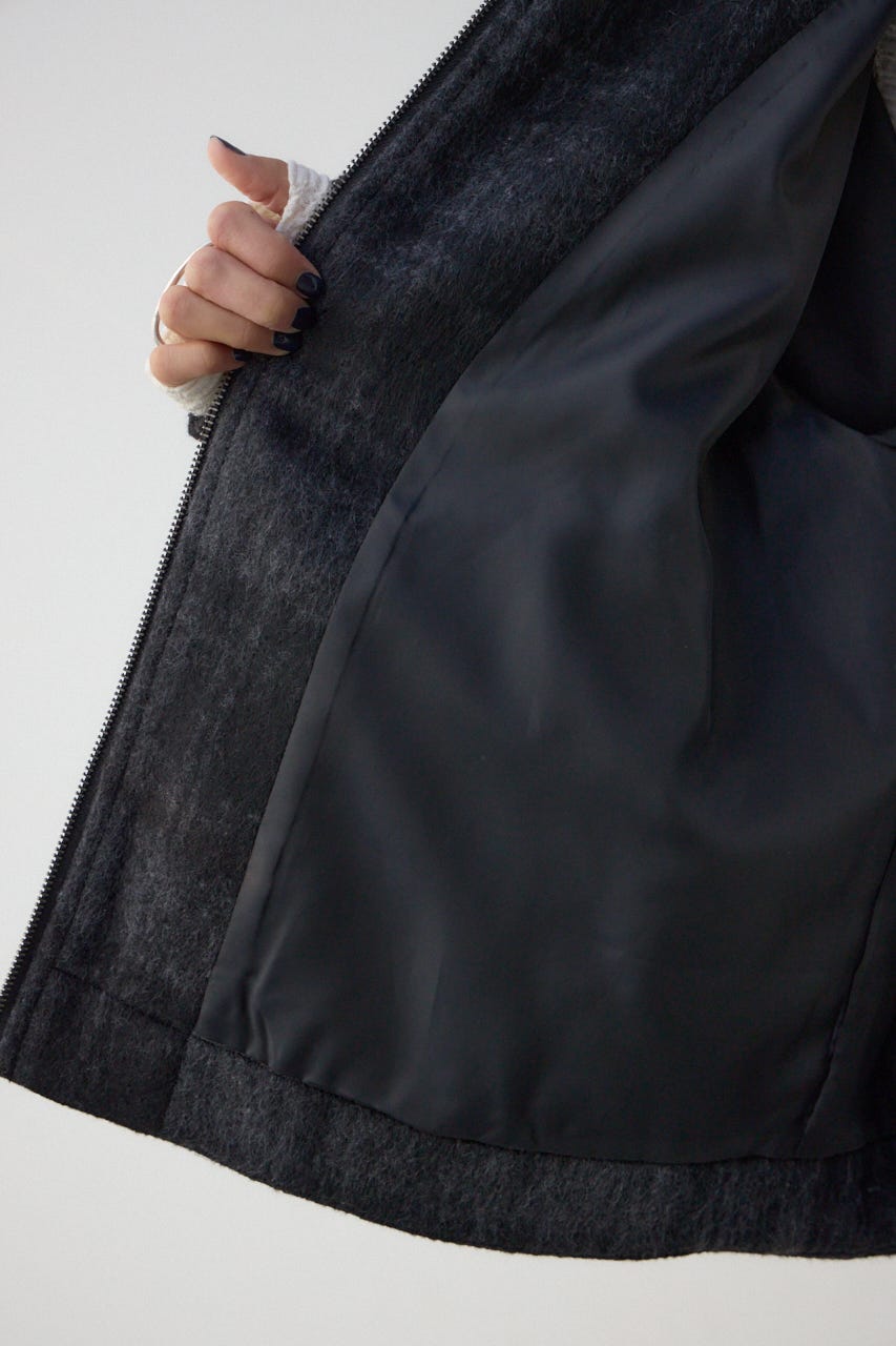 ふんわりとしたシャギー素材が、上品な温もりを添えるスタンドカラーコート。