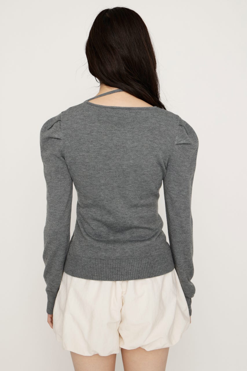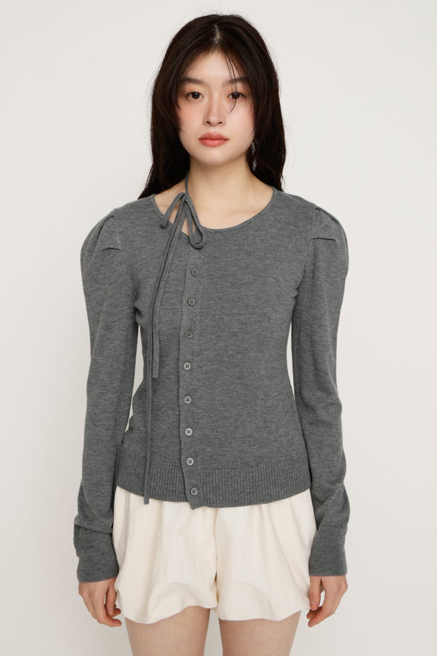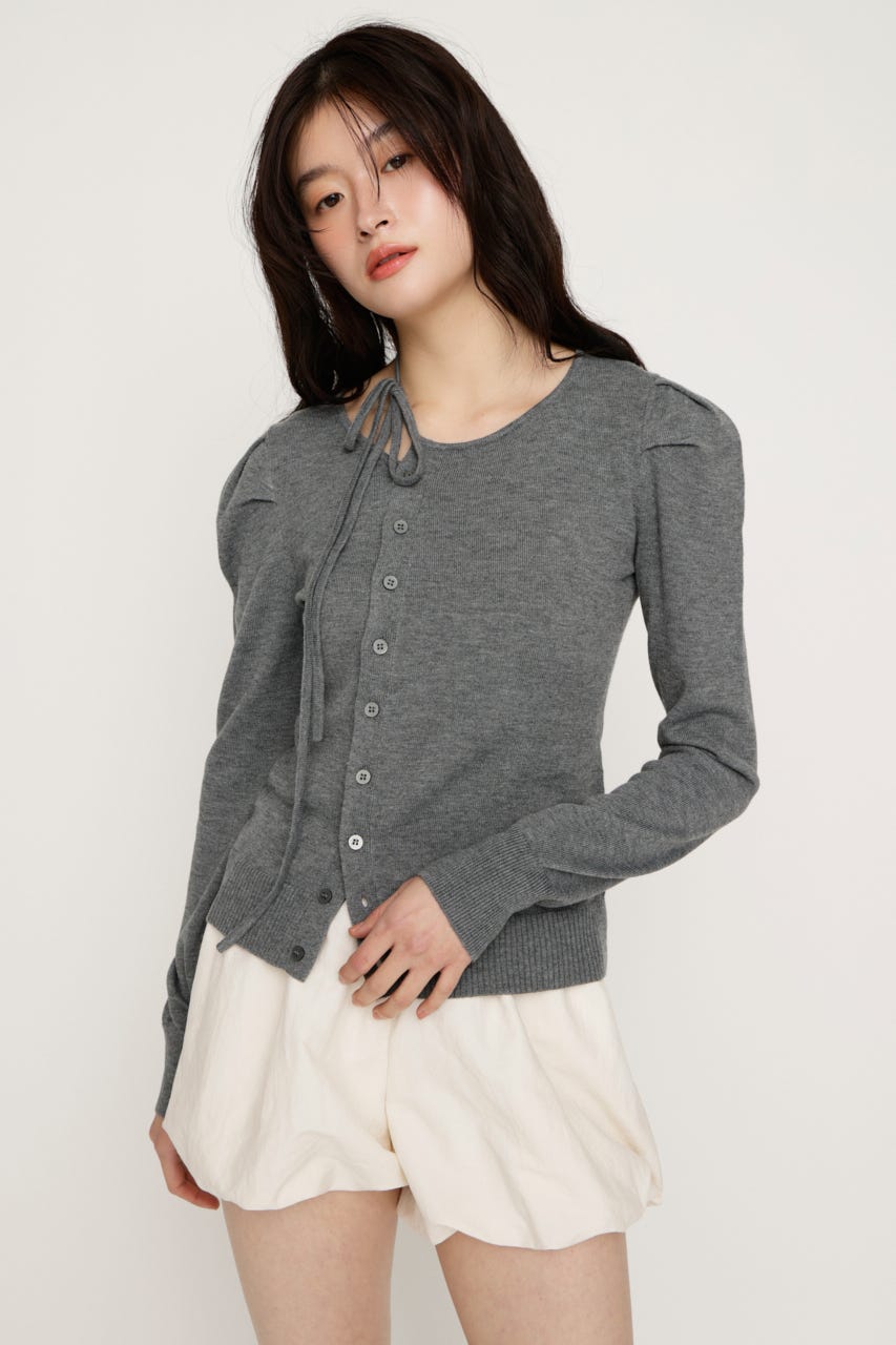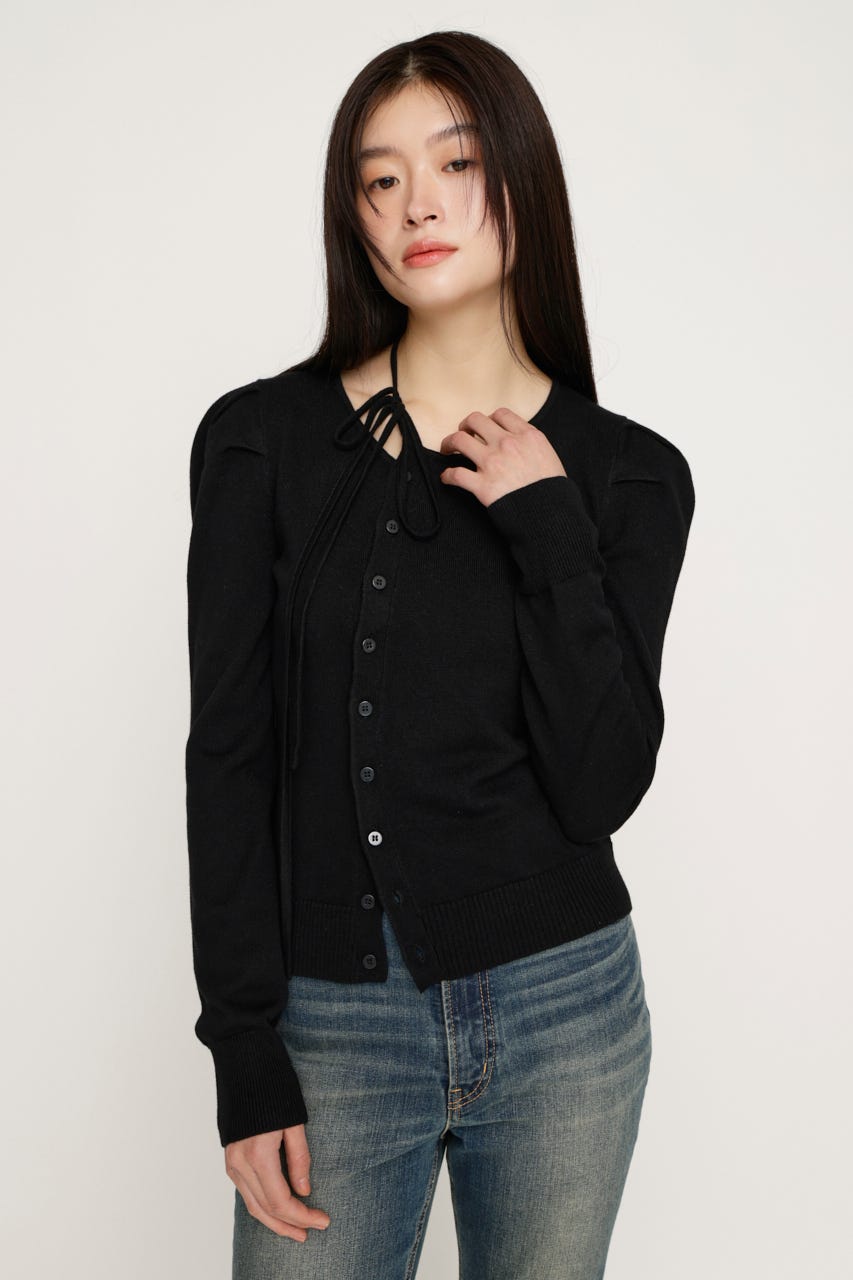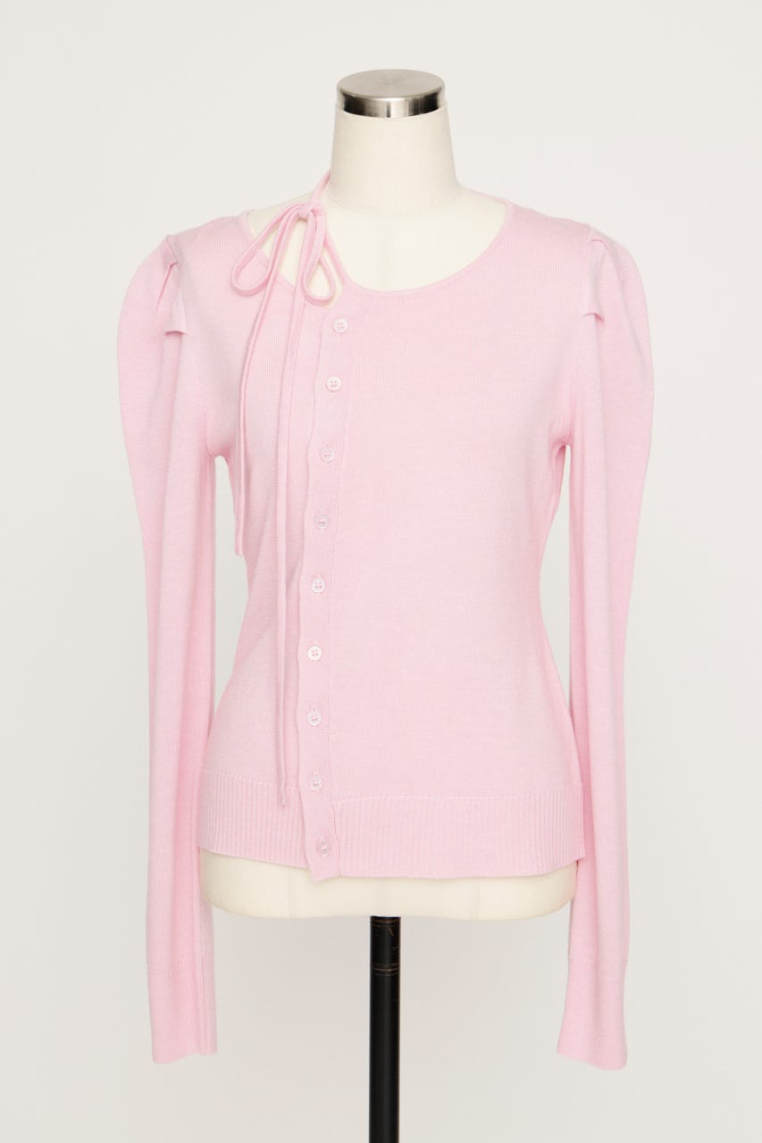 リボンディテールとカーブしたフロントの釦デザインが目を惹くハイゲージパフトップス。