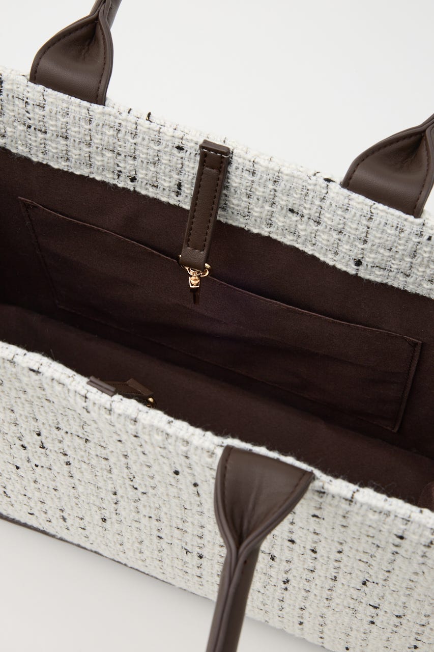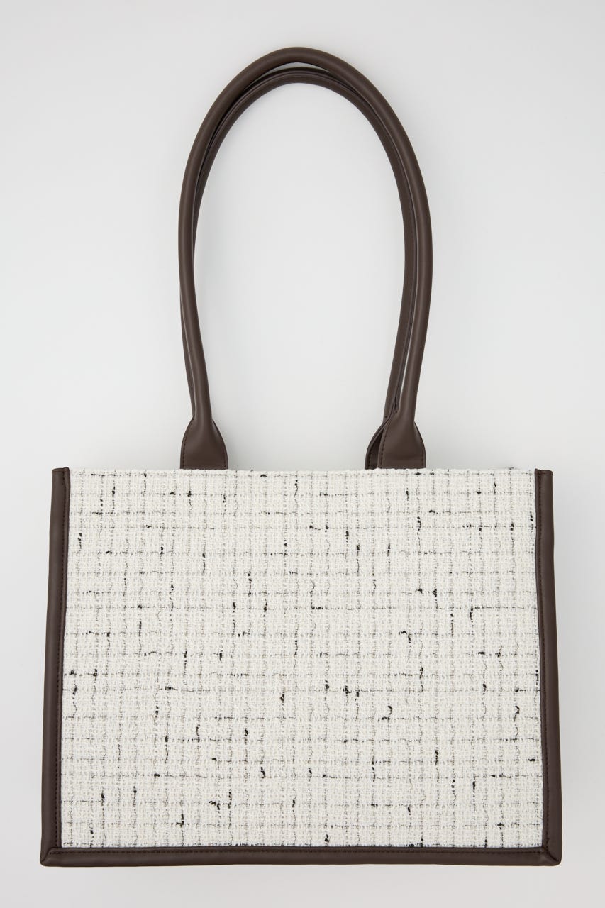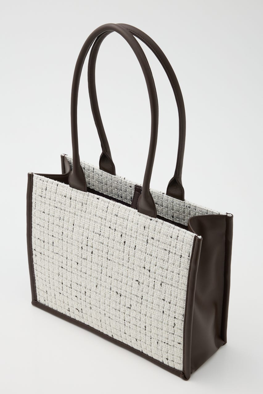 ツイード生地と相性のいいダークブラウンのフェイクレザーが、リッチ感を演出して様々なシーンに溶け込むトートバックに仕上がりました。