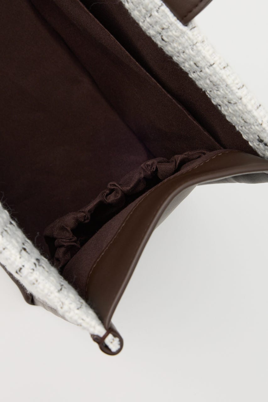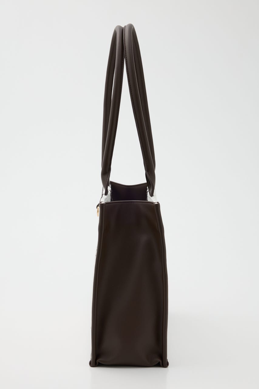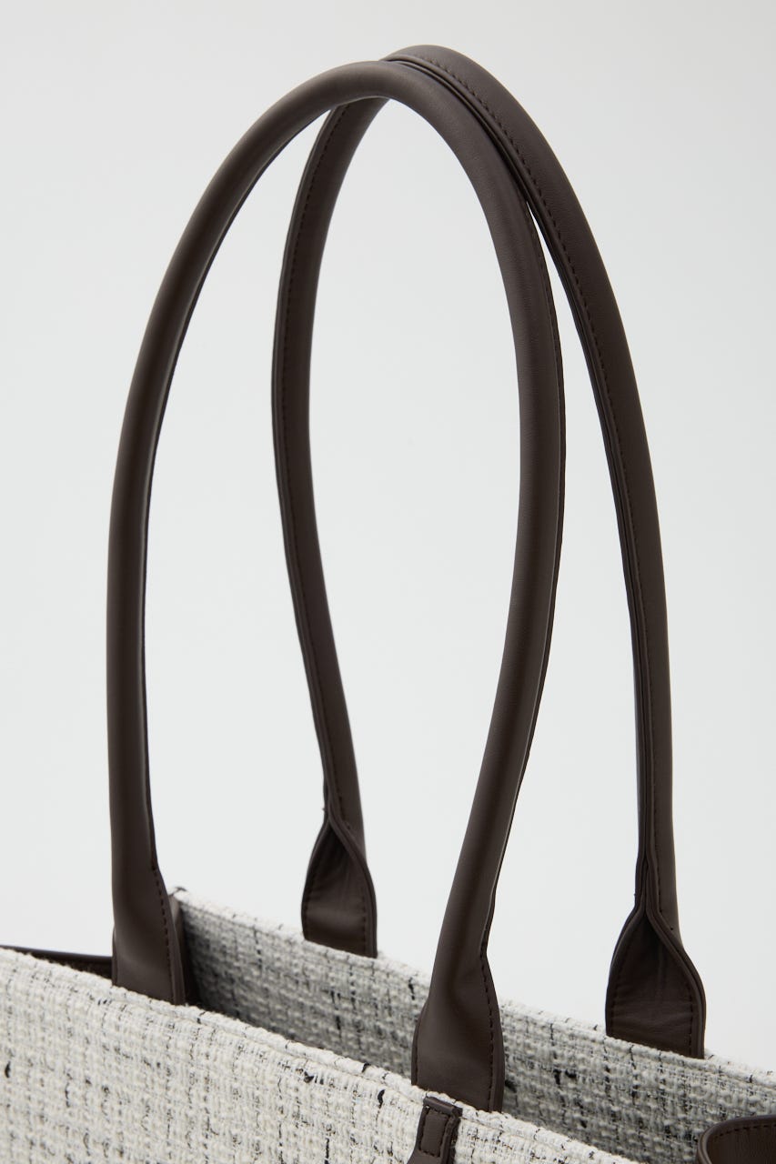 ツイード生地と相性のいいダークブラウンのフェイクレザーが、リッチ感を演出して様々なシーンに溶け込むトートバックに仕上がりました。