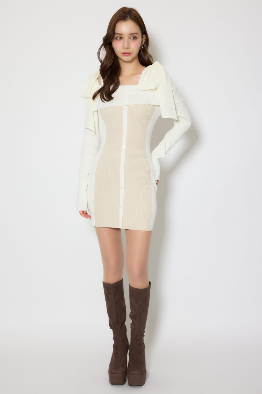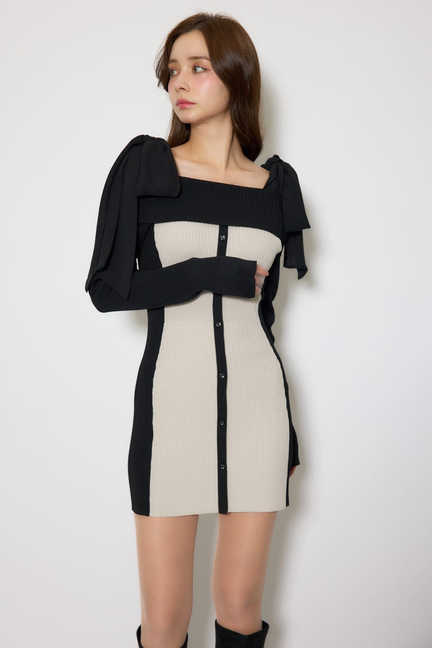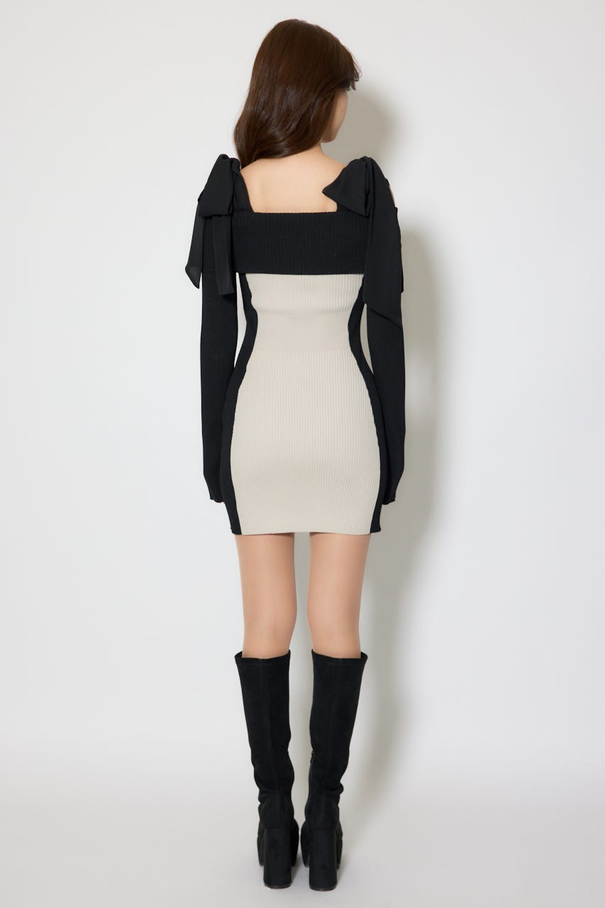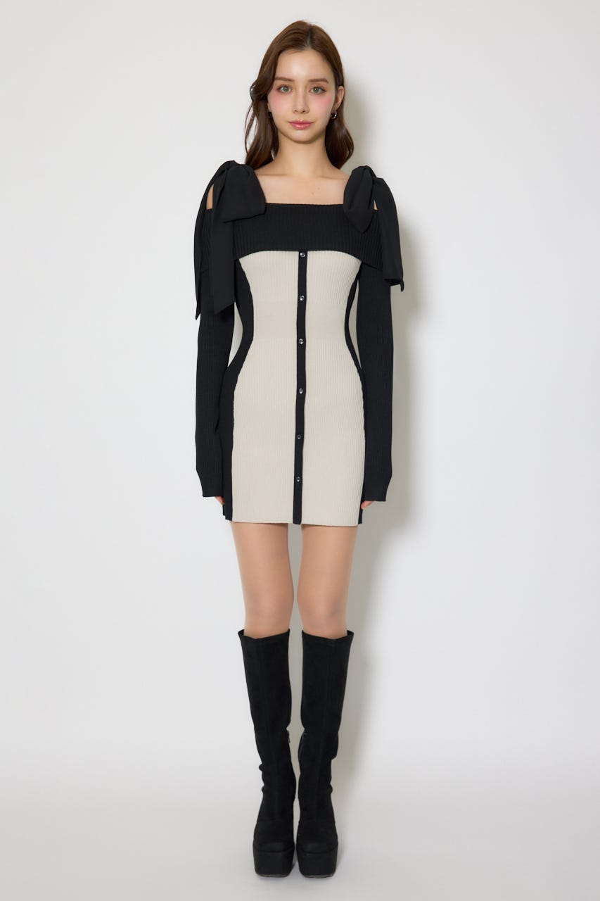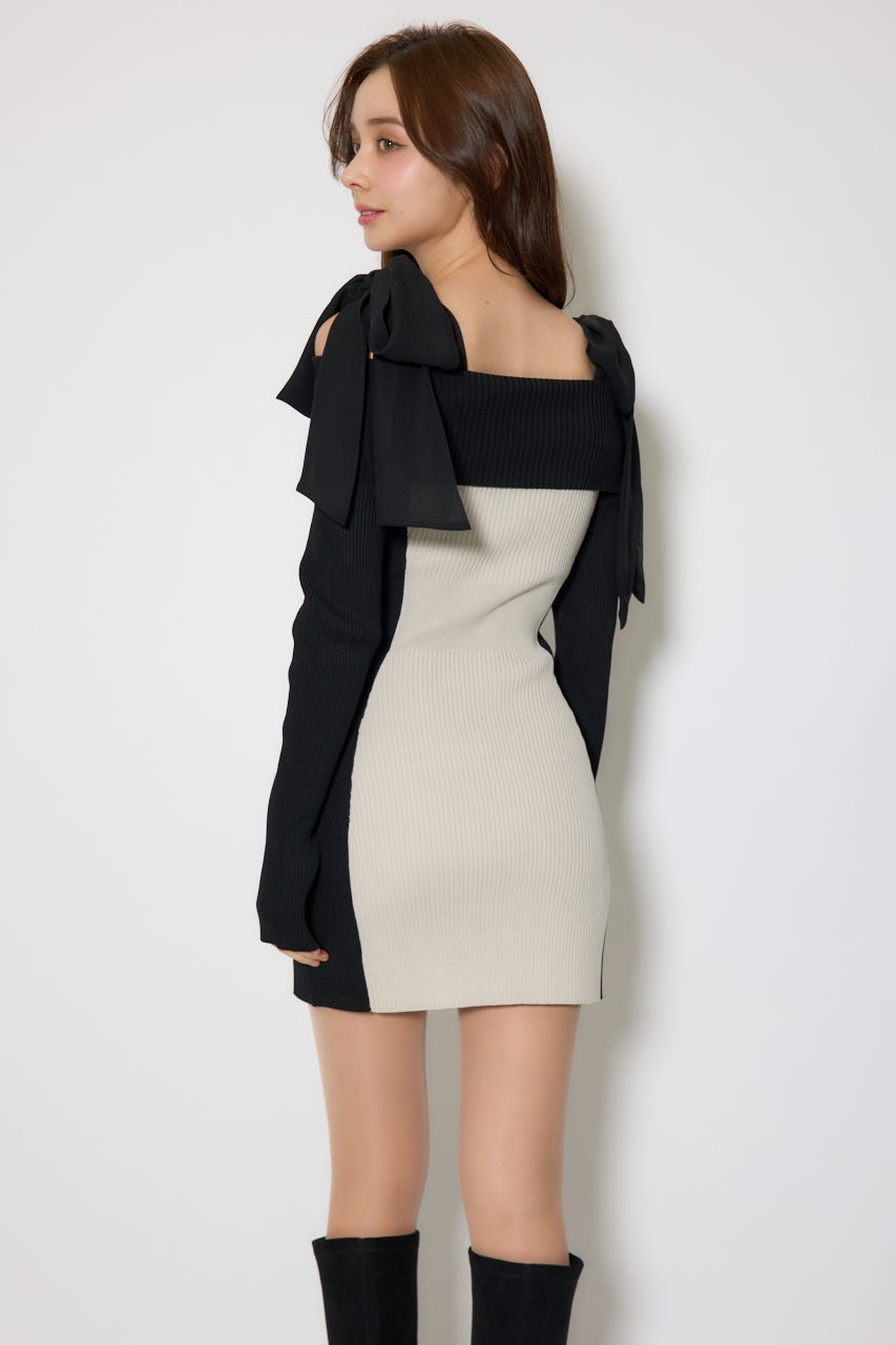 バイカラーオフショルリボンニットミニワンピース